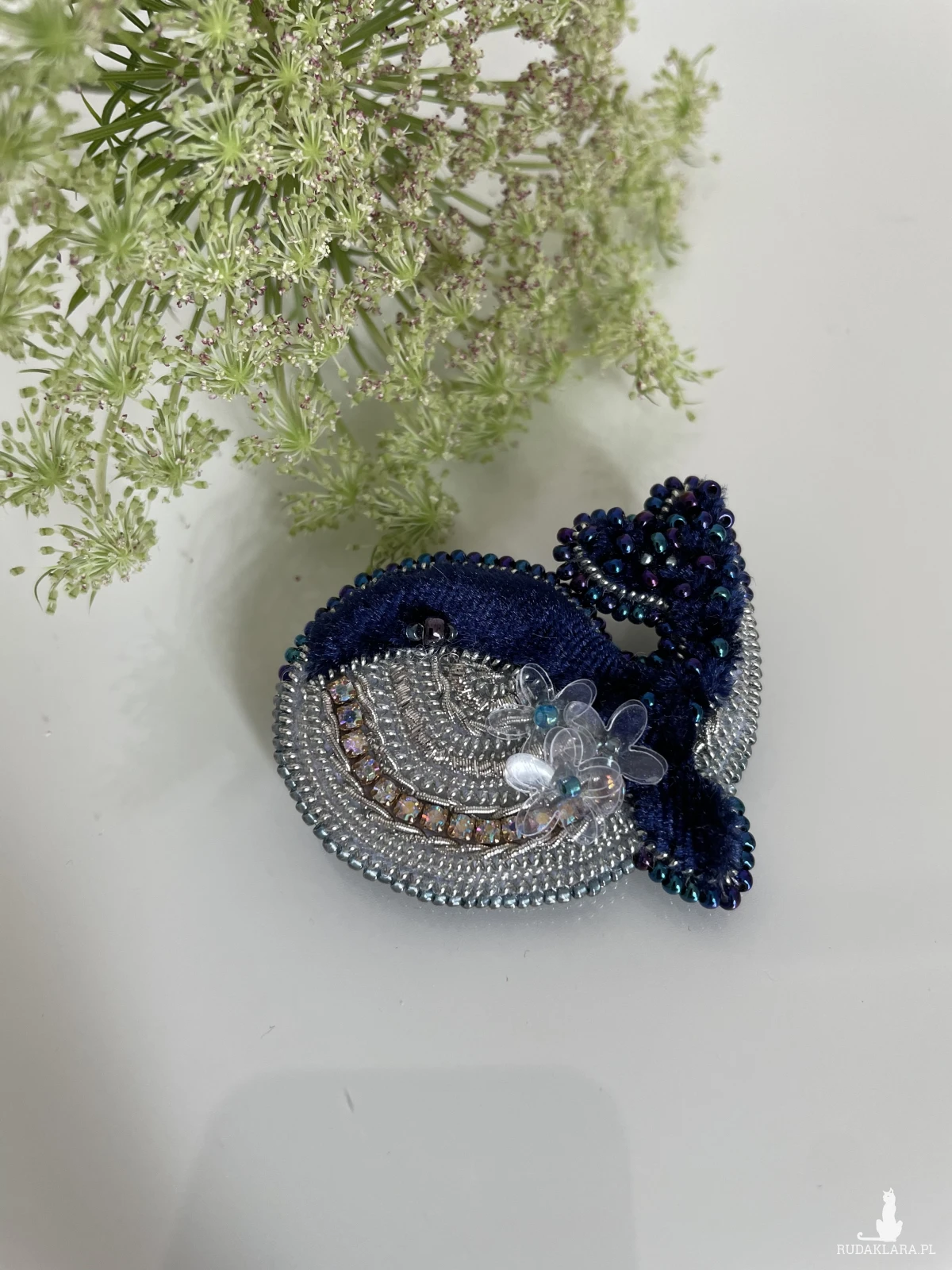 Wyjątkowa, lekka broszka "Wieloryb" w odcieniach granatu i srebra, ręcznie haftowana na filcu. Nie można patrzeć bez uśmiechu na tego uroczego małego wielorybka. Broszka poprawi nastrój właścicielce i wszystkim, którzy na nią spojrzą.