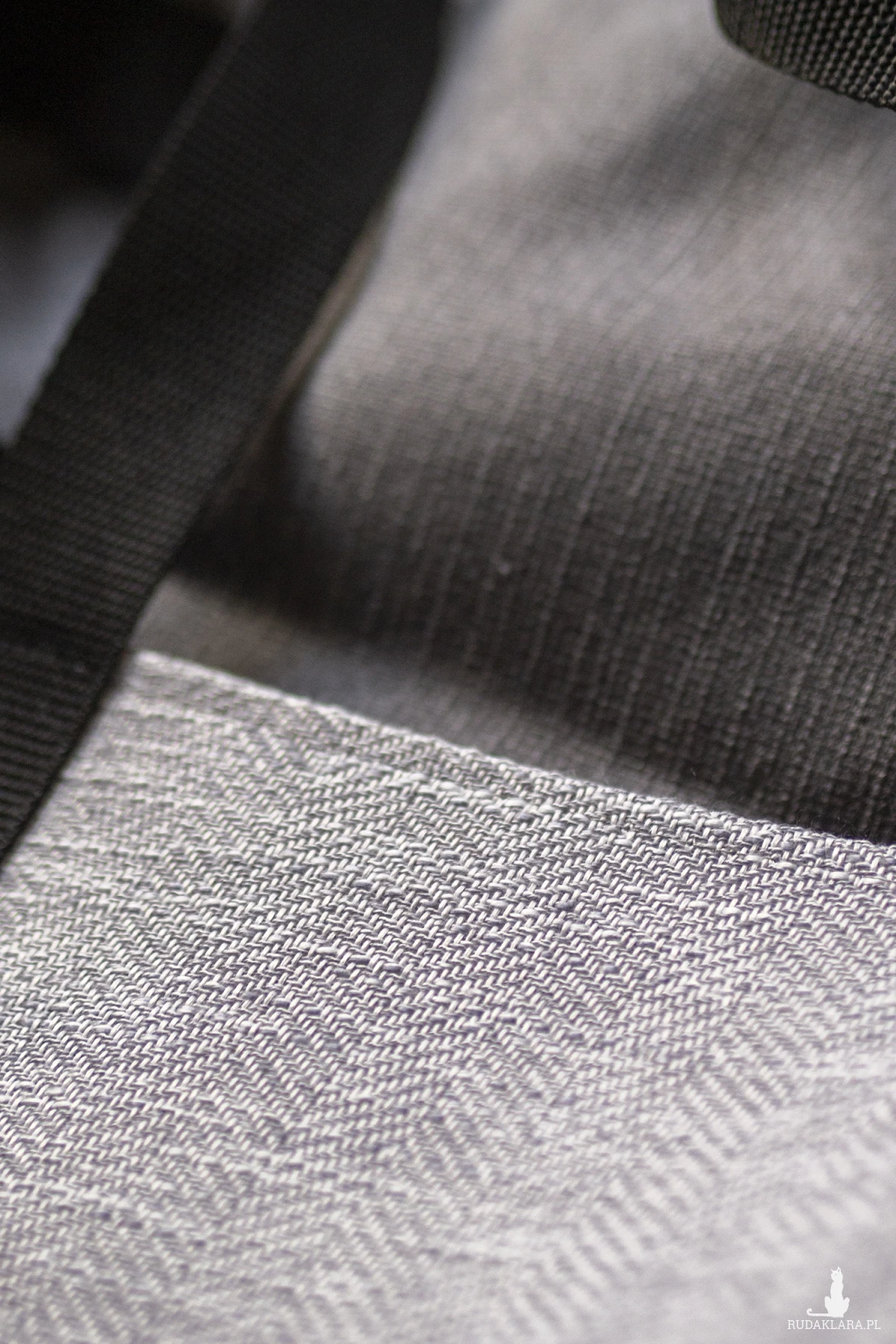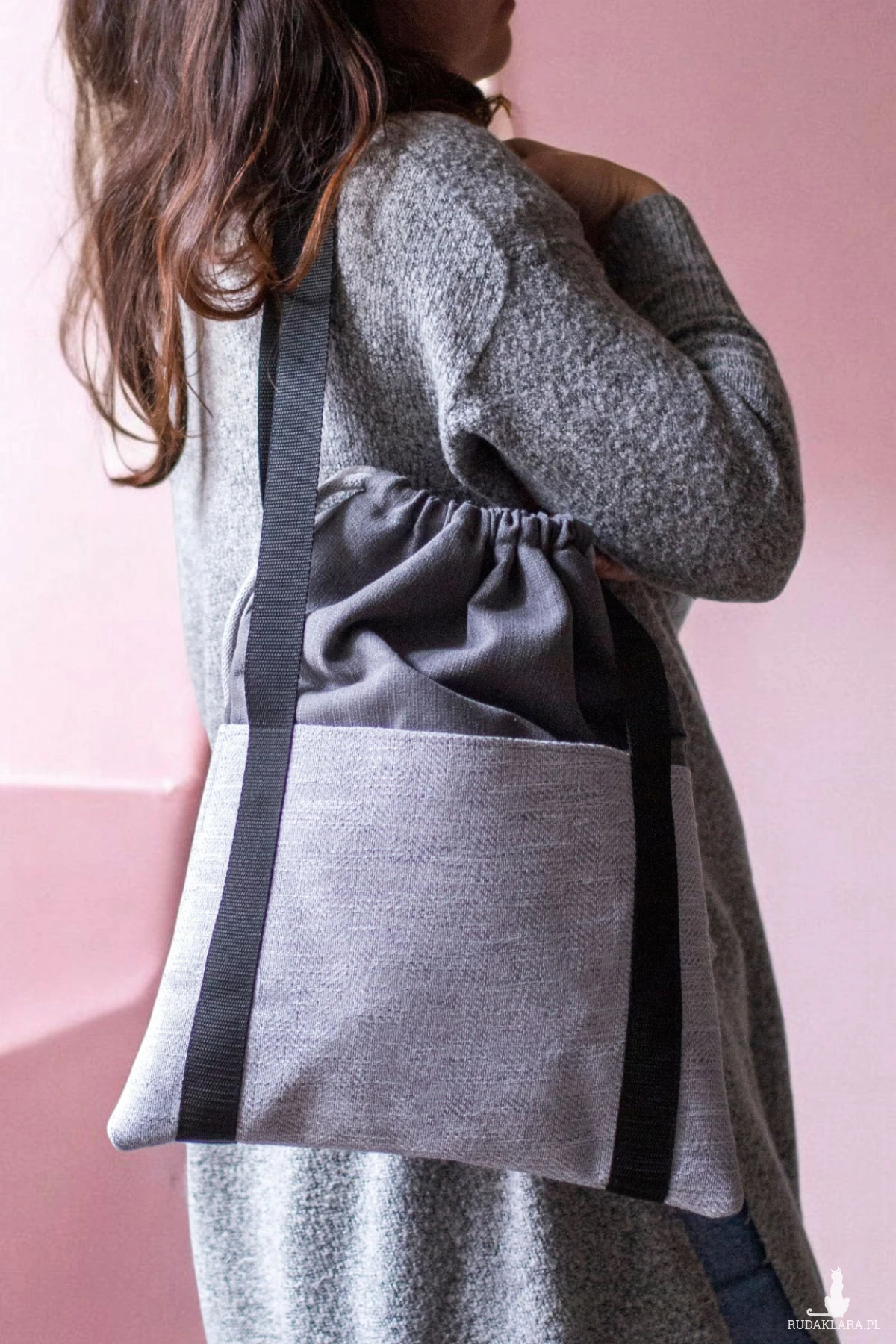 Torba na ramię z kominem, ściągana jak worek, w kolorze szarym. Z przodu i z tyłu torebki duże otwarte kieszenie.