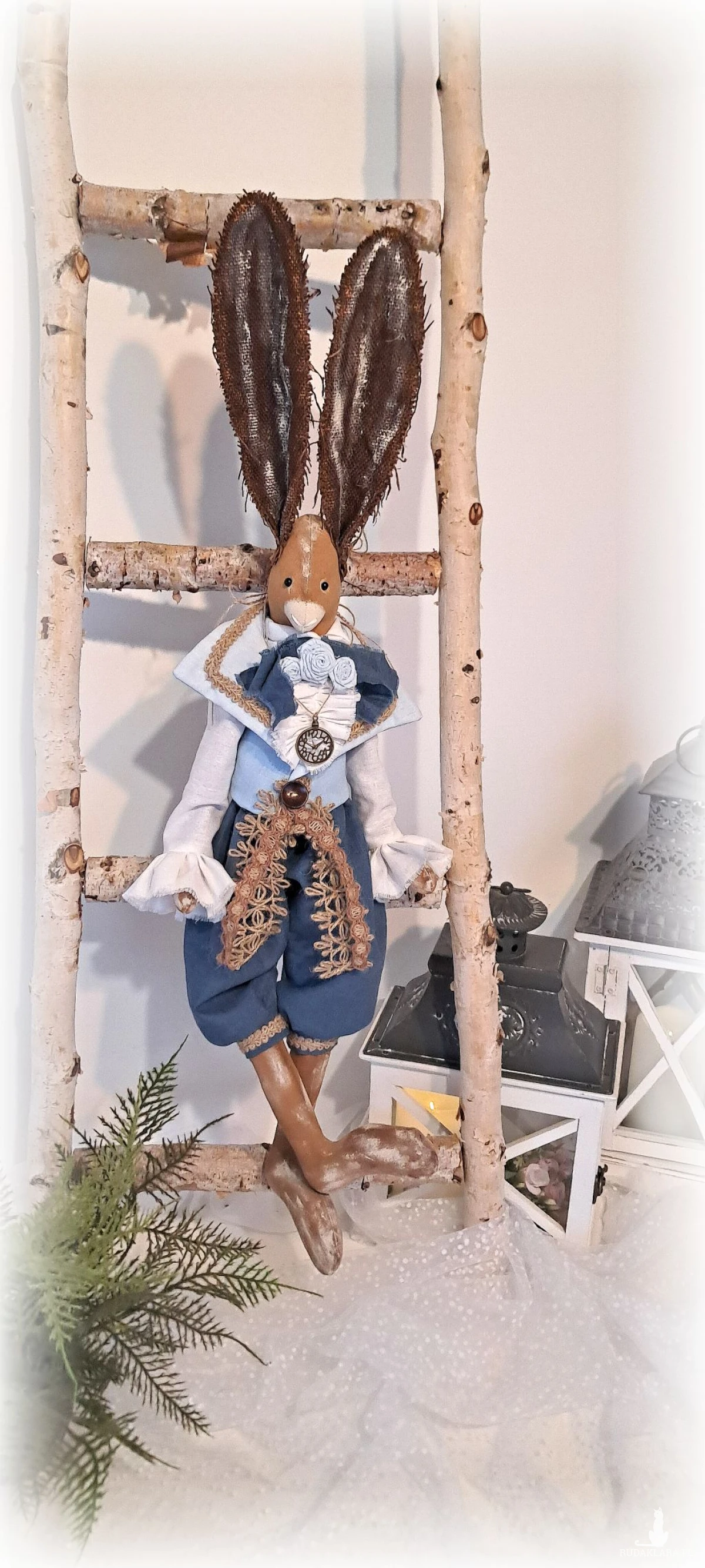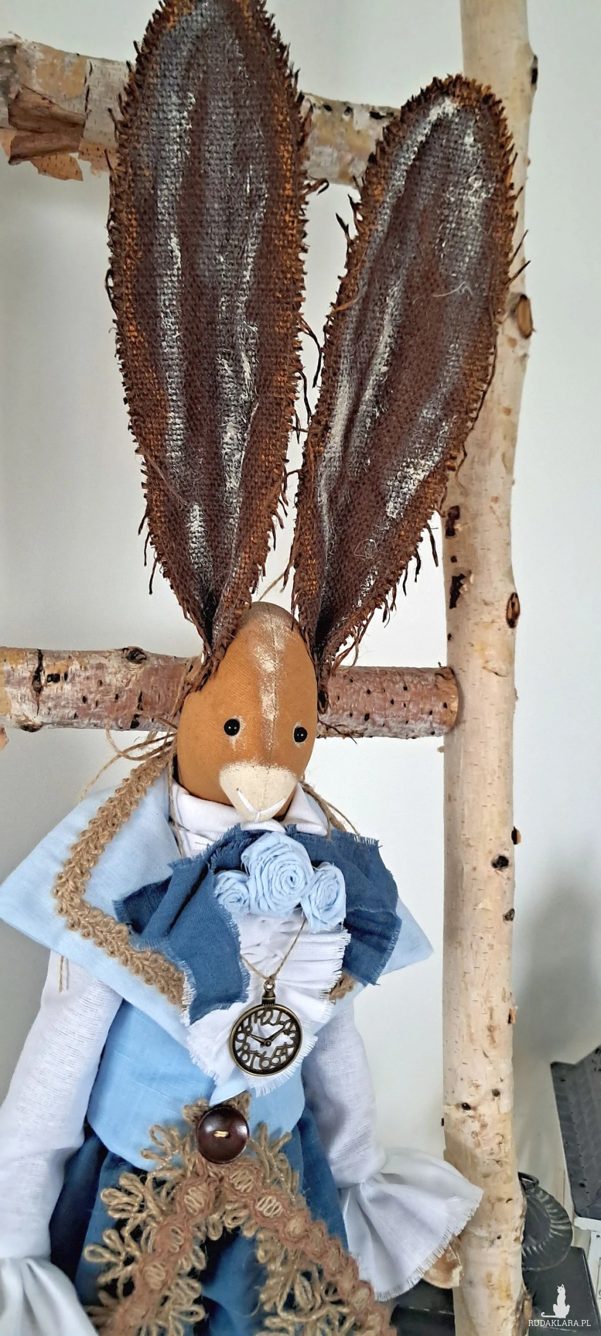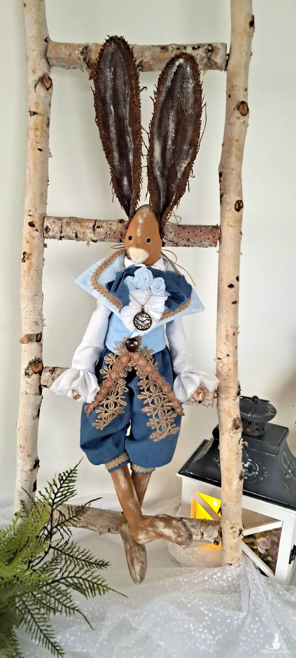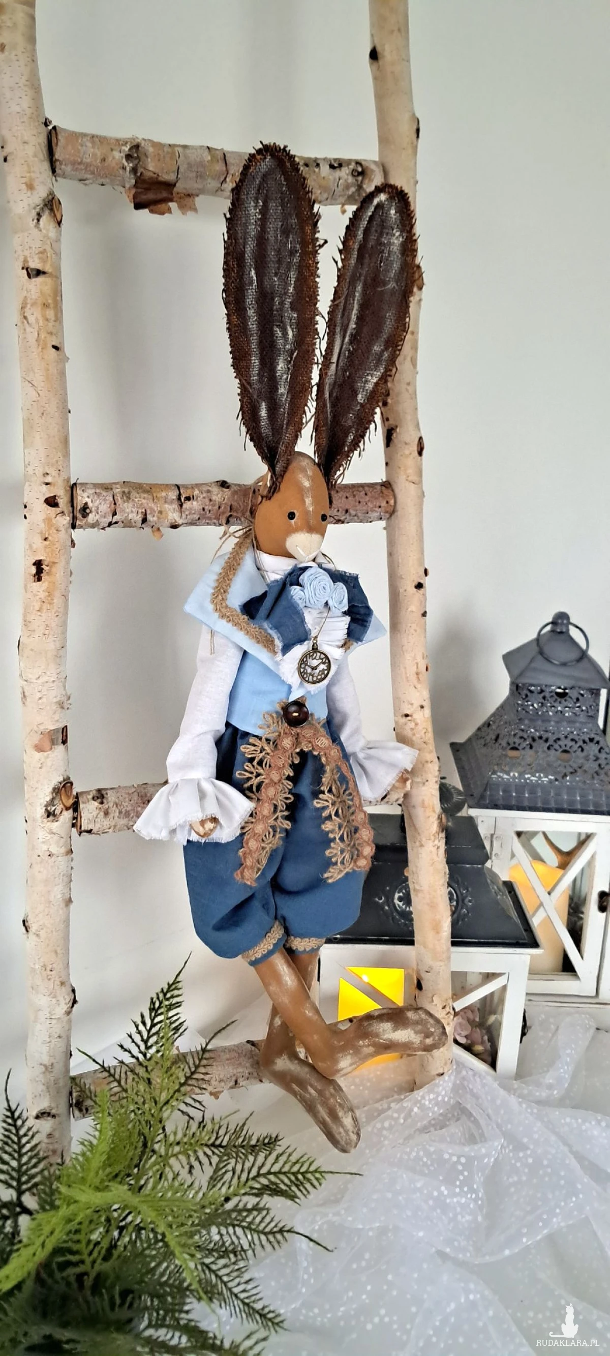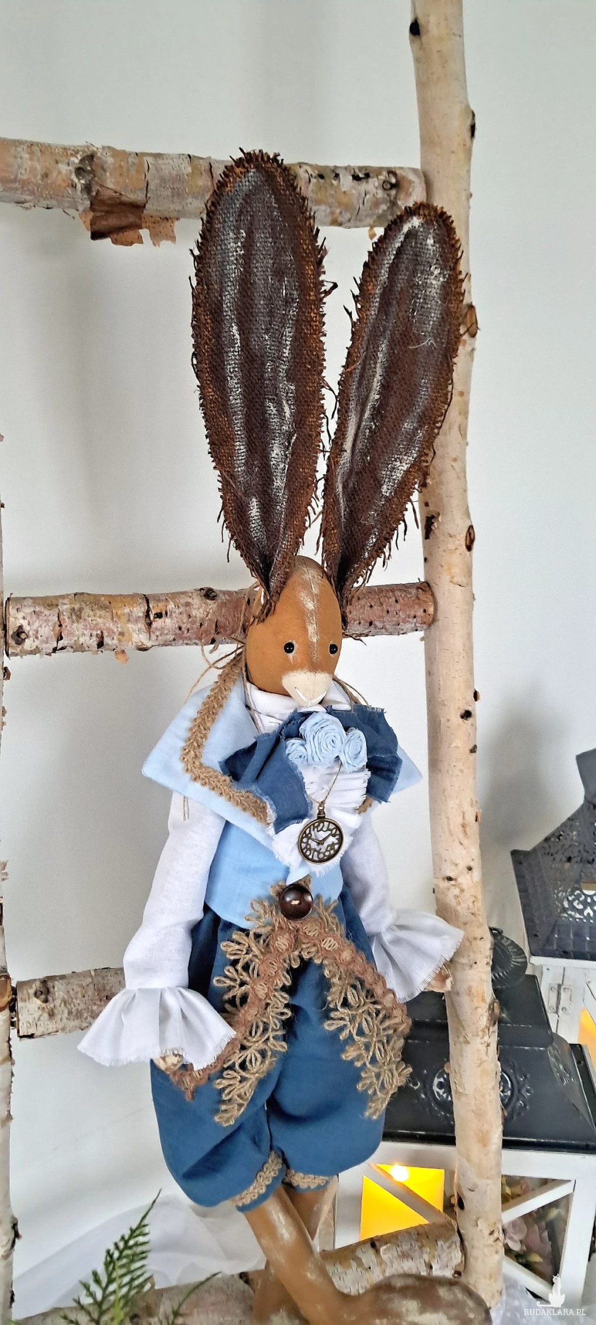 Zajączek Tilda w stylu vintage. Ciałko uszyte z surówki bawełnianej barwionej kawą i farbą akrylową. Wypełnione antyalergiczną kulką silikonową,dokładnie,ze starannością. Ubrany w szerokie marszczone spodnie uszyte ze 100 procentowego lnu koloru morskiego u dołu zakończone mankietami ozdobionymi taśmą jutową. U góry ma koszulę z żabotem z wysokogatunkowej bawełniany koloru bieli z rękawami zakończonym falbanami oraz kamizelkę koloru błękitnego z lnu i bawełny-na kołnierzu przyozdobioną również taśmą jutową oraz drewnianym guzikiem i jutowymi koronkami. Przy kołnierzu koszuli lniana wstążka z bawełnianymi wykonanymi również przeze mnie różyczkami w kolorze błękitu. Uszy brązowe barwione gdzieniegdzie bielą oraz miedzią. Na szyi metalowa imitacja zegarka. Zająca można posadzić lub zawiesić. Wysokość 70 cm. To piękna, nietuzinkowa dekoracja, która ociepli Twoje wnętrze i nadal mu wyjątkowego i niepowtarzalnego charakteru.
