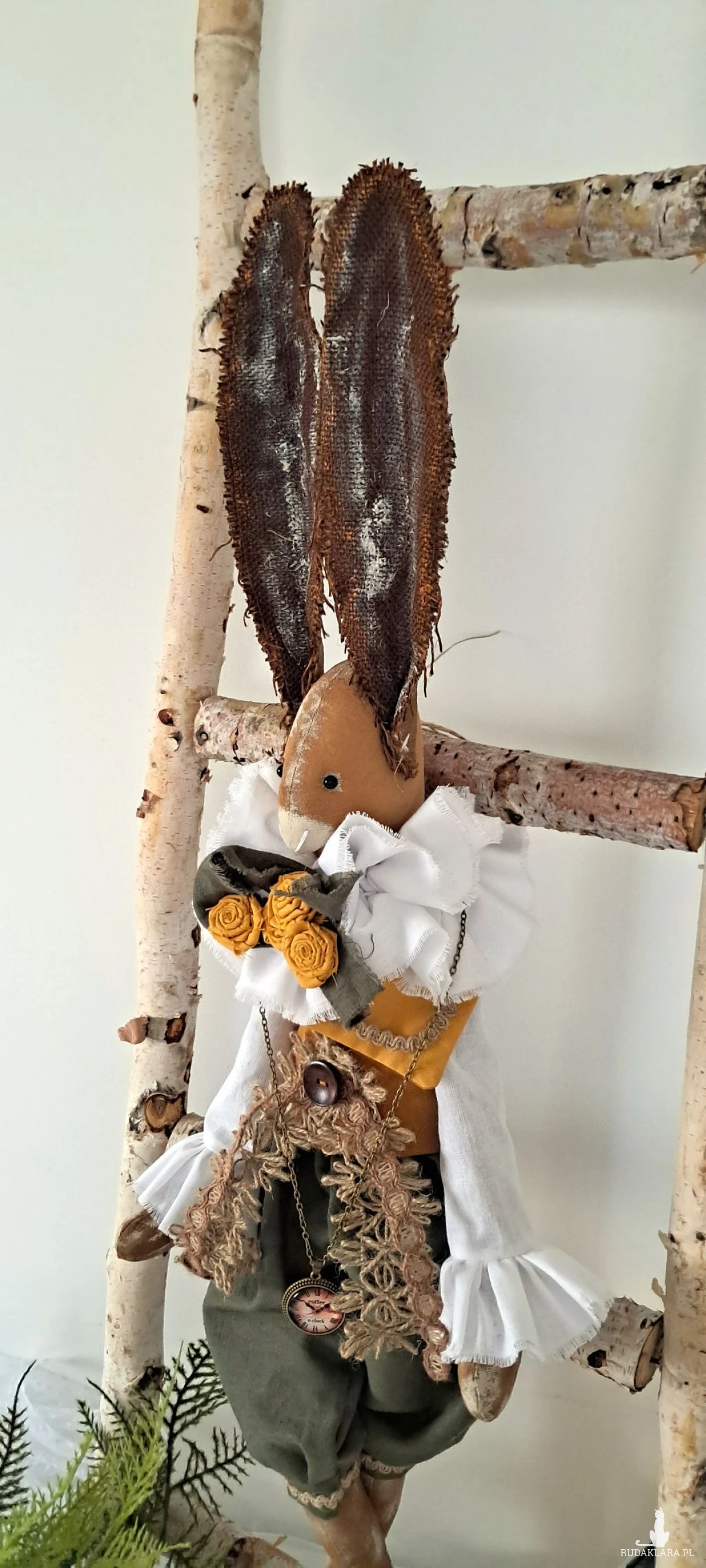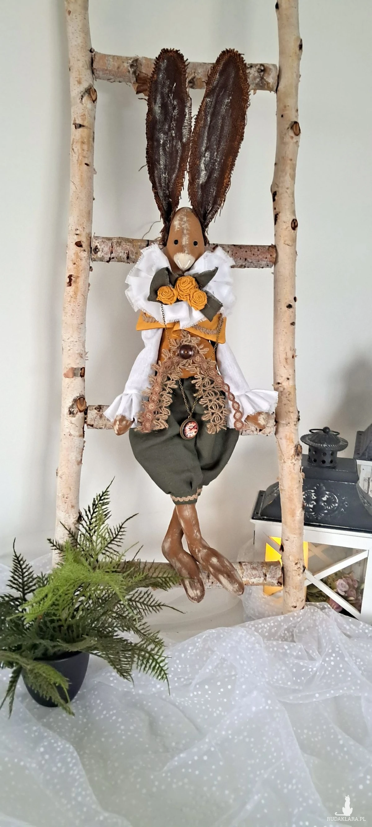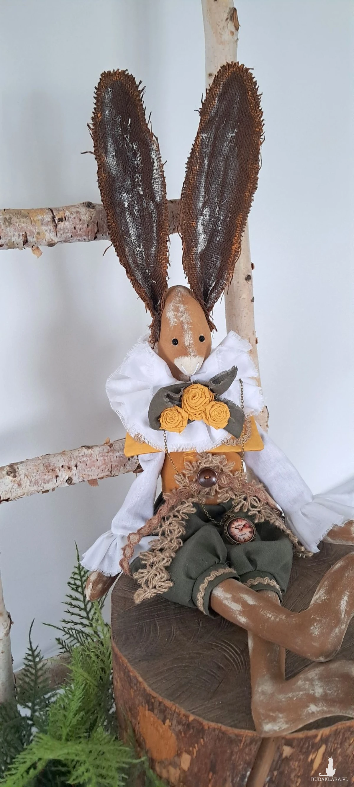 Zajączek Tilda w stylu vintage. Ciałko uszyte z surówki bawełnianej barwionej kawą i farbą akrylową. Wypełnione antyalergiczną kulką silikonową,dokładnie,ze starannością. Ubrany w szerokie marszczone spodnie uszyte ze 100 procentowego lnu koloru khaki u dołu zakończone mankietami ozdobionymi taśmą jutową. U góry ma koszulę z falbaniastym kołnierzem z wysokogatunkowej bawełniany koloru bieli z rękawami zakończonym falbanami oraz kamizelkę koloru musztardy z lnu i bawełny-na kołnierzu przyozdobioną również taśmą jutową oraz drewnianym guzikiem i jutowymi koronkami. Przy falbaniastym kołnierzu koszuli lniana wstążka koloru khaki z bawełnianymi wykonanymi również przeze mnie różyczkami w kolorze musztardy. Uszy brązowe barwione gdzieniegdzie bielą oraz miedzią. Na szyi metalowa imitacja zegarka na łańcuszku. Zająca można posadzić lub zawiesić. Wysokość 70 cm. To piękna, nietuzinkowa dekoracja, która ociepli Twoje wnętrze i nadal mu wyjątkowego i niepowtarzalnego charakteru.