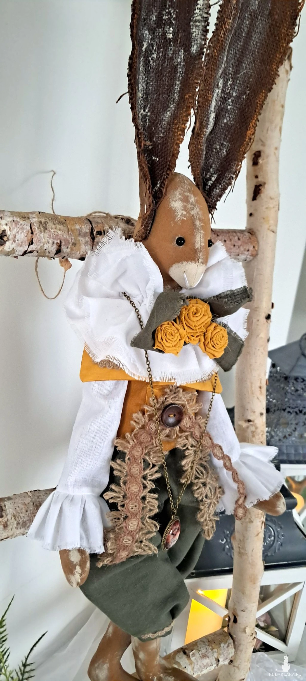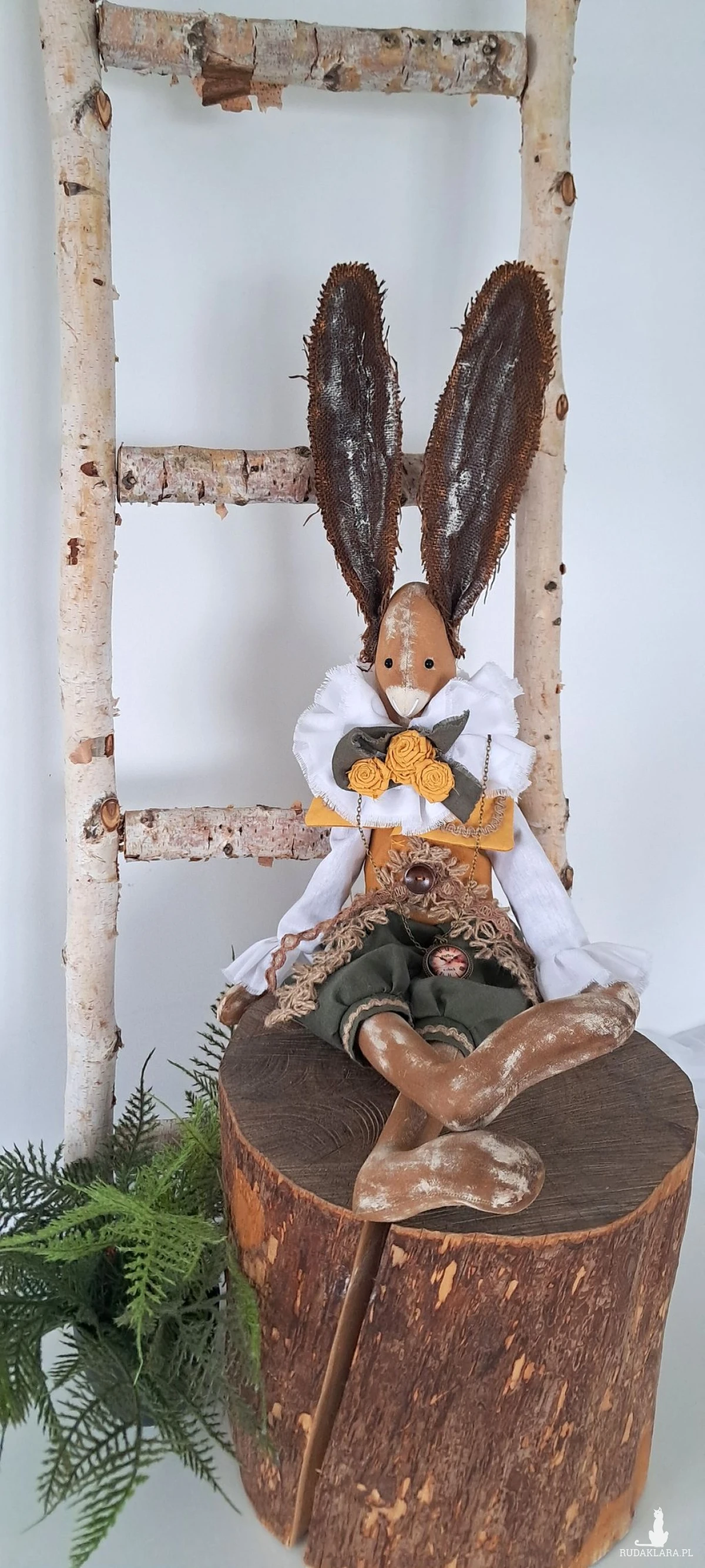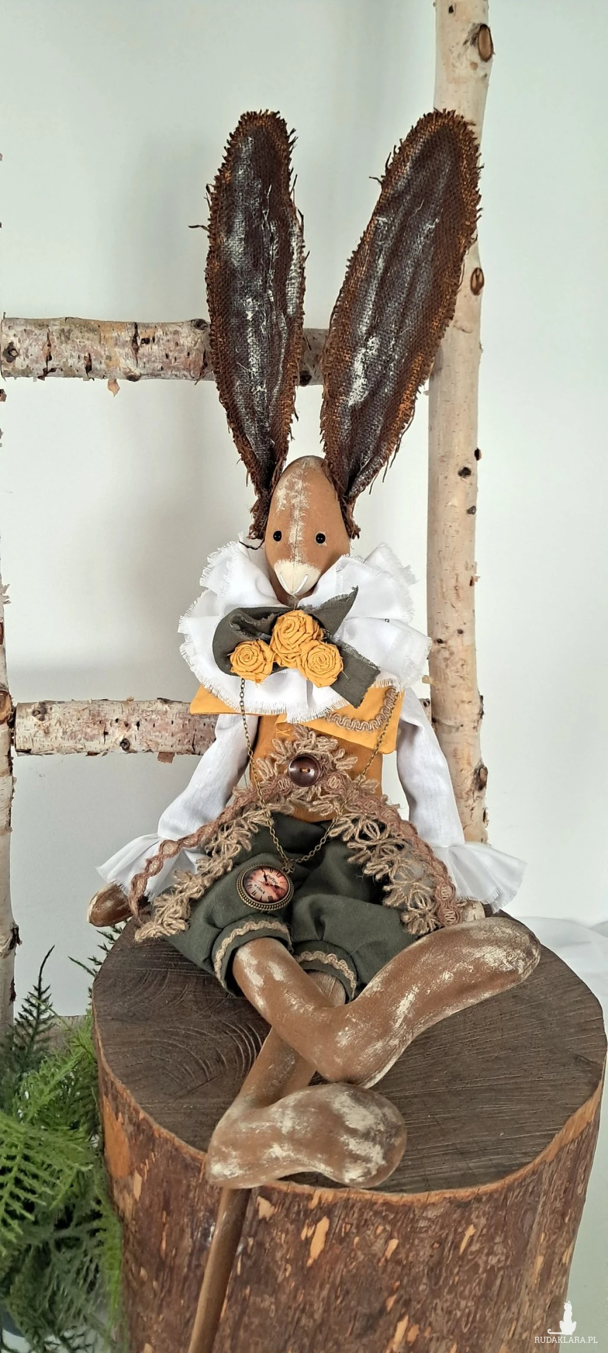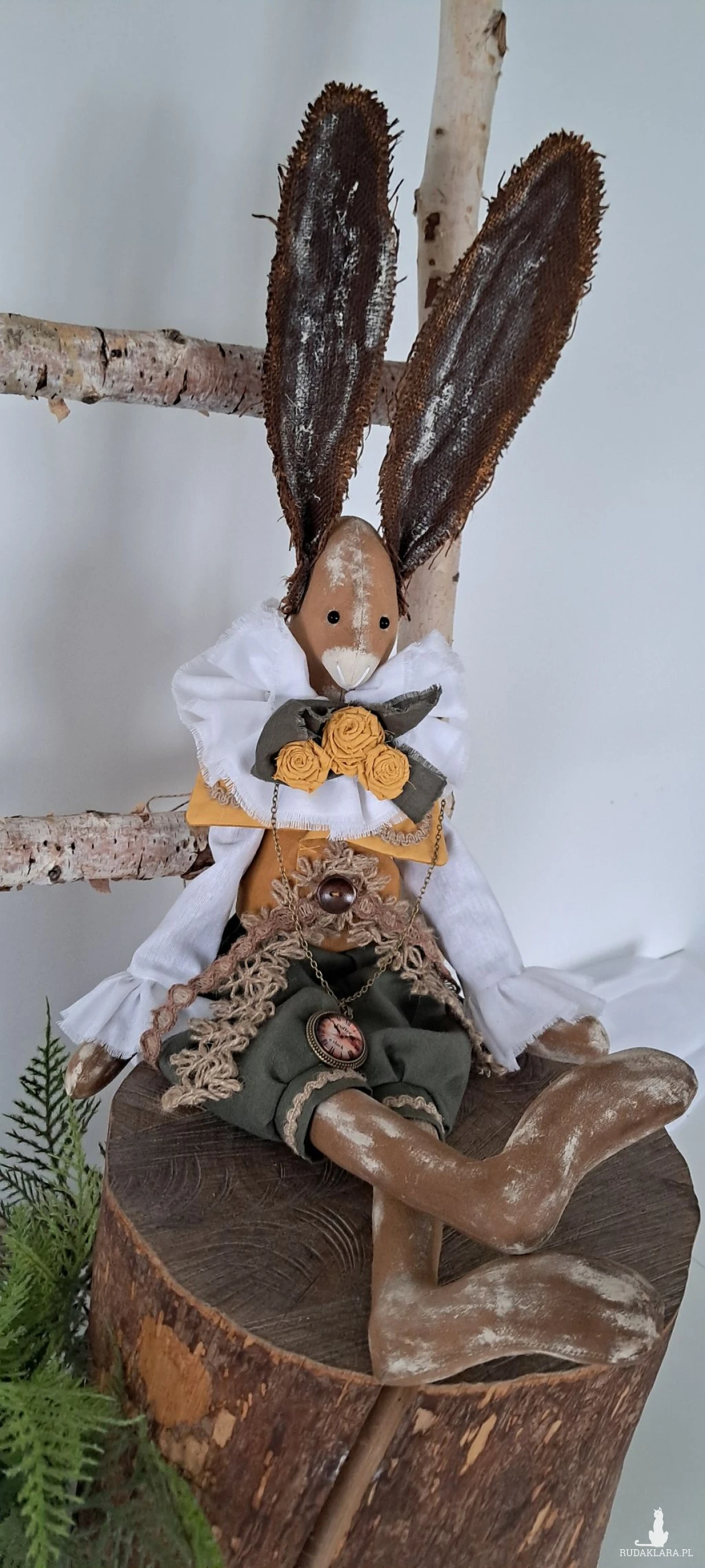 Zajączek Tilda w stylu vintage. Ciałko uszyte z surówki bawełnianej barwionej kawą i farbą akrylową. Wypełnione antyalergiczną kulką silikonową,dokładnie,ze starannością. Ubrany w szerokie marszczone spodnie uszyte ze 100 procentowego lnu koloru khaki u dołu zakończone mankietami ozdobionymi taśmą jutową. U góry ma koszulę z falbaniastym kołnierzem z wysokogatunkowej bawełniany koloru bieli z rękawami zakończonym falbanami oraz kamizelkę koloru musztardy z lnu i bawełny-na kołnierzu przyozdobioną również taśmą jutową oraz drewnianym guzikiem i jutowymi koronkami. Przy falbaniastym kołnierzu koszuli lniana wstążka koloru khaki z bawełnianymi wykonanymi również przeze mnie różyczkami w kolorze musztardy. Uszy brązowe barwione gdzieniegdzie bielą oraz miedzią. Na szyi metalowa imitacja zegarka na łańcuszku. Zająca można posadzić lub zawiesić. Wysokość 70 cm. To piękna, nietuzinkowa dekoracja, która ociepli Twoje wnętrze i nadal mu wyjątkowego i niepowtarzalnego charakteru.