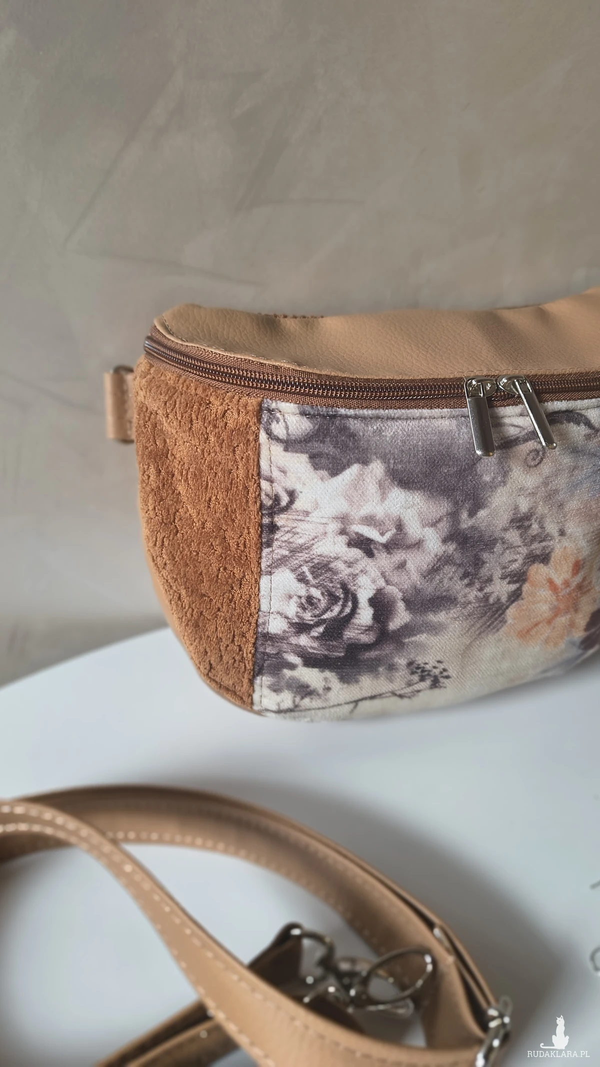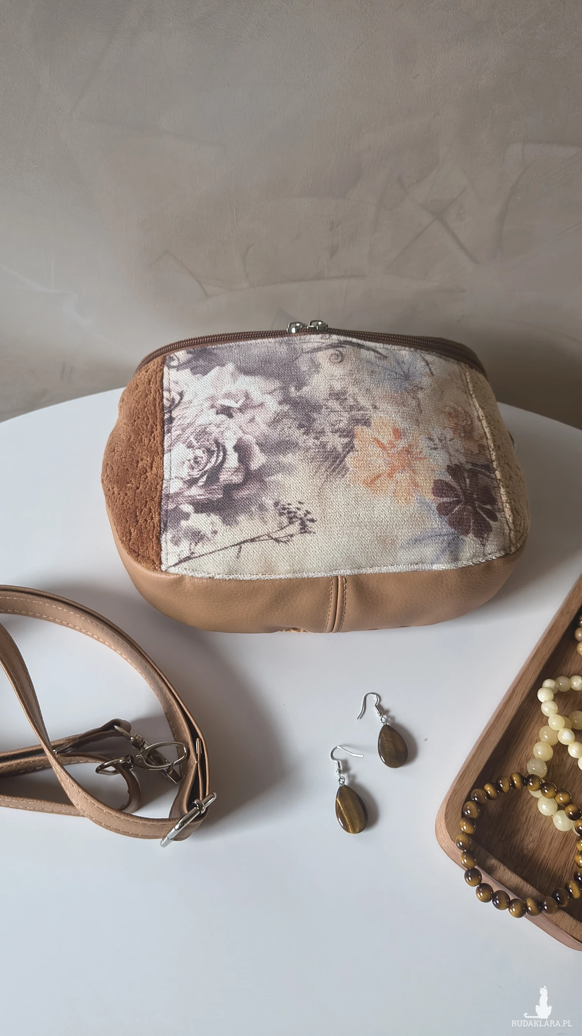 Torebka wykonana z materiałów tapicerskich i ekoskóry w odcieniach beżu i karmelu. Wewnątrz znajduje się wodoodporna, podszewka z kieszonką na zamek. Pasek wykonany z ekoskóry, regulowany. Okucia w kolorze srebrnym.