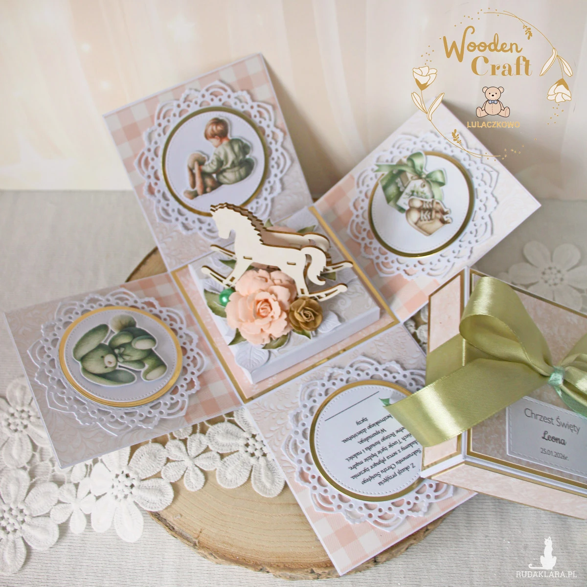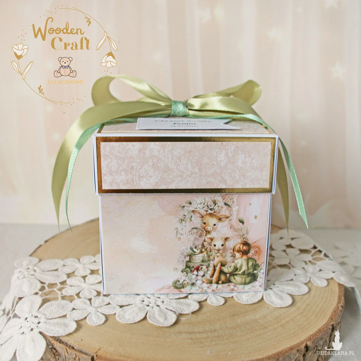 Przepiękna pamiątka chrztu świętego, roczku bądź narodzin, w formie exploding boxu utrzymanego w pięknych odcieniach brzoskwini, zgaszonej zieleni i bieli z dodatkiem złoych, błyszczących akcentów. Pudełeczko wykonane z mixu dziecięcych kolekcji papierów. Wieczko ozdobione zieloną kokardą oraz tagiem z imieniem dziecka i datą chrztu/narodzin/roczku - w zależności od okazji.