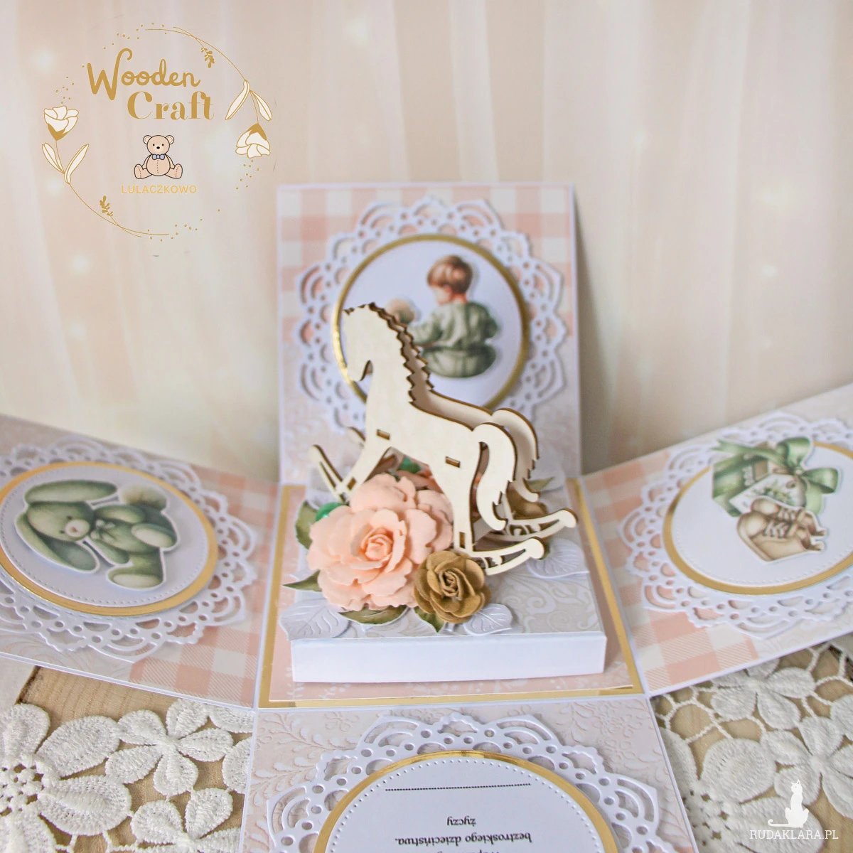 W środku boxa znajduje prześliczna tekturka 3D - konik na biegunach, ozdobiony ręcznie robionymi kwiatami. Na ściankach boxa umieszczone zostały słodkie grafiki przedstawiające małego, uroczego chłopczyka z przytulanką, pluszowego króliczka, oraz chłopięce bucki i prezent, a także życzenia. Pod tekturką 3D znajduje się mini pudełeczko, do którego można włożyć prezent pieniężny.