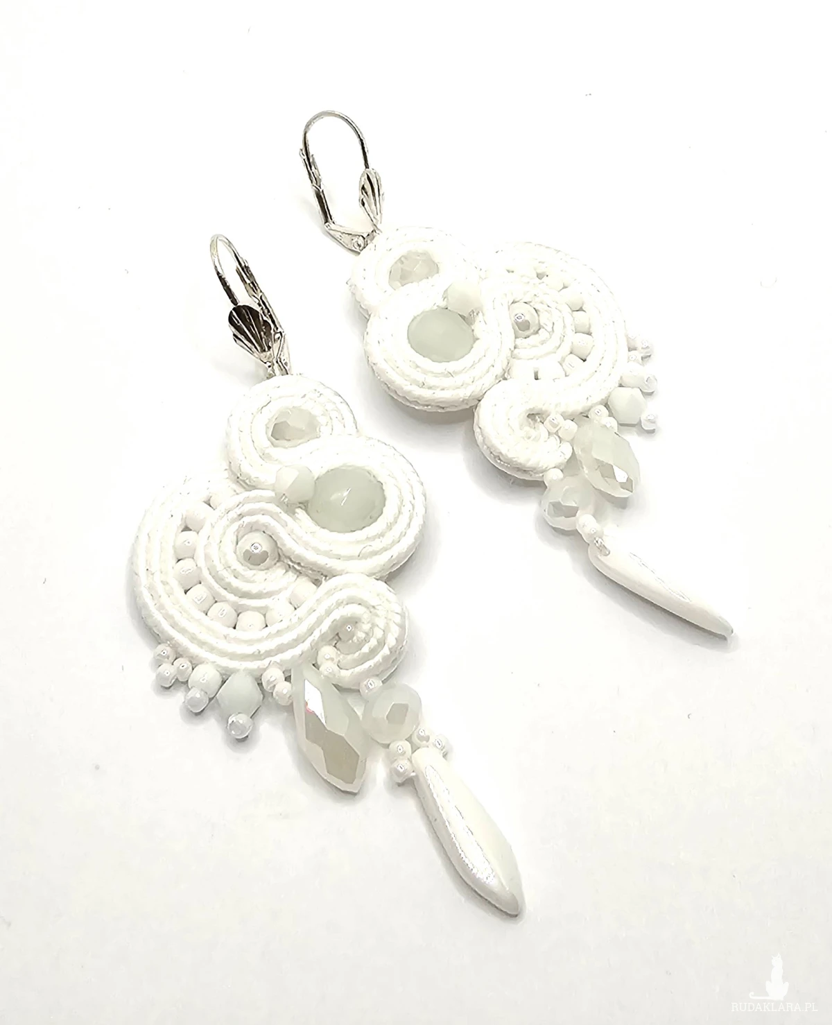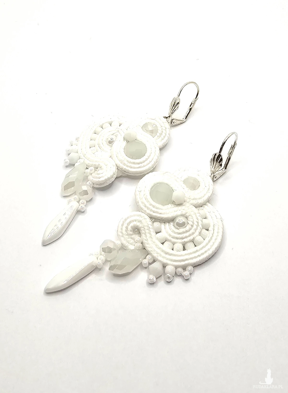Białe szklane kulki otoczone polskimi sznurkami sutasz oraz szklanymi czeskimi i japońskimi koralikami o rożnych kształtach i wielkościach. Dół kolczyków zdobią szklane wiszące koraliki w kolorze perłowym oraz szklane kryształki. Kolczyki zawieszone na ozdobnych biglach angielskich w kolorze srebrnym.