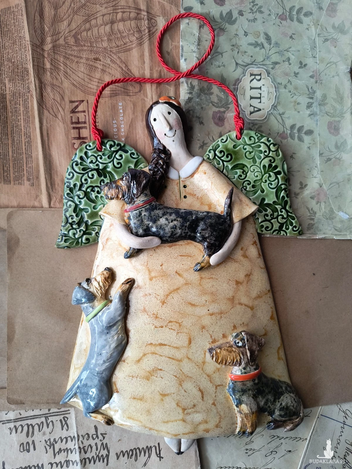 Uroczy aniołek ceramiczny wykonany z gliny szamotowej, wypalony na biskwit, a następnie szkliwiony w temperaturze 1260 stopni C. Wymiary ok 18,5 cm x 24,5 cm. Do powieszenia na ścianie na ozdobnym sznureczku. Idealny jako prezent okolicznościowy lub do ozdoby domu.