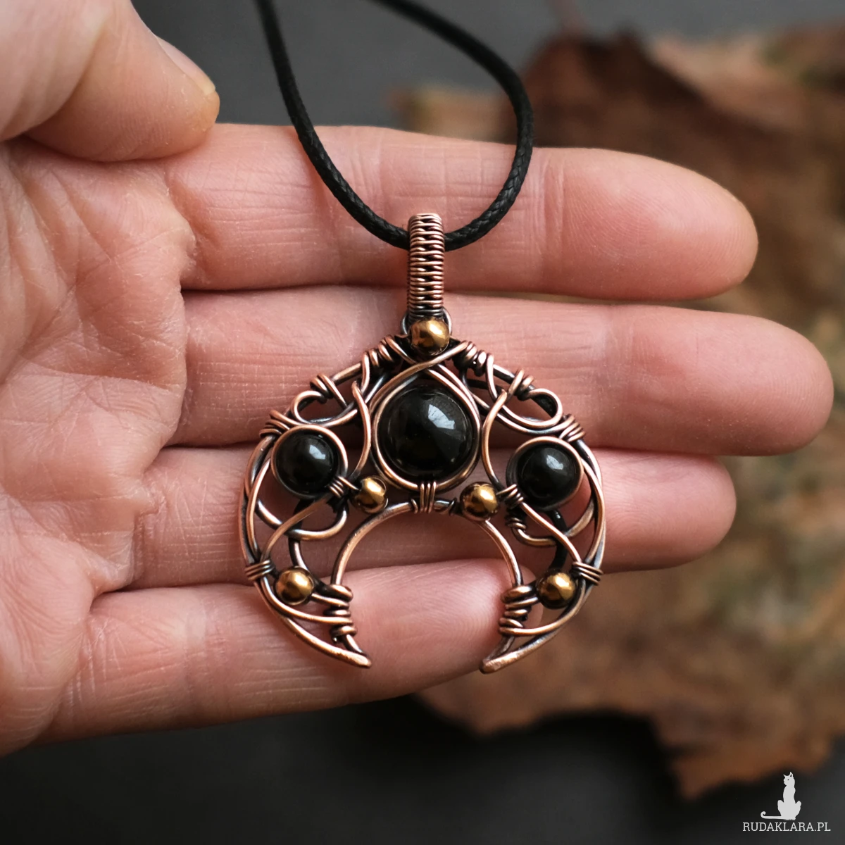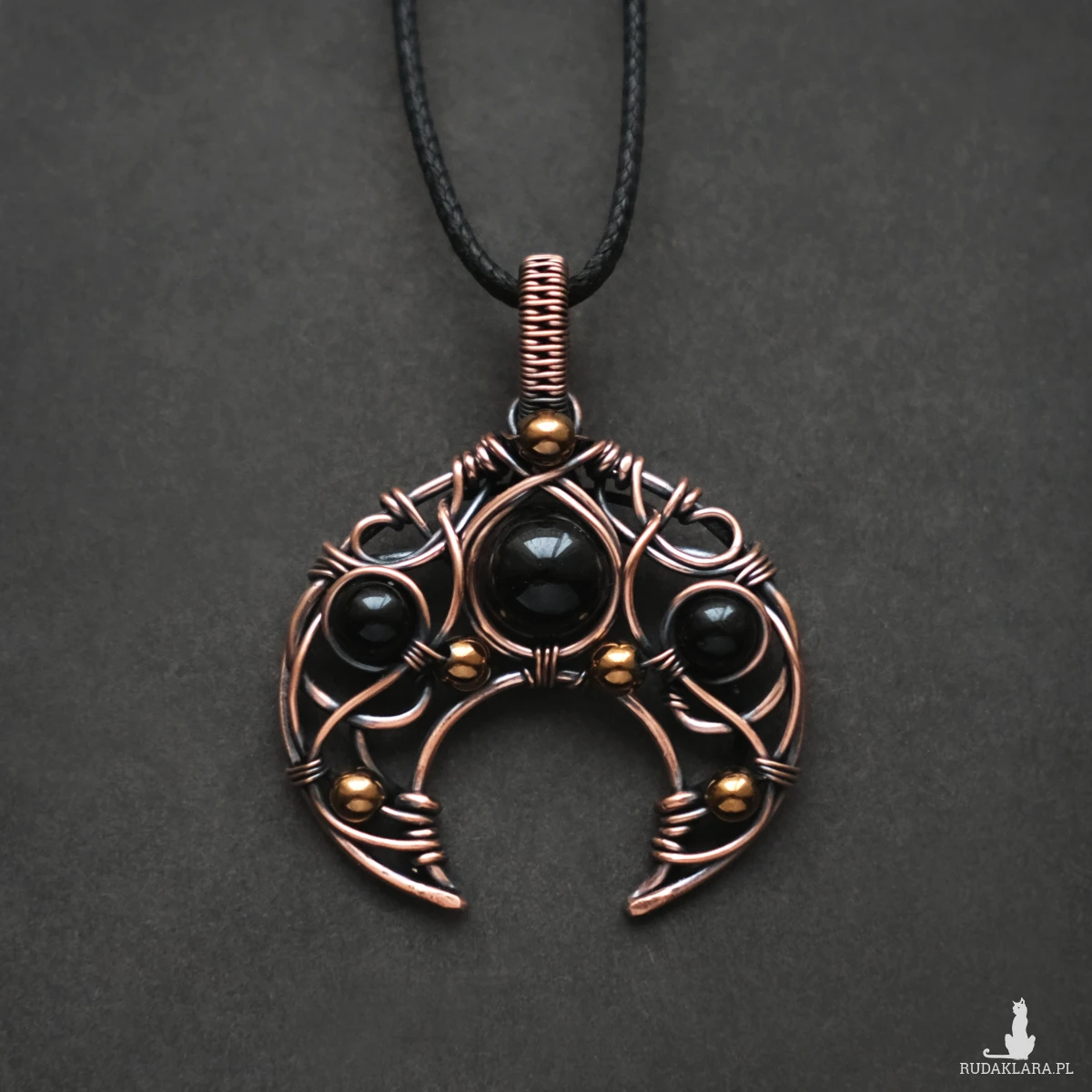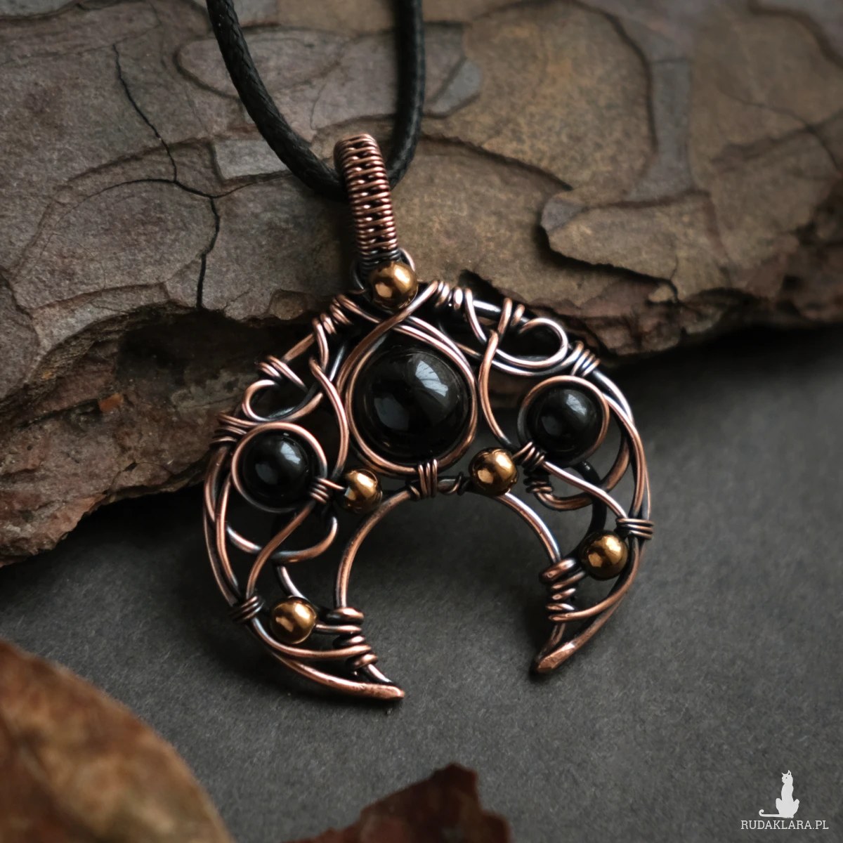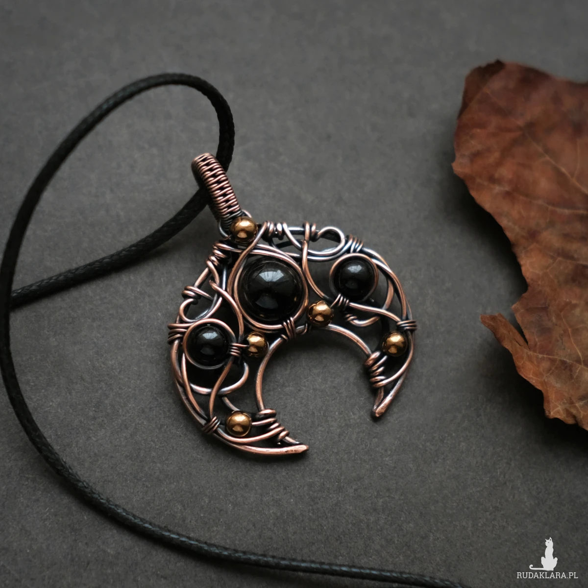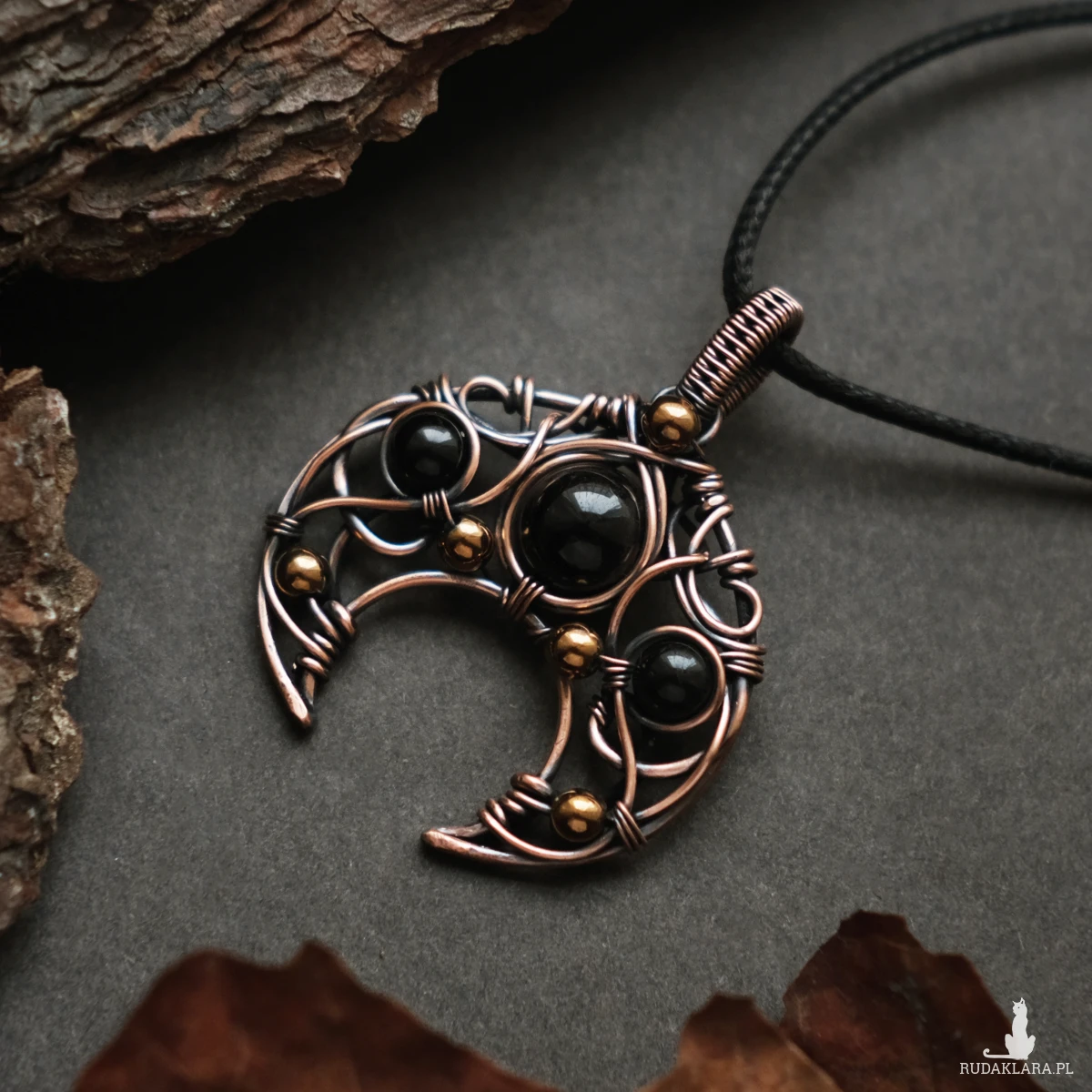 Miedziany wisiorek - księżyc z kamieniami czarnego turmalinu oraz złotego hematytu. Piękne fantazyjne sploty dodają mu baśniowego charakteru.