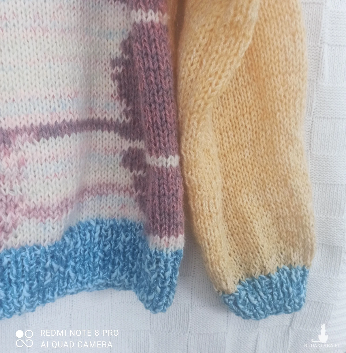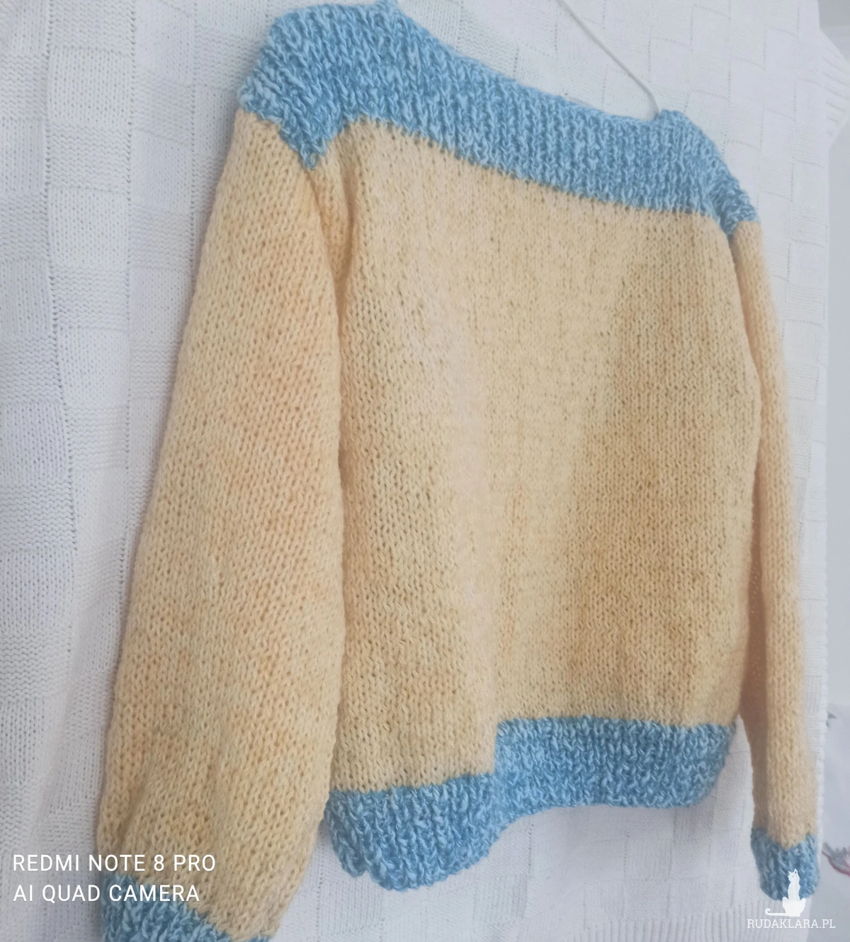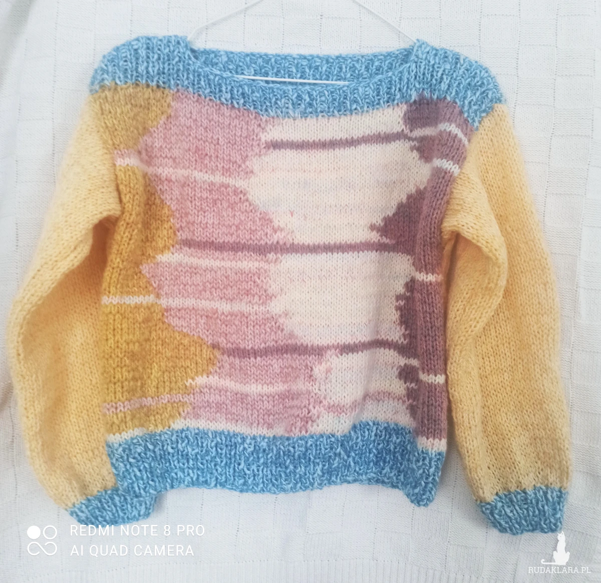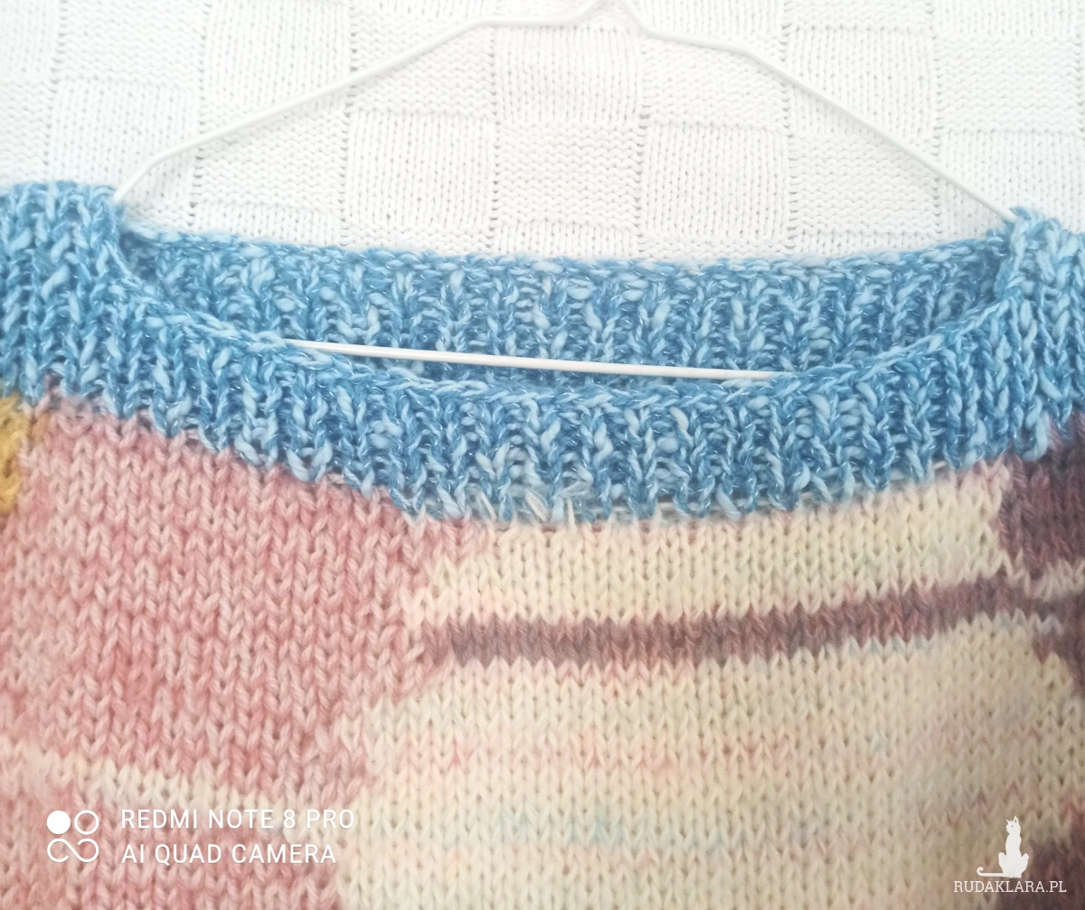 Sweter pod szyję płytkie karo, kolorowy oversize z długimi szerokimi rękawami. Bardzo lekki, wykonany ręcznie na drutach. Wykonany z nowej wełny i włóczki wielokolorowej, zastosowałam fantazyjne połączenia, czego efektem jest niepowtarzalność sweterka. Przód wielokolorowy, tył w odcieniu żółtego. Całość zamykają niebieskie pliski na dole w ściągaczu/1 na 1 oczko lewe i prawe/ sweterka i rękawach oraz na ramionach i przy szyi. Zastosowane karo przy dekolcie pozwala odkryć ramię. Całość wykonana oczkami prawymi. Jest miły w dotyku, nie drapie. Przewiewny , z tych dosyć krótkich, szeroki. Można nosić bez koszulki. Świetna propozycja dla nastolatek. Opadające ramiona przedłużają długość rękawa. Rękawy dosyć szerokie i długie. Wspaniały look do spódnicy i spodni, stanowi elegancką kompozycję. W rzeczywistości wygląda zdecydowanie lepiej. Pranie ręczne w kąpieli do 30 stopni.