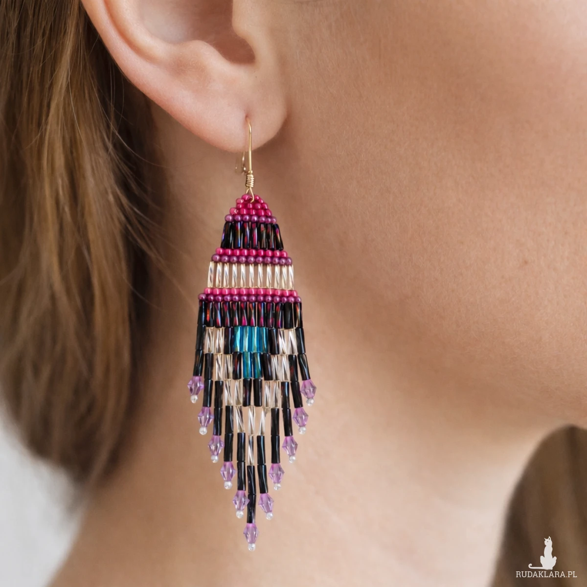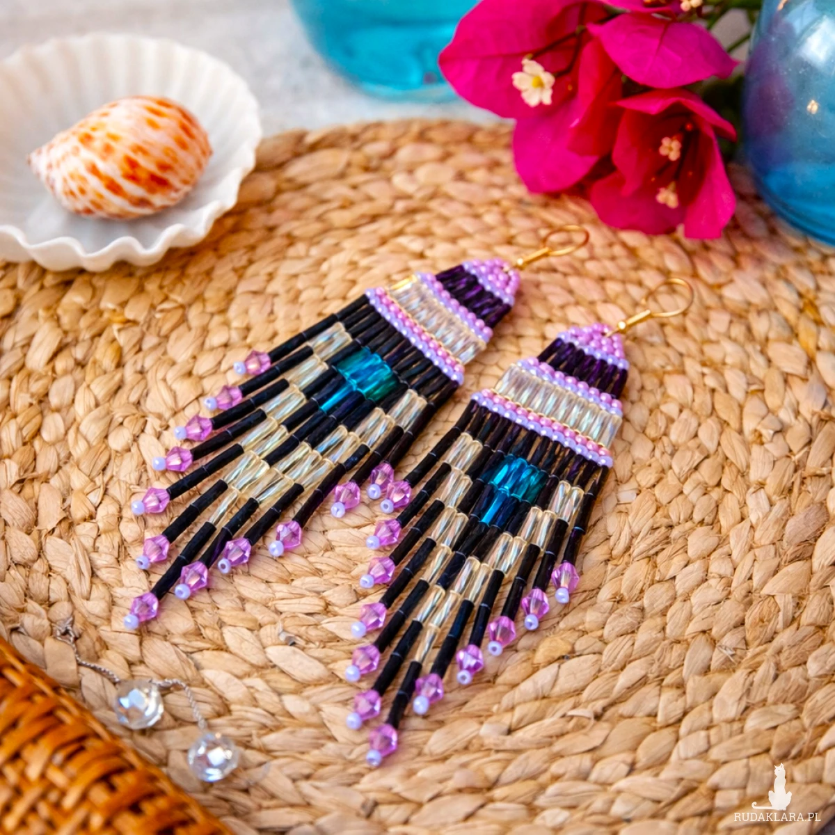 Kolczyki Ginger to ręcznie wykonana biżuteria z drobnych koralików, która zachwyca kontrastowym połączeniem srebrnych i czarnych elementów z subtelnym fioletem oraz akcentami błękitu i różu. Ich wachlarzowa forma i długie frędzle tworzą dynamiczny efekt, dzięki któremu kolczyki pięknie poruszają się w ruchu.