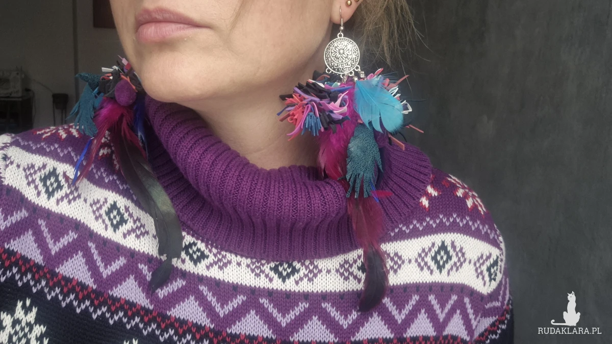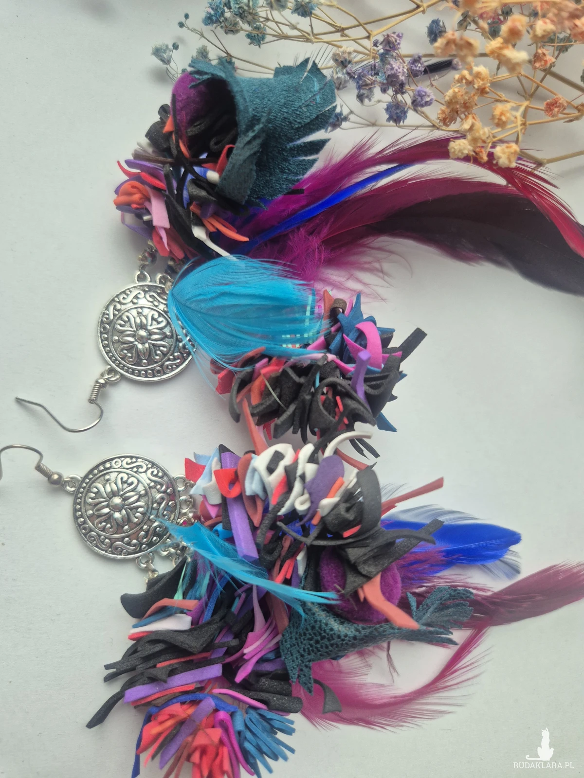 Kolczyki kolorowe energetyczne  pióra duże lekkie łapacze snów  wykonane w pojedynczym egzemplarzu rękodzieło