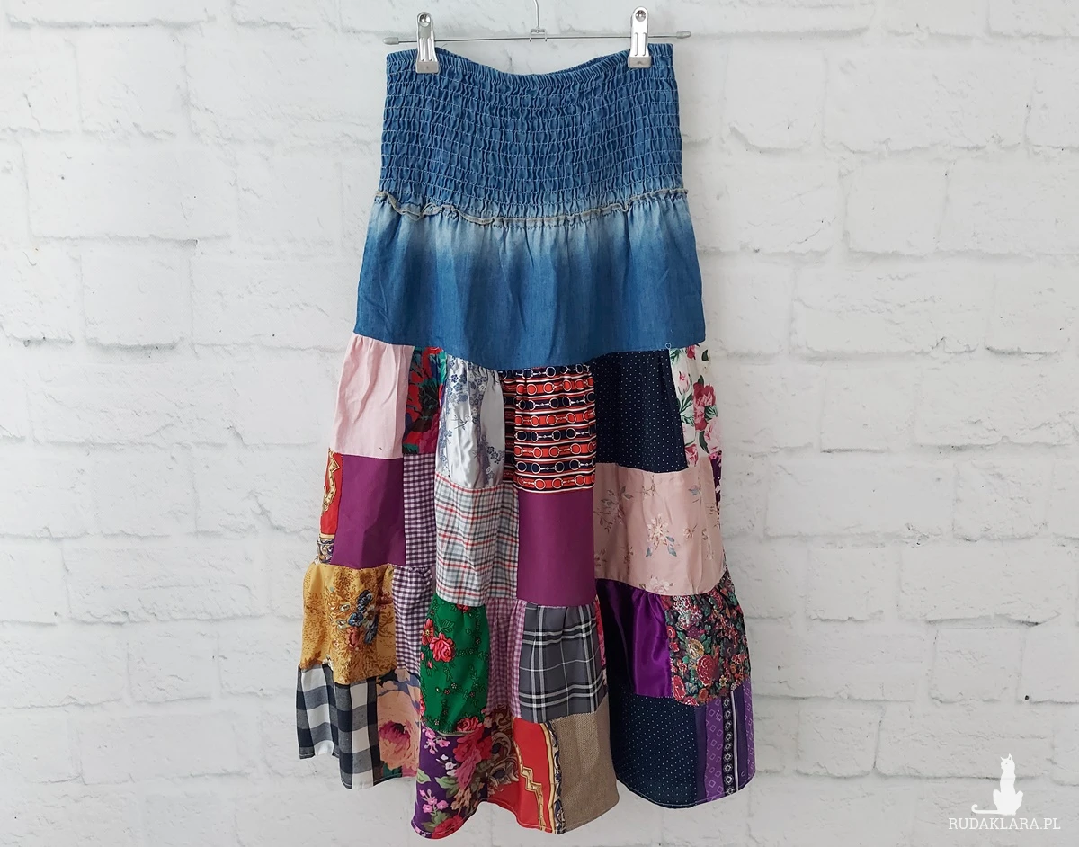 Spódnica z wysokim stanem, z rozciągliwą talią. Jest to prawdziwe patchworkowe dzieło, a nie materiał imitujący patchwork. Spódnica jest wykonana z dżinsu oraz wielu kawałków z pracowni krawieckiej – różnych tkanin o różnych wzorach, tworząc prawdziwy unikat, który nie ma sobie równych.
