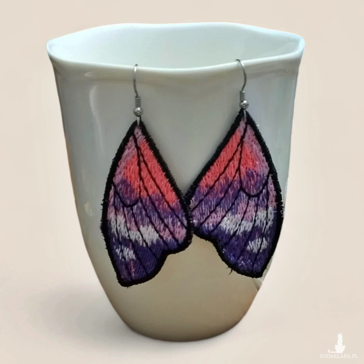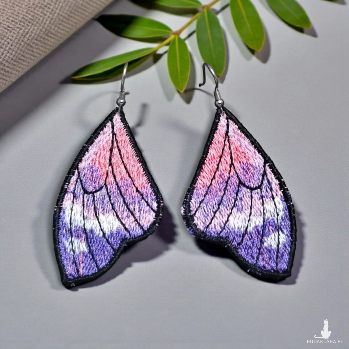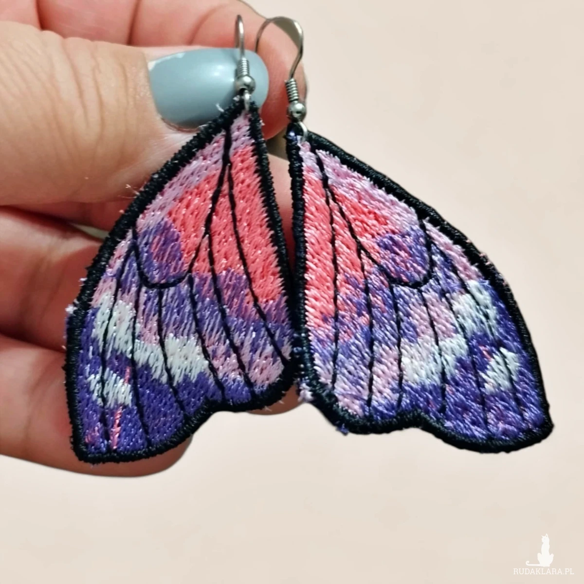 Kolczyki są haftowane (haft maszynowy). Haft jest gęsty, dobrze utrzymuje kształt i wygląd kolczyków. Haftowane kolczyki też są lekkie - to ich kolejny atut.