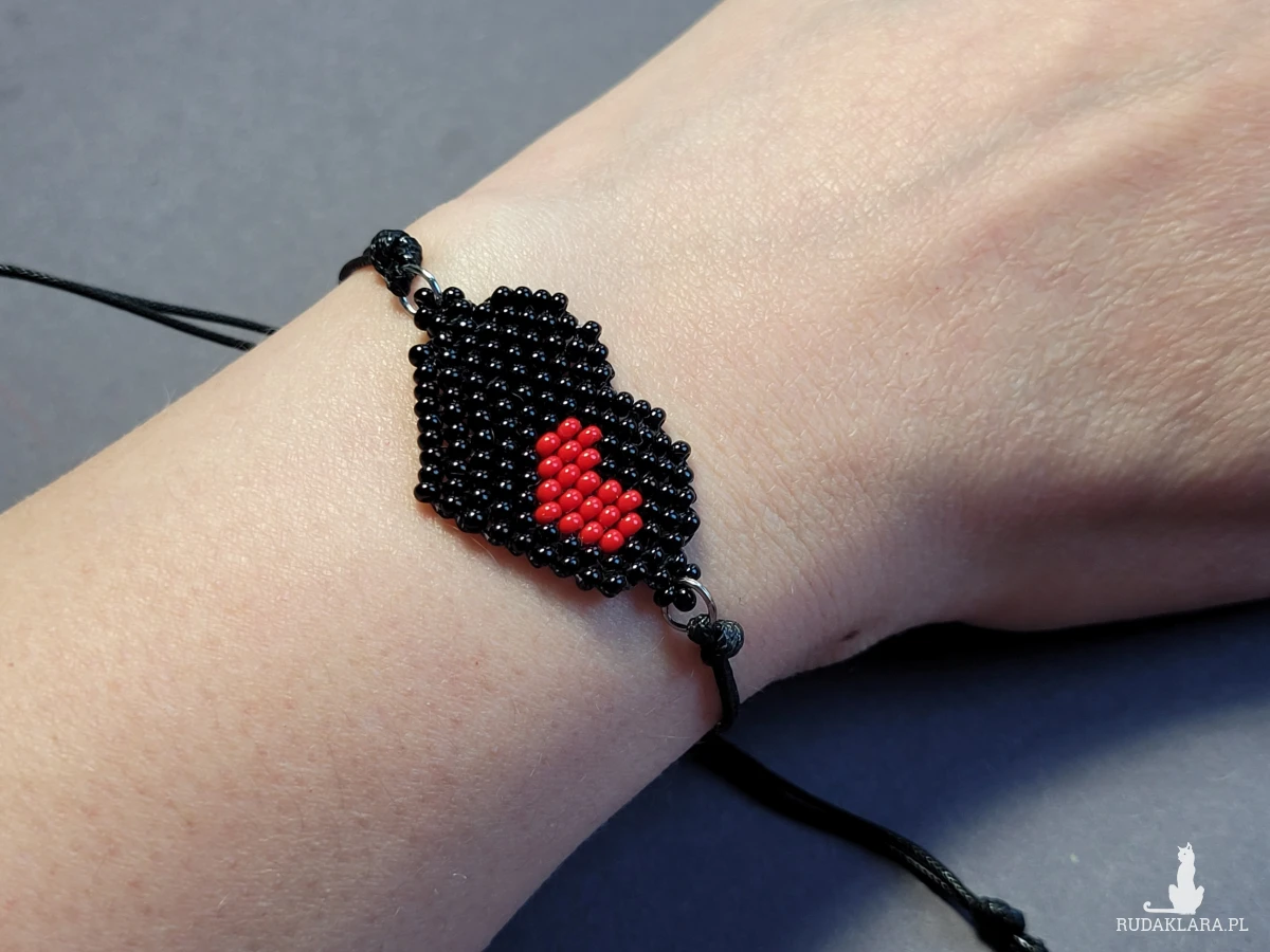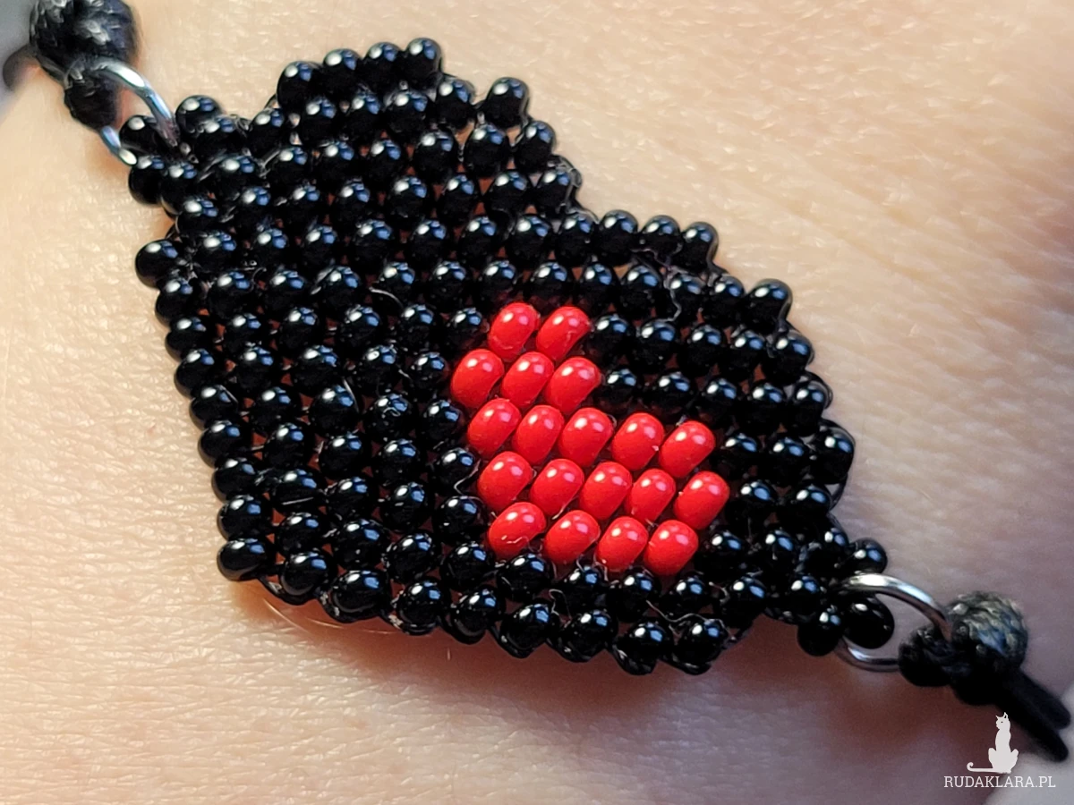 Bransoletka Miłość w sercu" czarno-czerwona zrobiona na sznurku z regulowanym zapięciem a element centralny został wytkany własnoręcznie z czeskich koralików Preciosa.