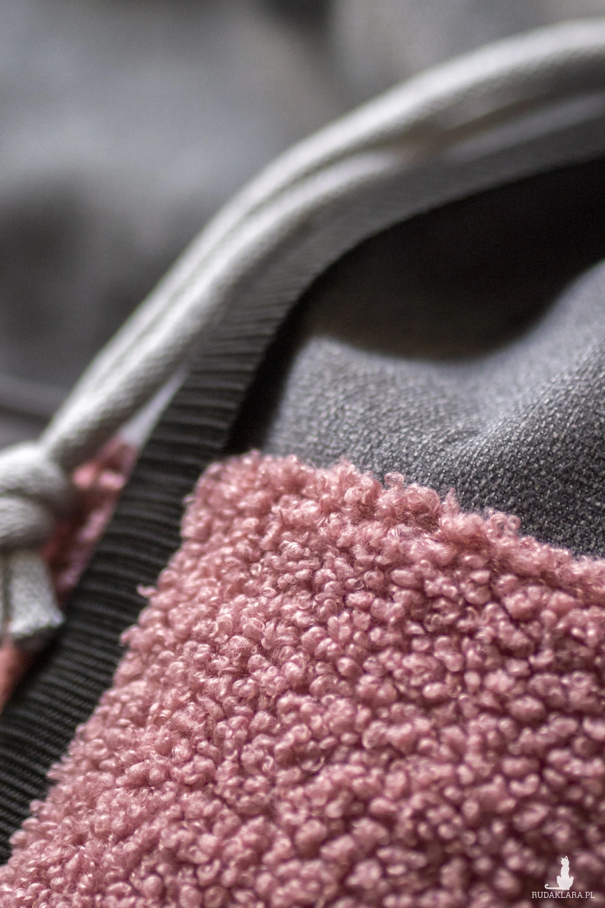 Torba na ramię z kominem, ściągana jak worek, w kolorze szarym. Z przodu i z tyłu torebki duże otwarte kieszenie z różowego "baranka".