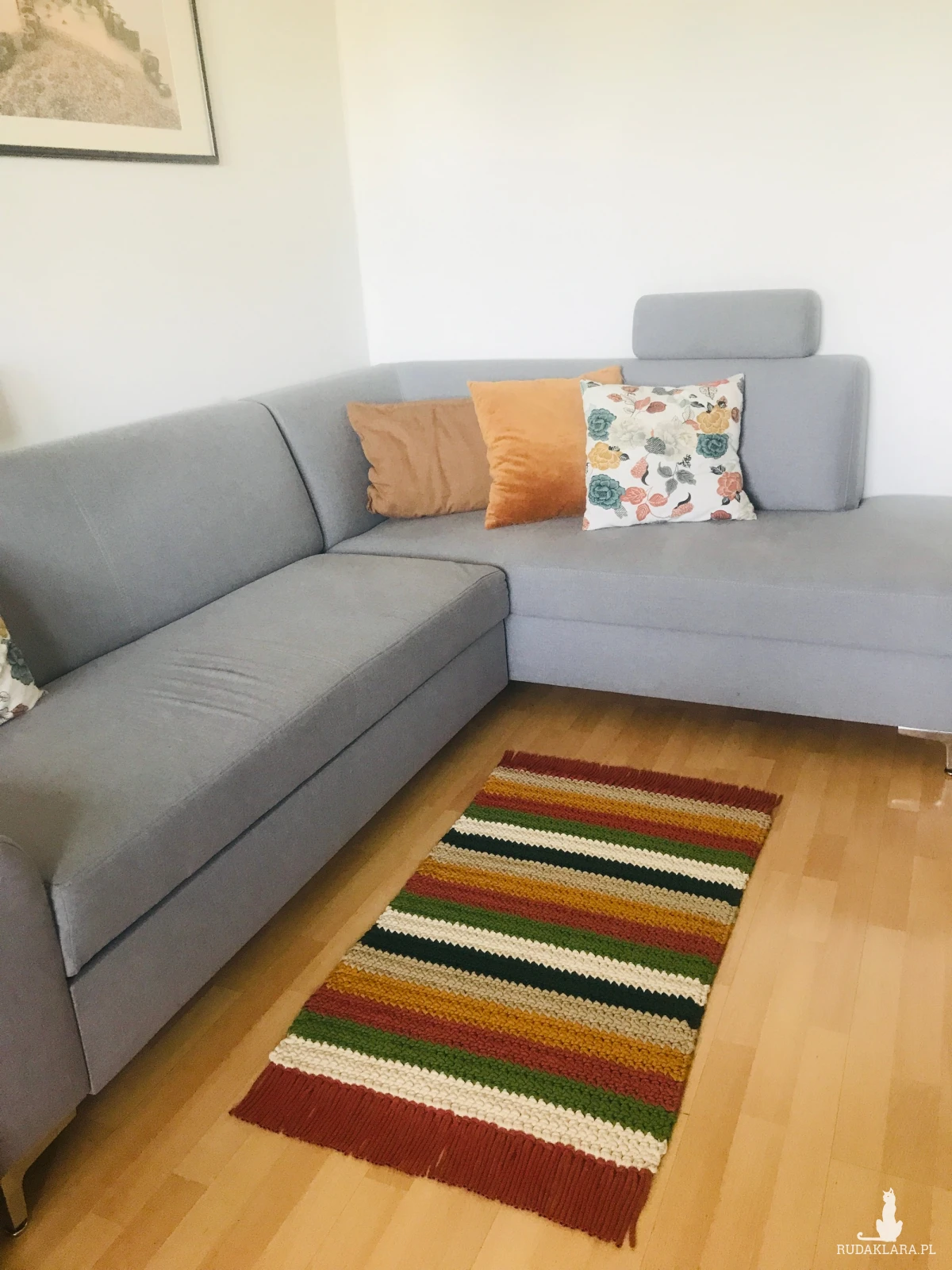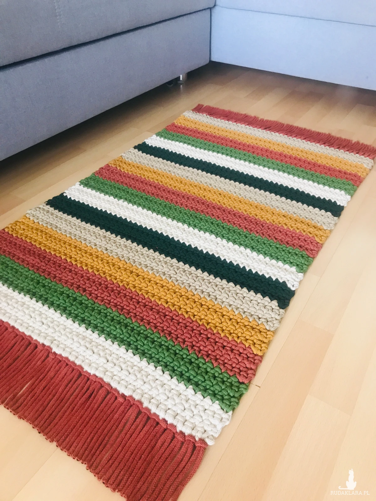 Dywan prostokątny w pasy dziergany na szydełku z polskiego sznurka bawełnianego o średnicy 5mm.