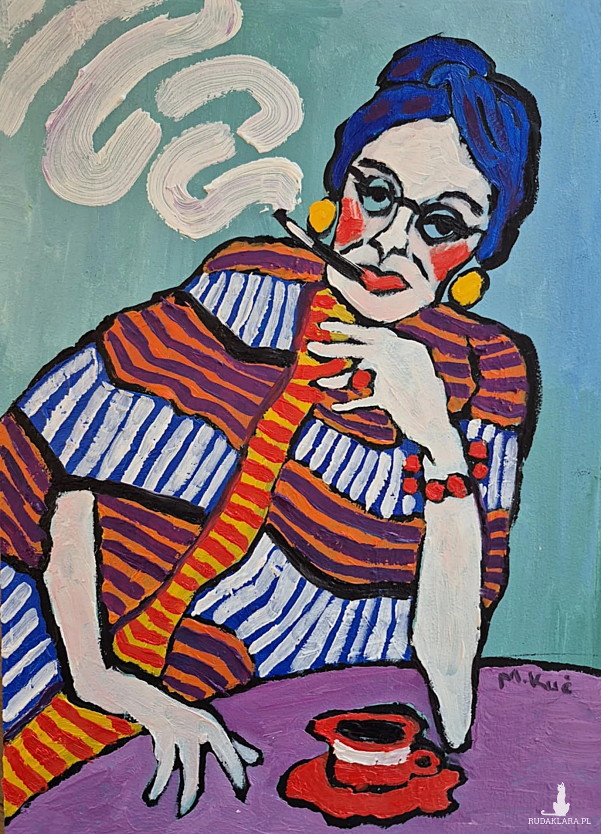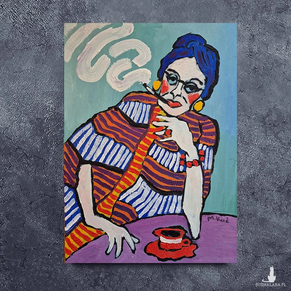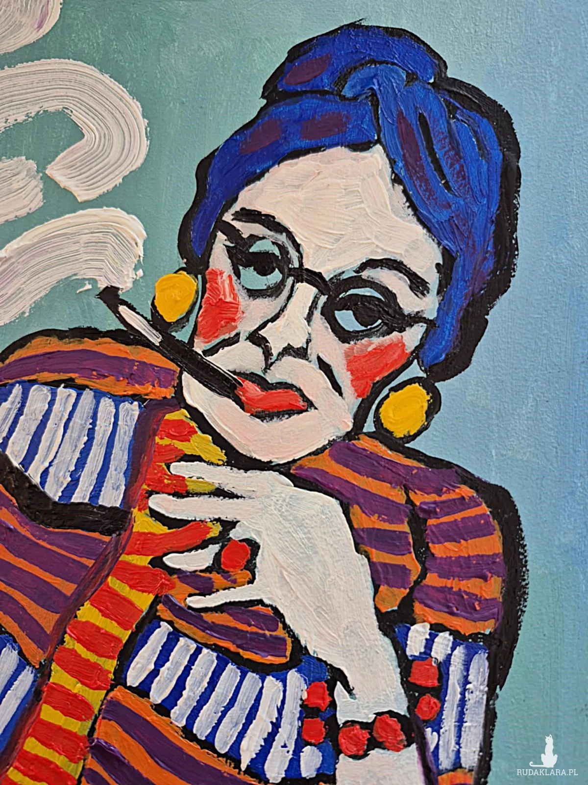 Twarz jest spokojna i zmęczona jednocześnie. Rumieńce nie są rumieńcami — to ślady życia, może wstydu, może pasji, może czegoś, co już się wydarzyło. Spojrzenie zza okularów nie szuka widza; patrzy obok, w głąb własnego milczenia. Papieros jest cienką granicą między oddechem a ucieczką, między byciem tu a byciem gdzie indziej.