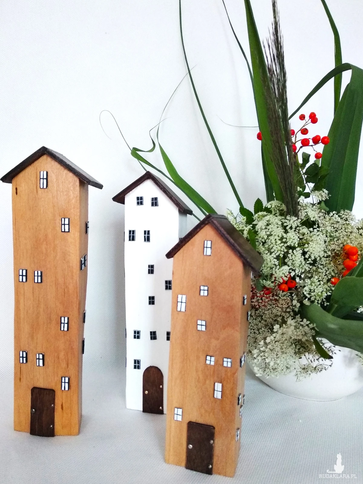 Zestaw trzech ręcznie wykonanych, drewnianych domków to pochwała prostoty i rzemiosła. Dwa z nich zachowują naturalny kolor drewna, trzeci – biały – wprowadza kontrast i równowagę. Surowe linie, brak zbędnych ozdobników i geometryczna forma nadają im nowoczesny, a jednocześnie ciepły charakter.