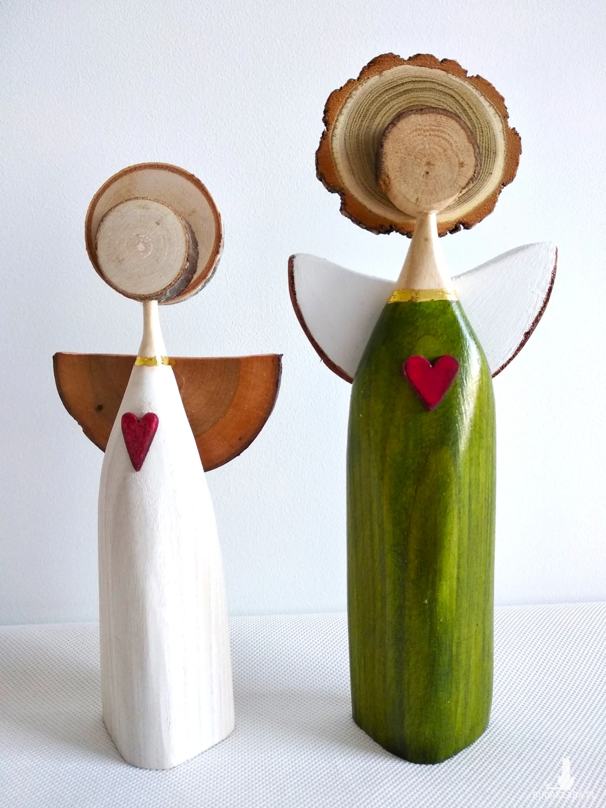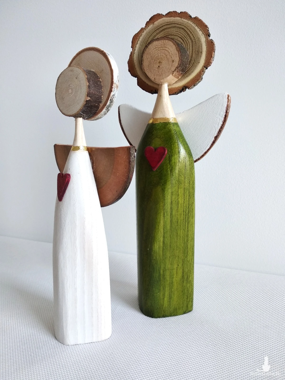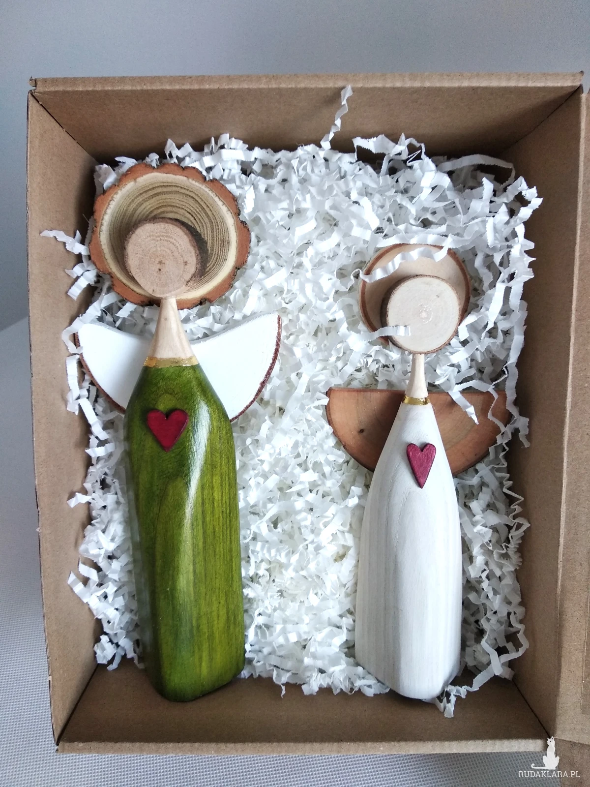 Aniołki wykonane z drewna bukowego. Biały malowany farbą akrylową, zielony barwiony bejcą wodną i zabezpieczone bezbarwnym akrylowym lakierem. Ten zestaw doskonale odnajdzie się jako prezent dla miłośników aniołów i rękodzieła, ale też jako symboliczny upominek z okazji ważnych chwil – ślubu, rocznicy, parapetówki czy po prostu jako gest bliskości bez szczególnej okazji.