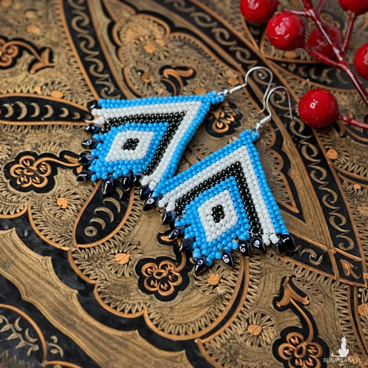 Kolczyki Tres to ręcznie wykonana biżuteria z drobnych koralików, która zachwyca harmonijnym połączeniem bieli, turkusowego błękitu oraz metalicznego hematytu. Geometryczna forma inspirowana wzorami etnicznymi nadaje im wyjątkowy charakter i sprawia, że stanowią wyrazisty element stylizacji.
