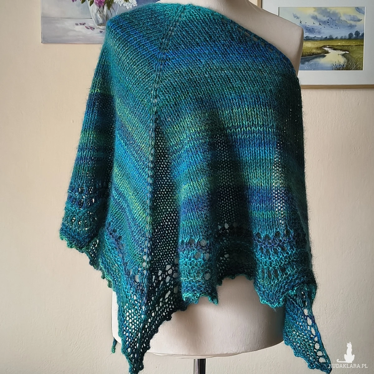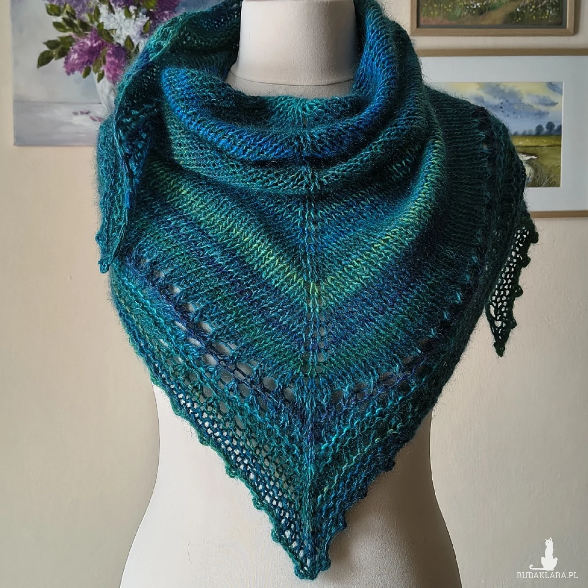 Cudownie miękka, lejąca, delikatnie puchata chusta wykonana ręcznie na drutach podwójną nitką z najwyższej jakości włóczek: niezwykle delikatnego, miękkiego kanadyjskiego moheru z jedwabiem (70%/30%) i australijskiej włóczki o składzie: wełenka merino, wełna i niewielka ilość akrylu. Kombinacja włóczek dała cudny efekt kolorystyczny, o wiele ciekawszy w rzeczywistości, ponieważ zdjęcia nie oddają wszystkich niuansów kolorystycznych. Chusta jest ciepła, a przy tym lekka. Pięknie się układa. Doskonały dodatek do różnych stylizacji o każdej porze roku.. Wymiary: 172 cm. bok najdłuższy, 70 cm. wysokość trójkąta. Pranie wyłącznie ręczne.