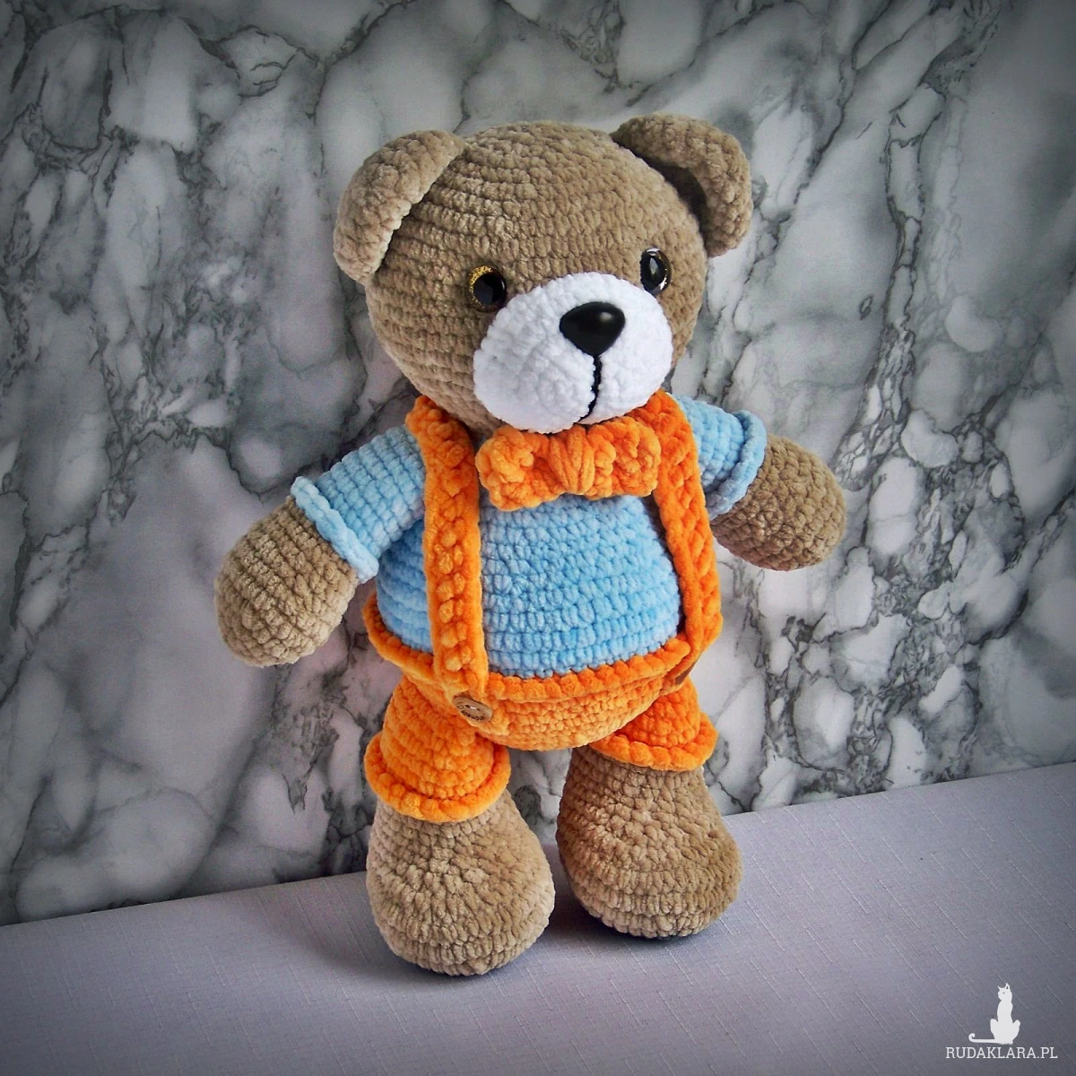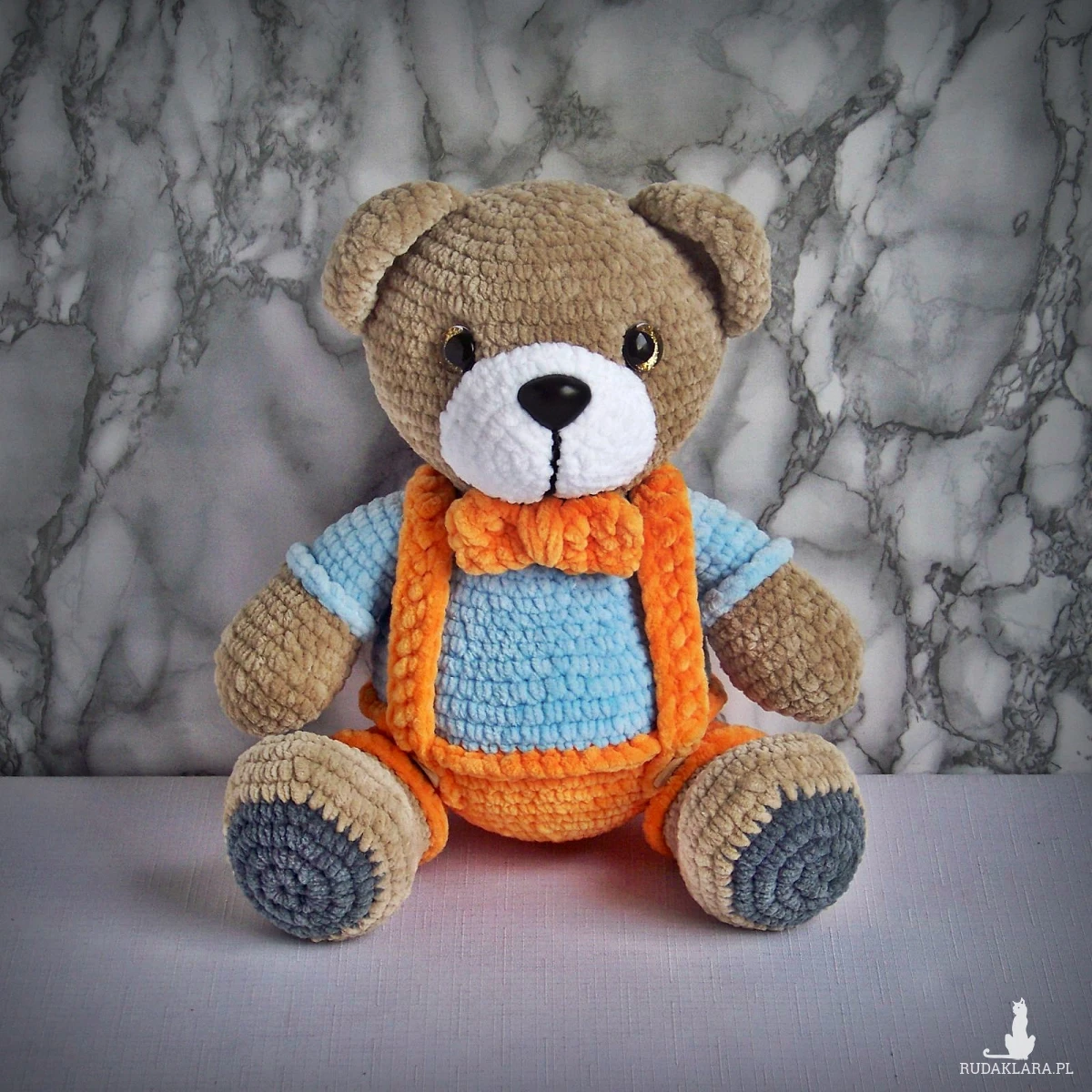 Szydełkowy miś 32cm w pomarańczowych spodenkach (na zamówienie)
