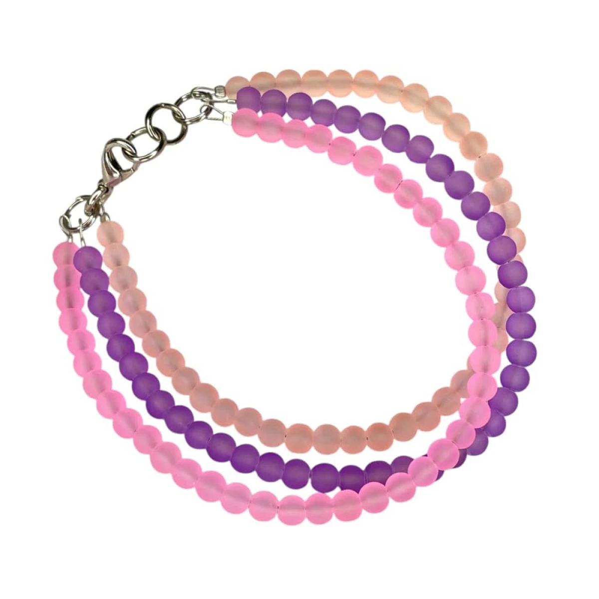 Bransoletka z matowych koralików to efektowny dodatek, który ożywia stylizację wyrazistą paletą barw. Każdy sznur szklanych koralików ma inny odcień, dzięki czemu całość nabiera głębi i wielowymiarowości. Matowe wykończenie dodaje jej delikatności, a srebrzyste elementy wprowadzają nowoczesny charakter. To dodatek, który wnosi lekkość i świeżość niezależnie od sezonu, idealny na co dzień i na bardziej swobodne okazje. Całość uzupełnia praktyczny karabińczyk, gwarantujący komfortowe użytkowanie.