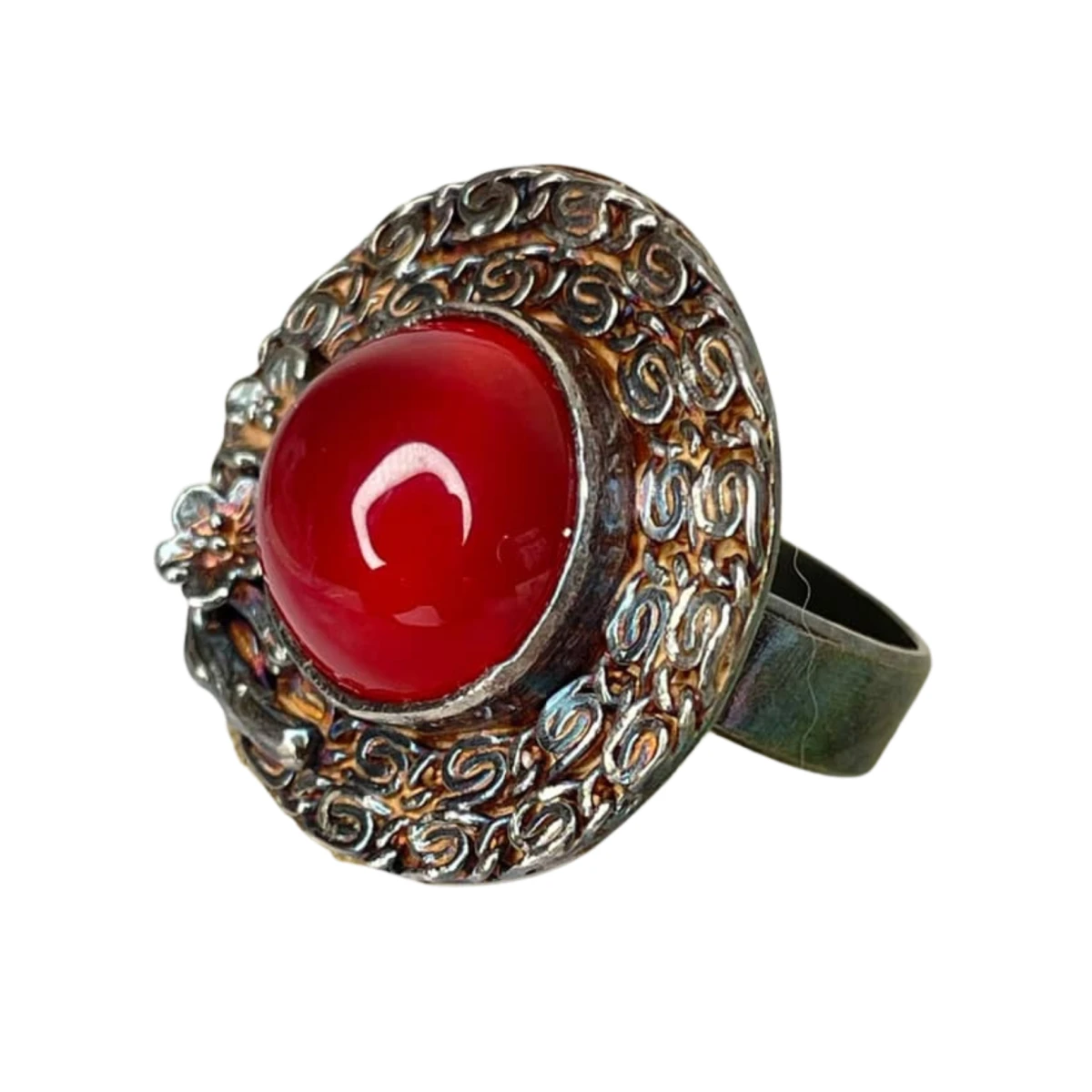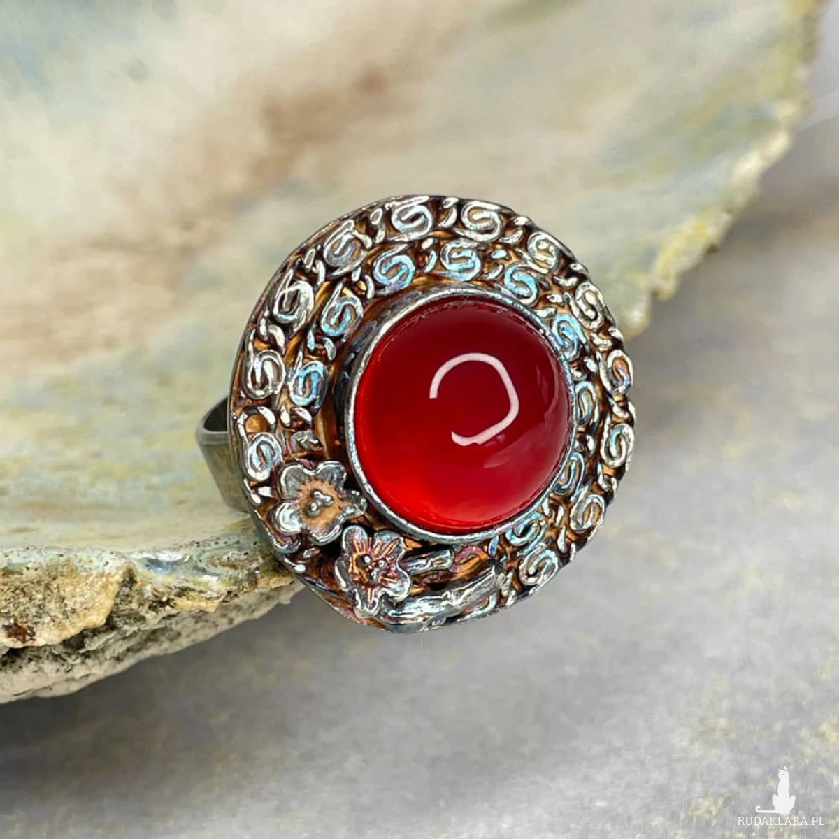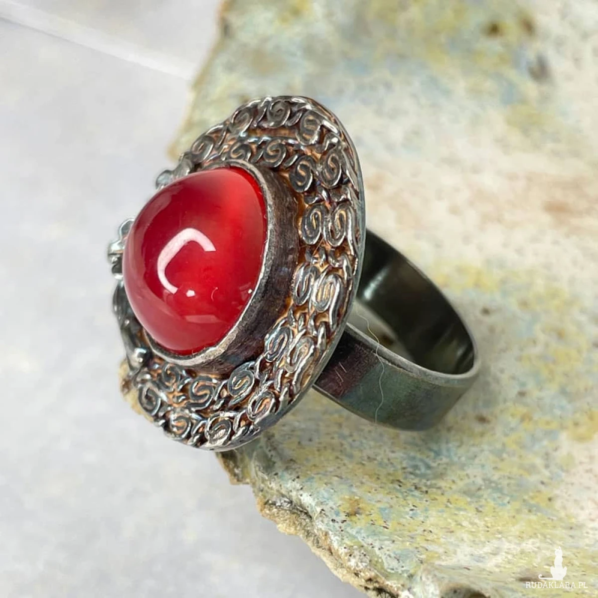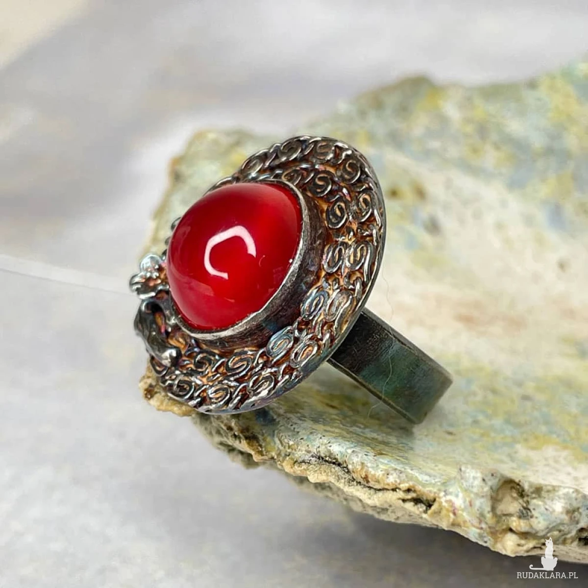Intensywna czerwień agatu przykuwa uwagę jak świetlista kropla zatopiona w bogato zdobionej, srebrnej oprawie. Delikatnie oksydowane elementy nadają pierścionkowi głębi i artystycznego wyrazu, subtelnie balansując między klasyczną elegancją a rzemieślniczym kunsztem. Ręczne wykonanie sprawia, że każda sztuka ma niepowtarzalny charakter i ponadczasowy wdzięk. To biżuteria dla kobiet poszukujących dodatków z charakterem - wyrazistych, a zarazem pełnych klasy i subtelności.