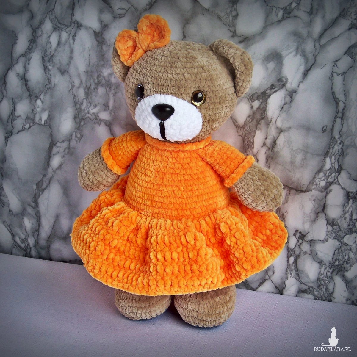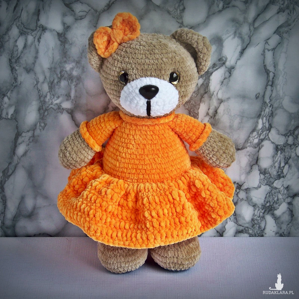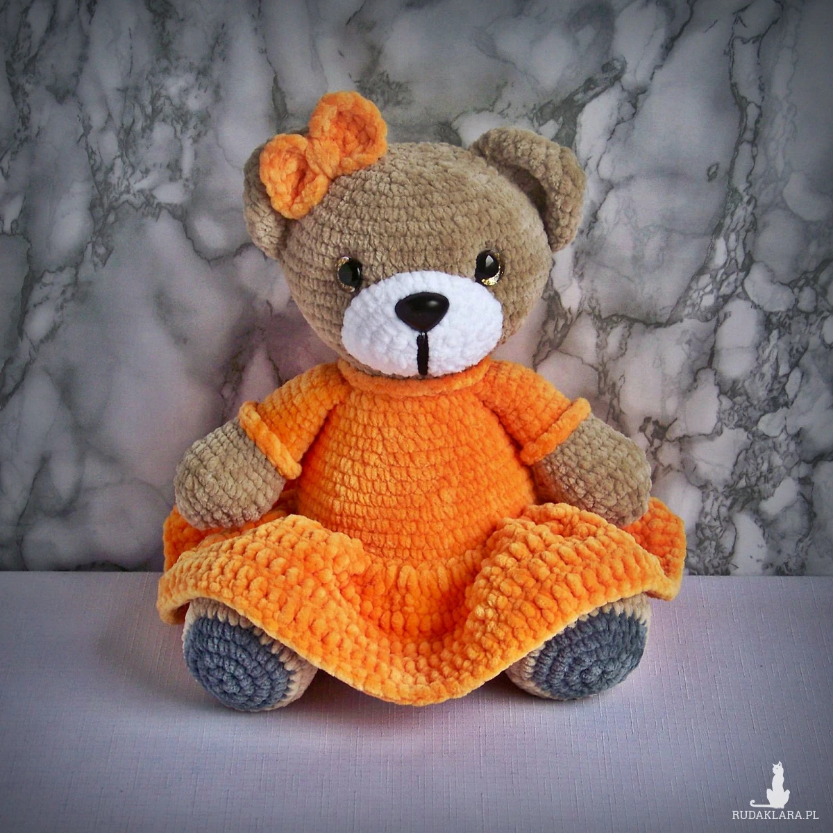 Szydełkowy miś 32cm w ciemnożółtej sukience (na zamówienie)