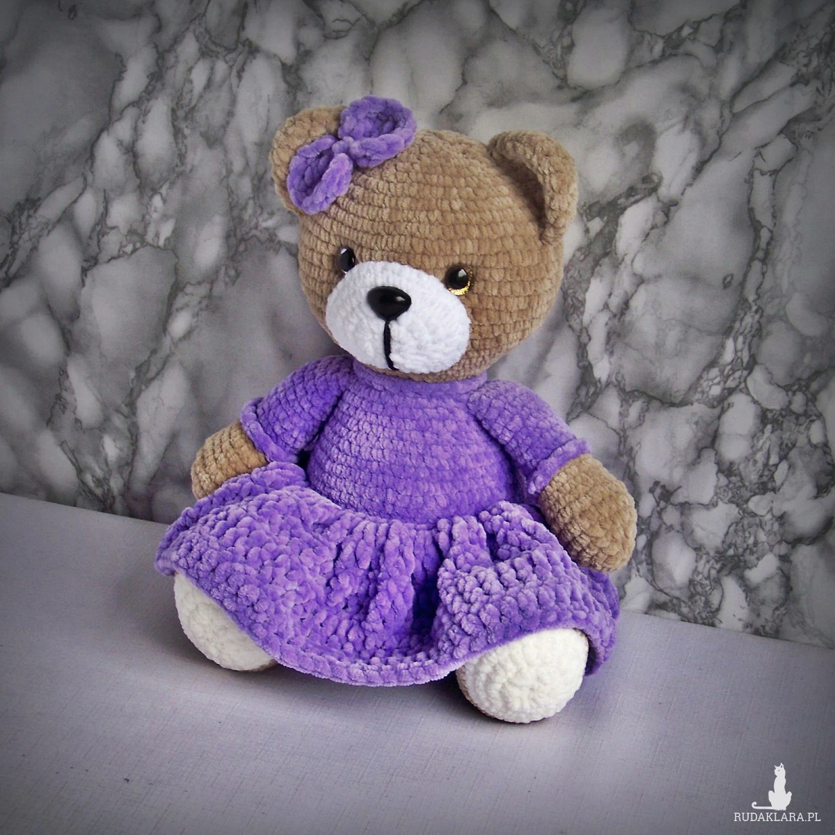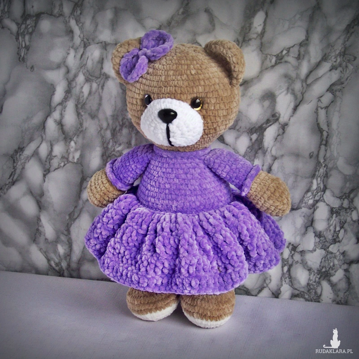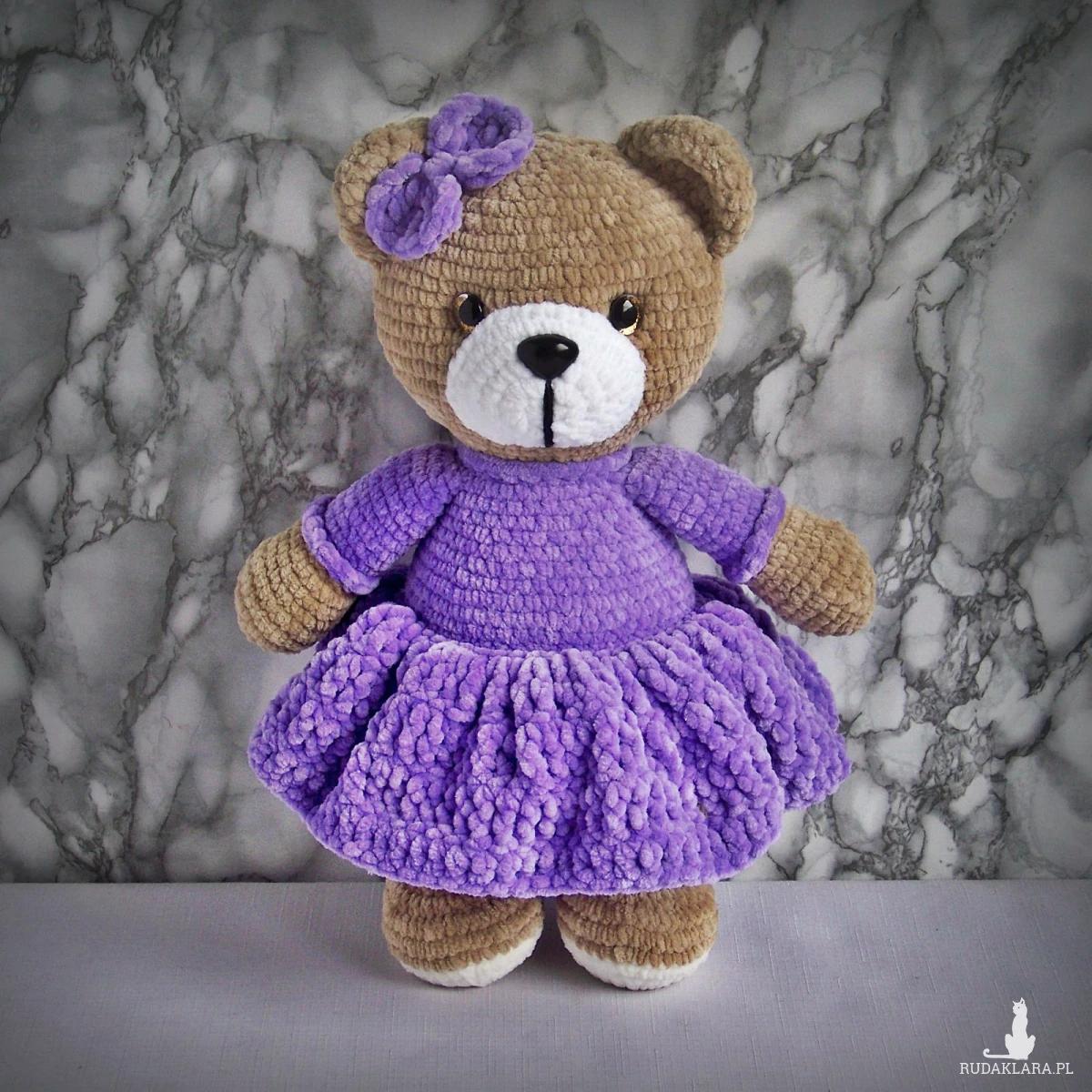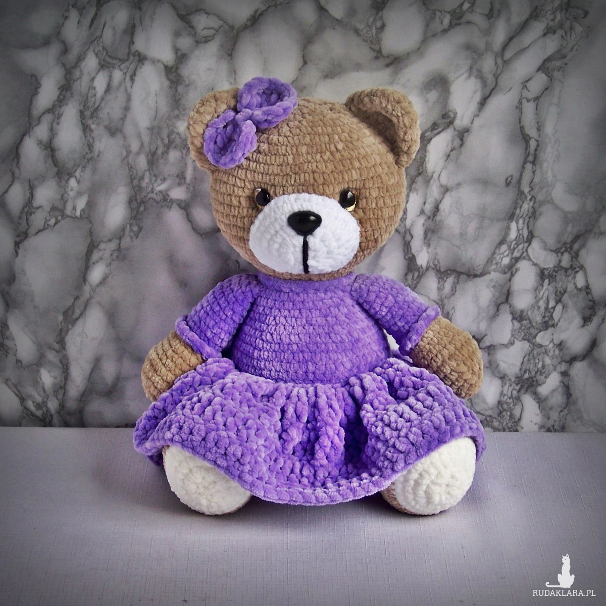Szydełkowy miś 32cm w fioletowej sukience (na zamówienie)