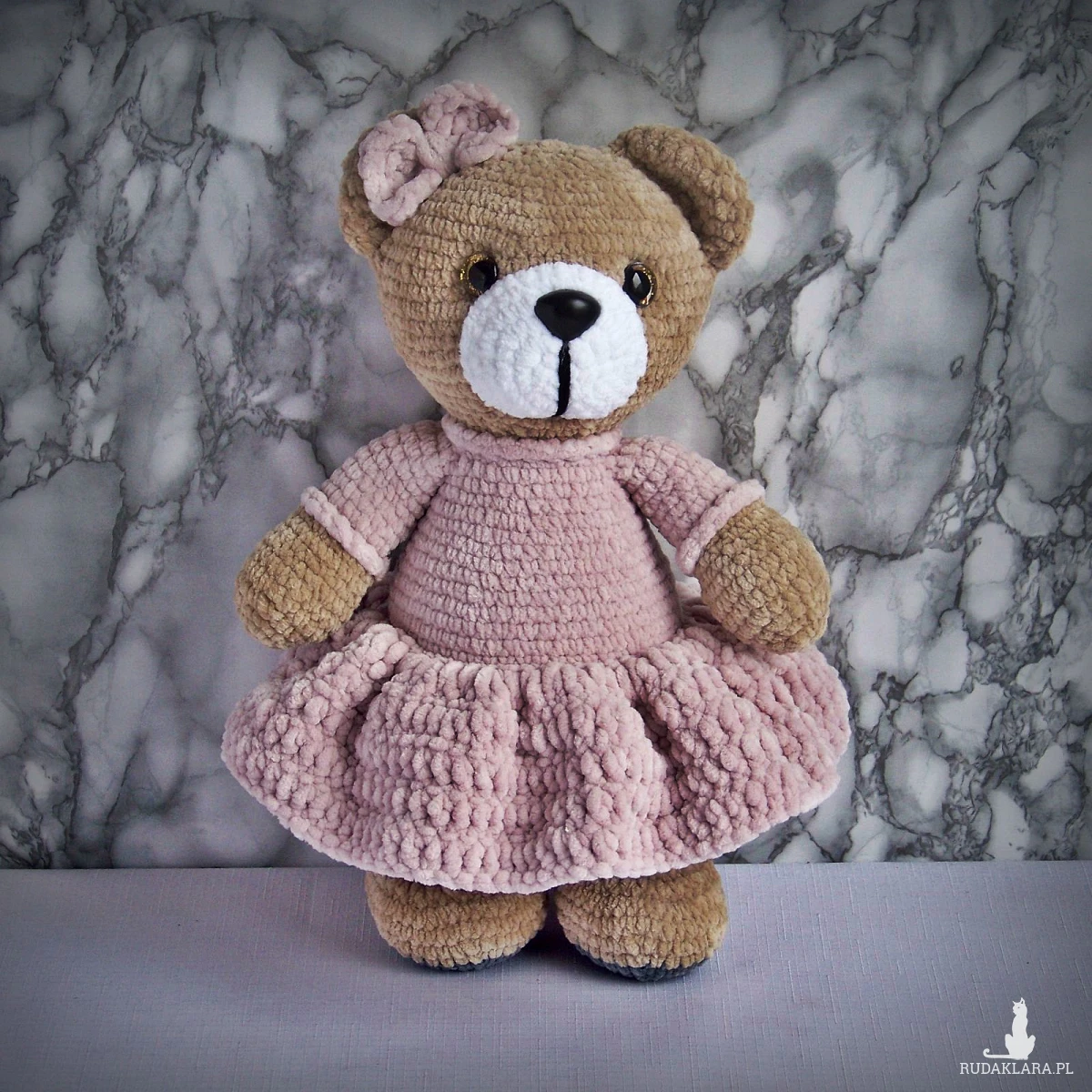 Szydełkowy miś 32cm w sukience pudrowy róż (na zamówienie)
