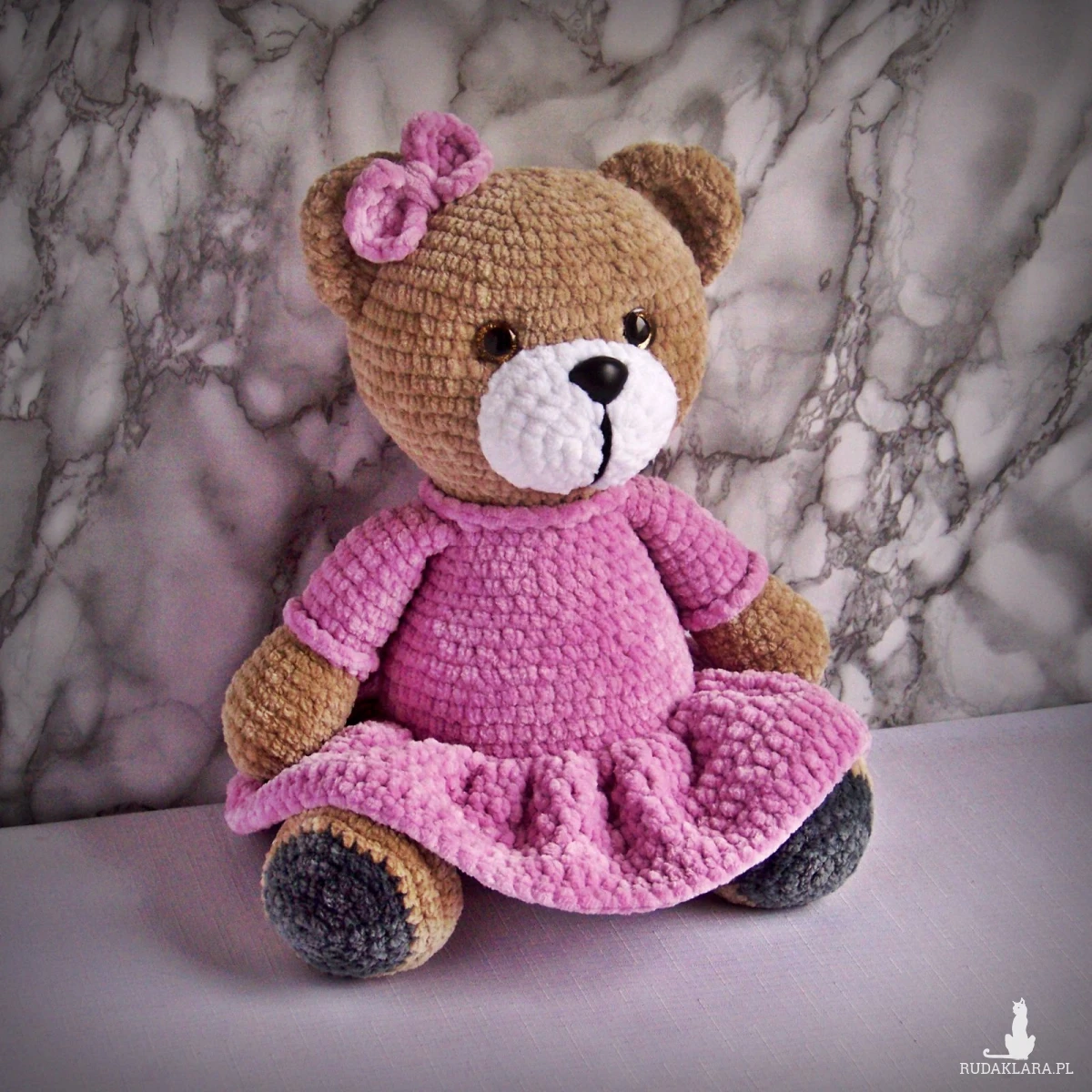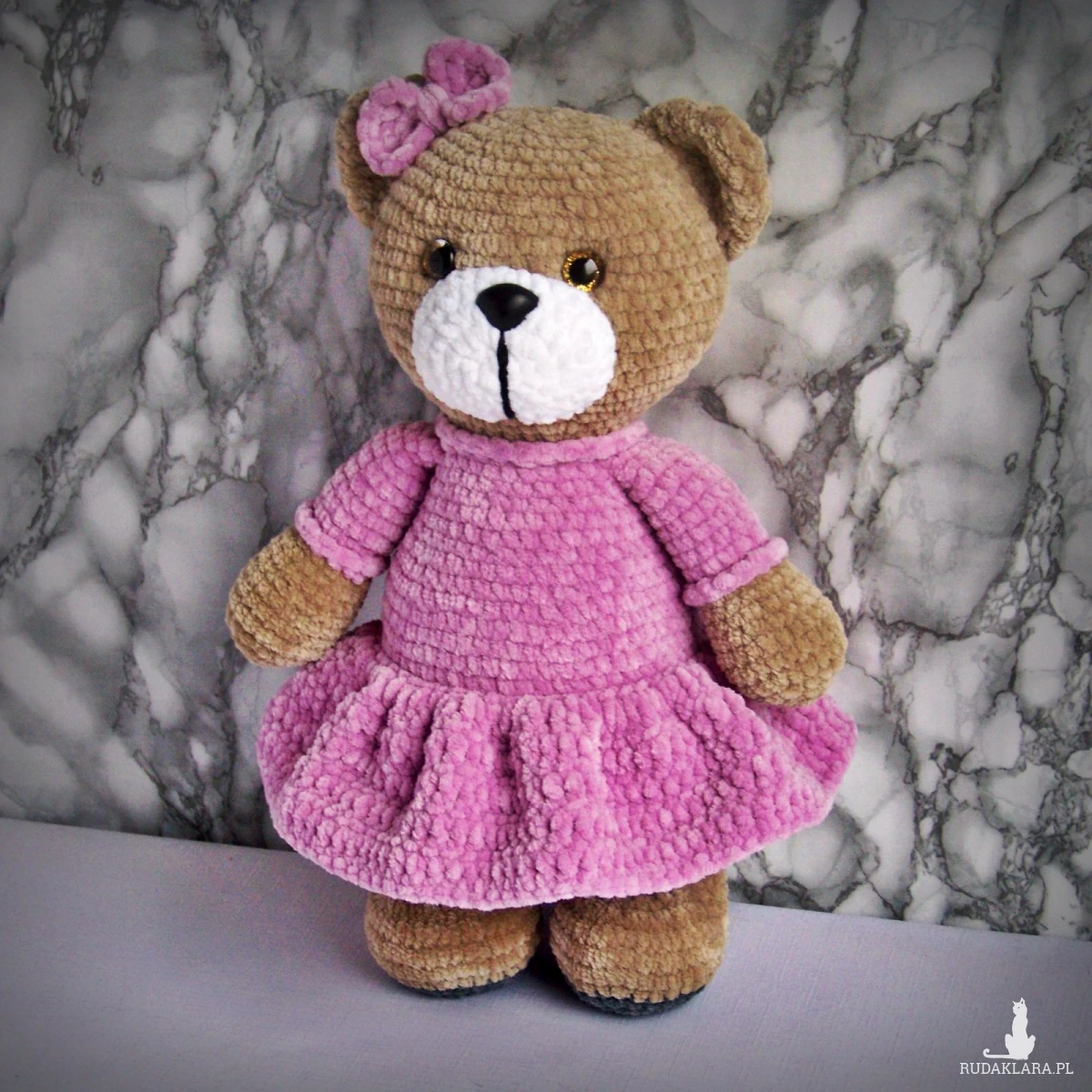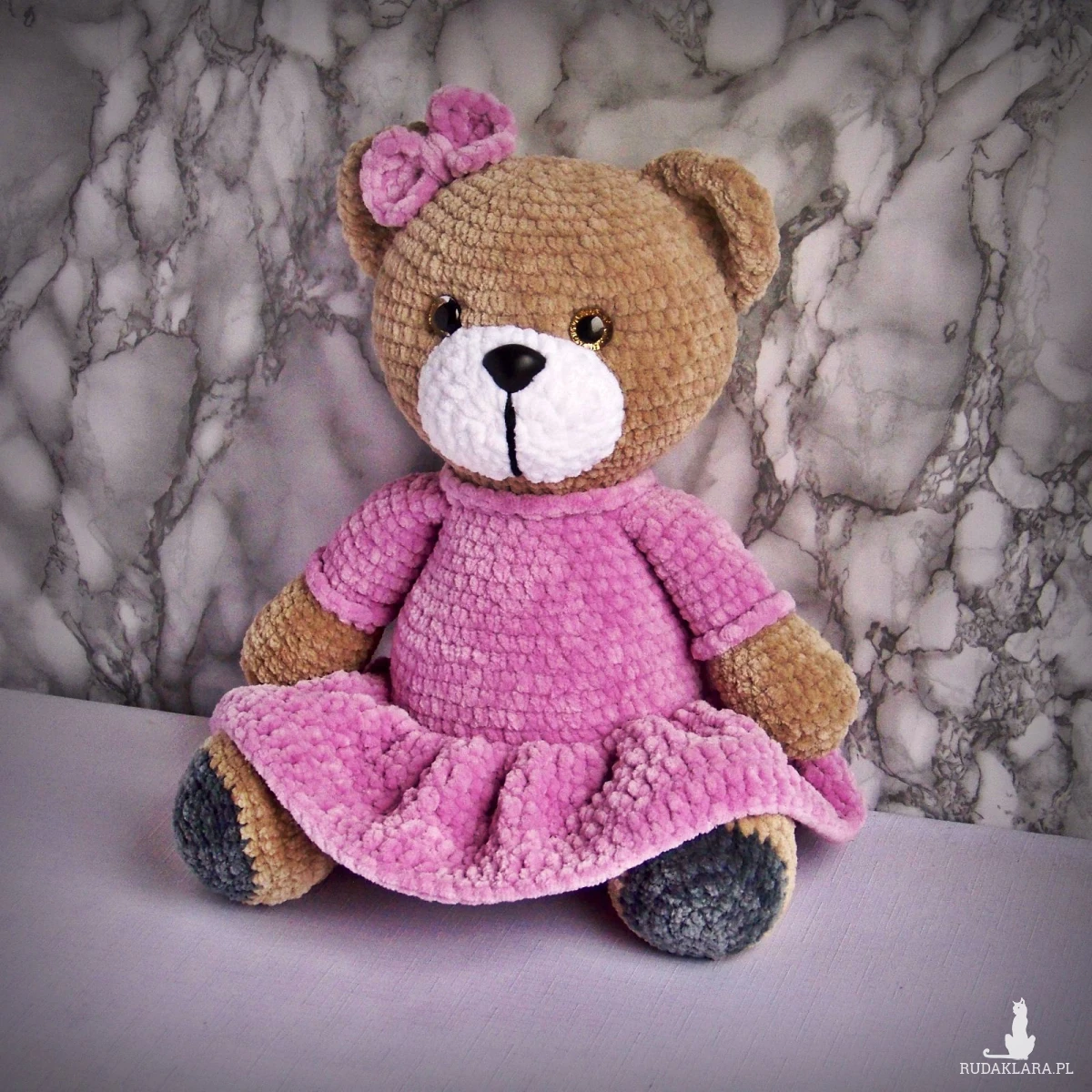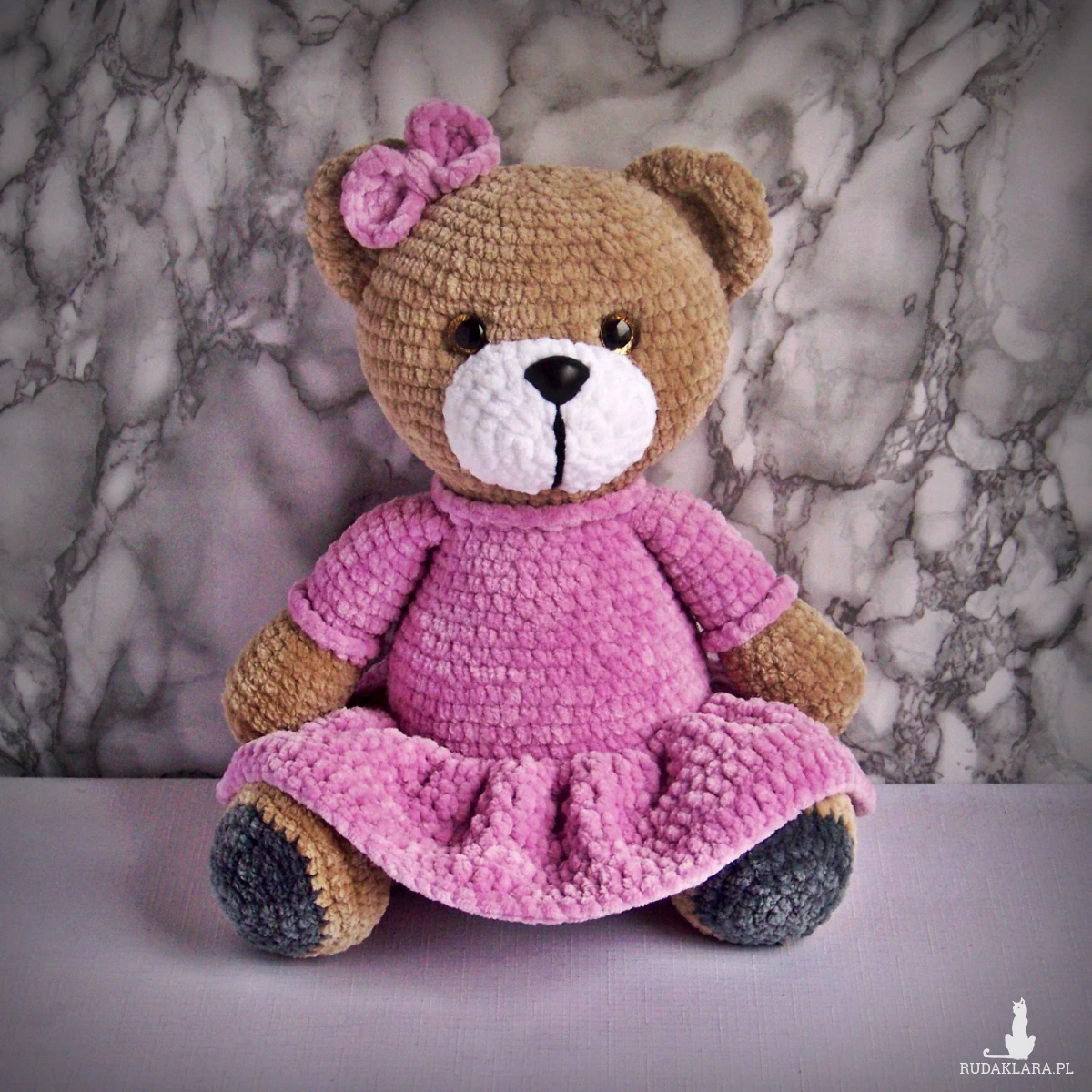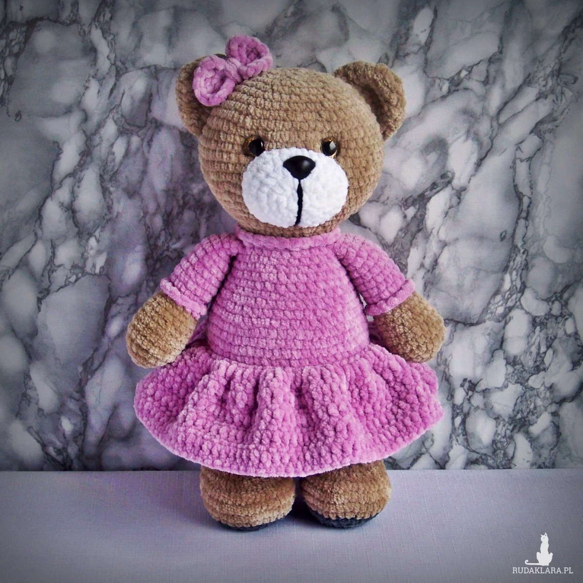 Szydełkowy miś 32cm we wrzosowej sukience (na zamówienie)