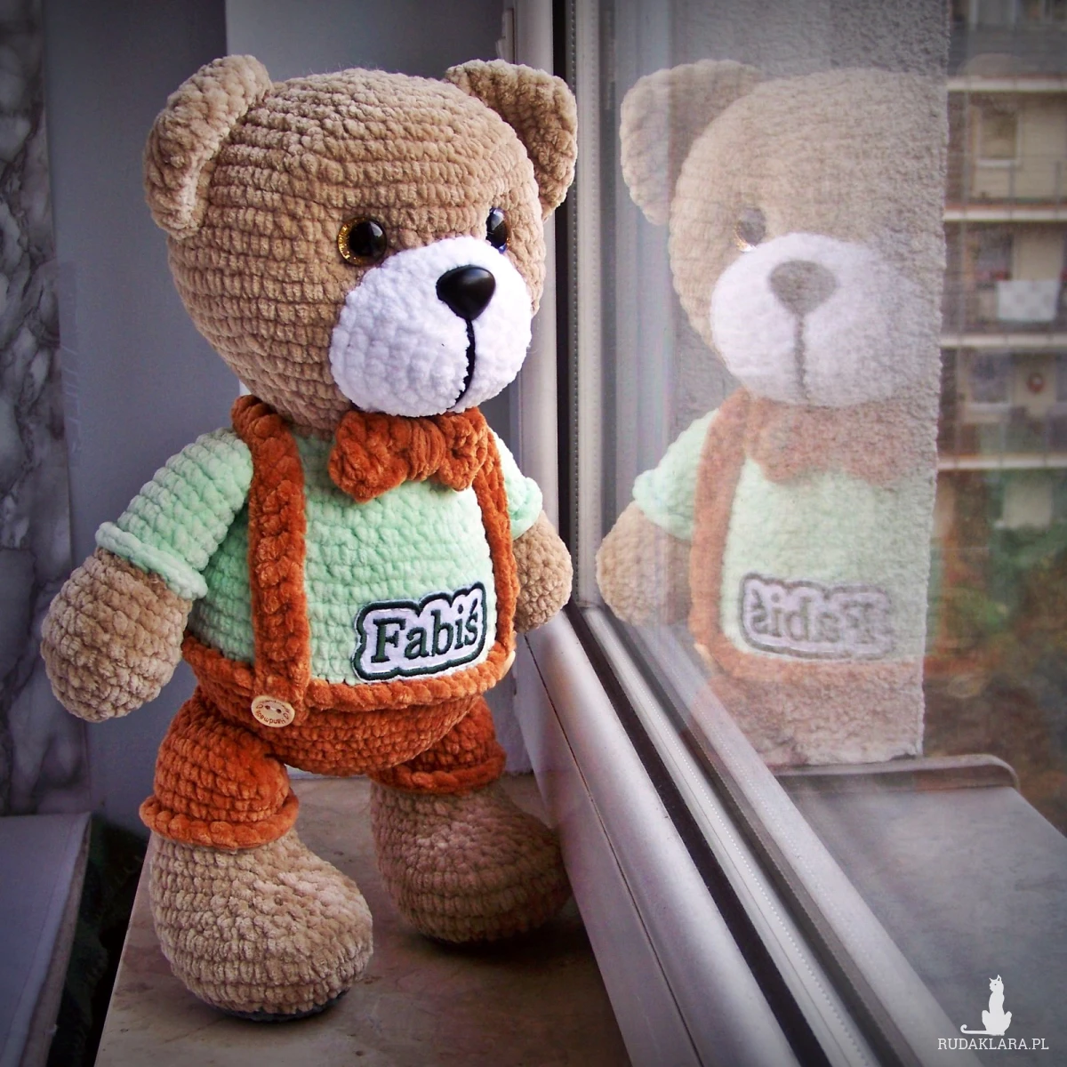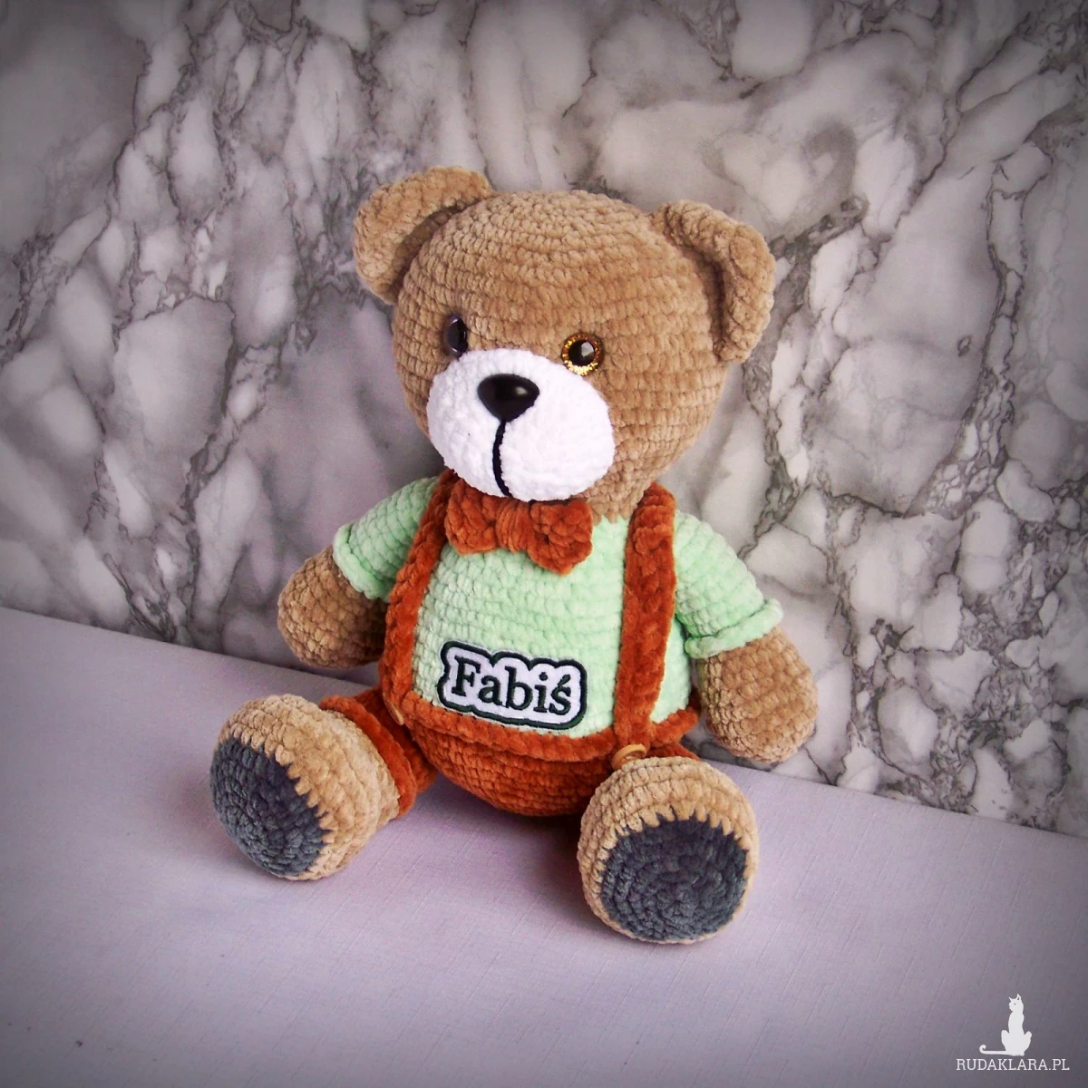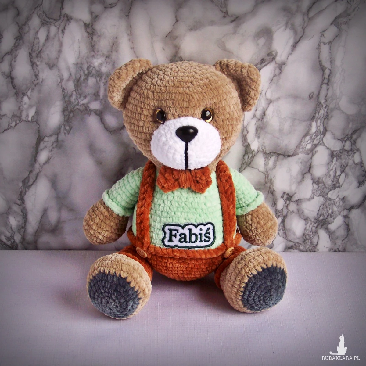 Szydełkowy miś Fabiś 32cm w brązowych spodenkach (na zamówienie)
