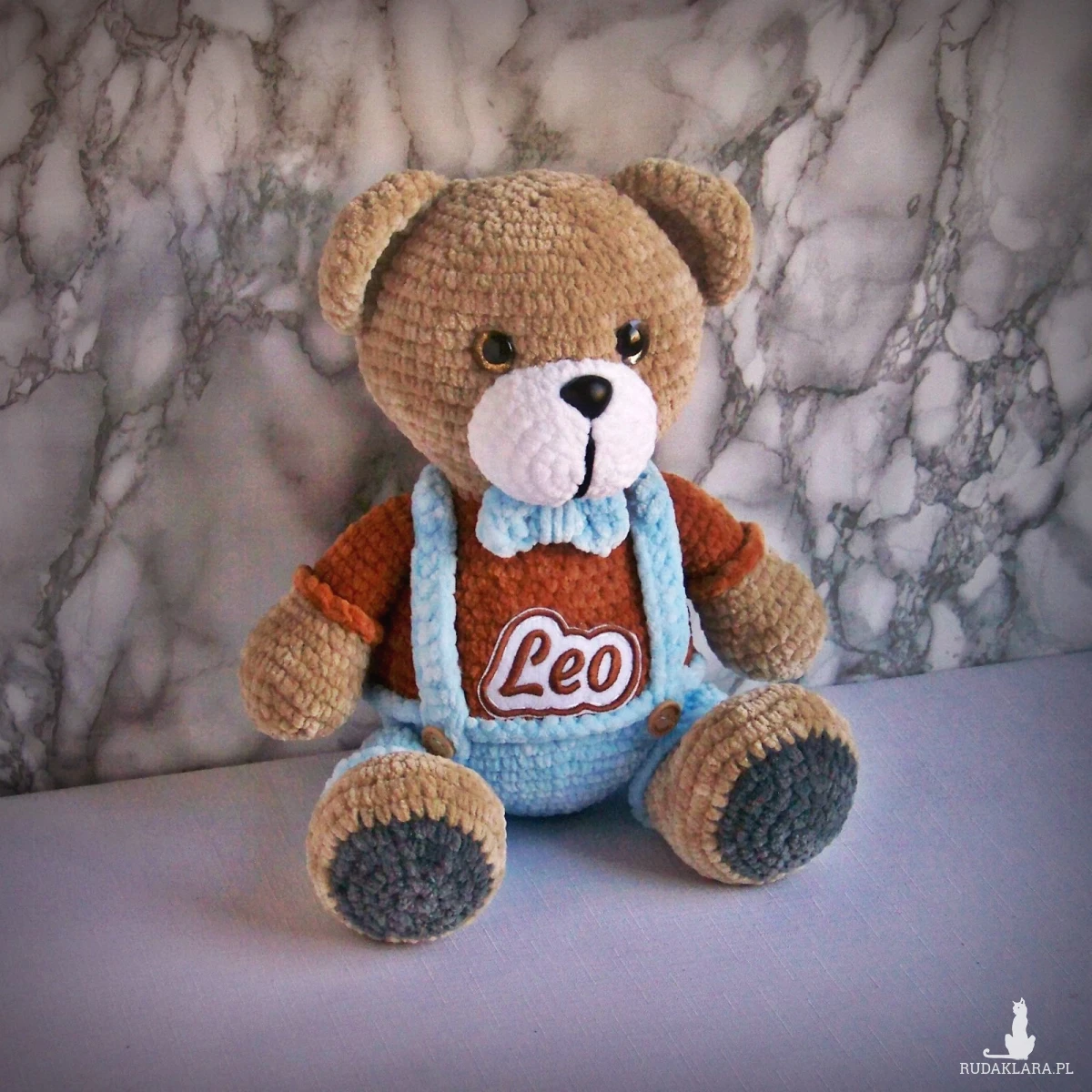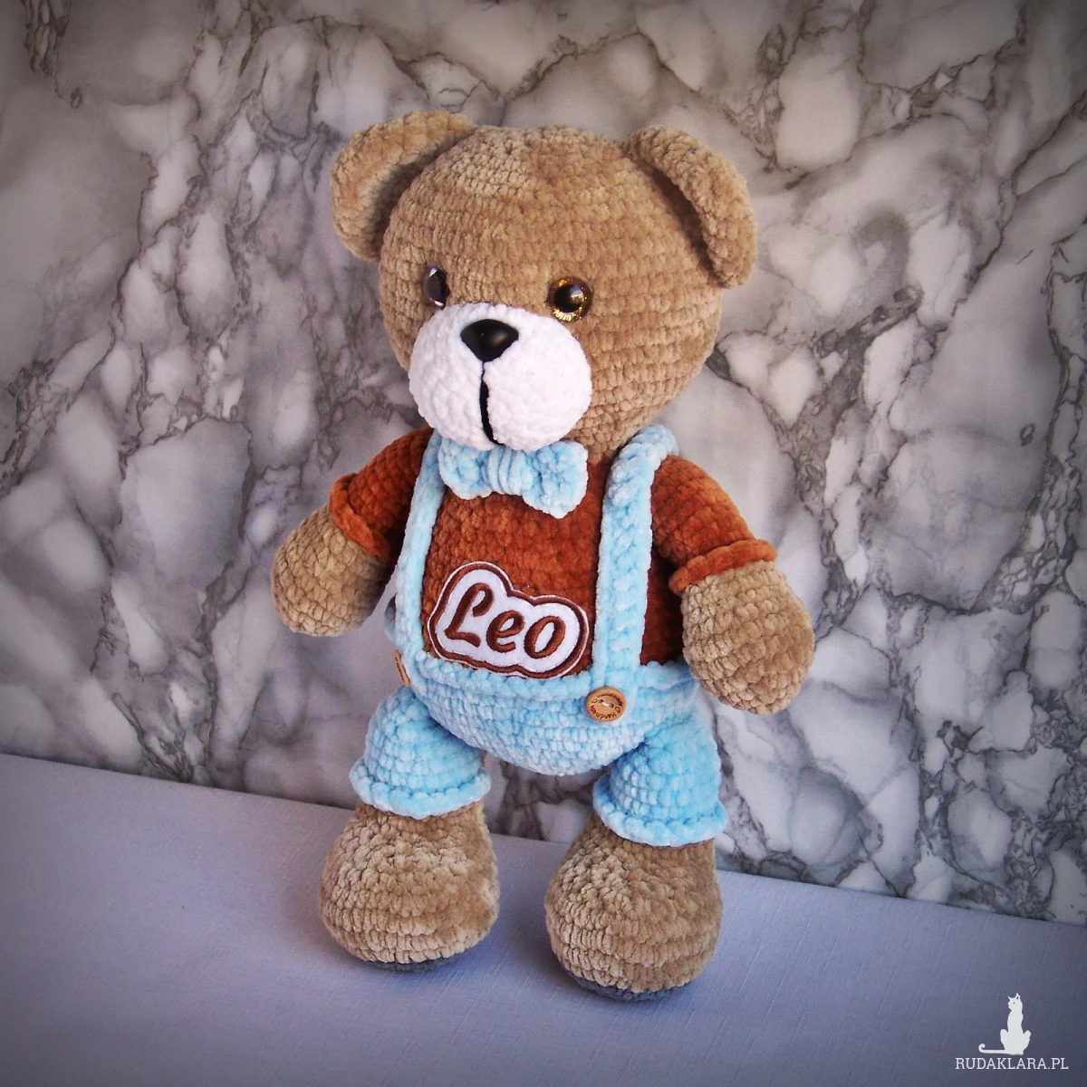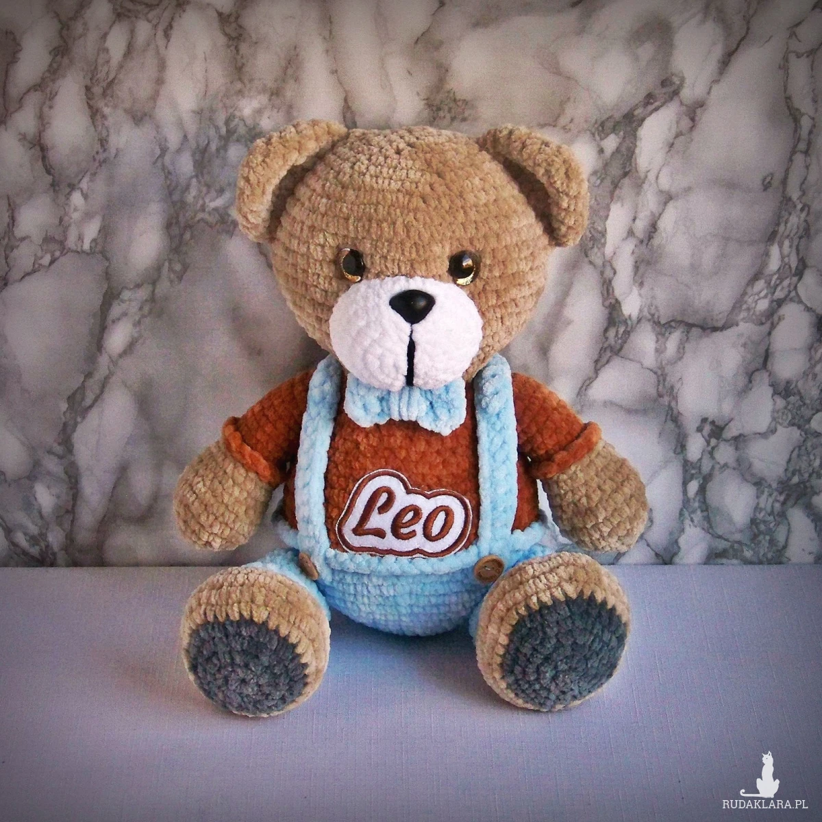 Szydełkowy miś Leo 32cm w niebieskich spodenkach (na zamówienie)