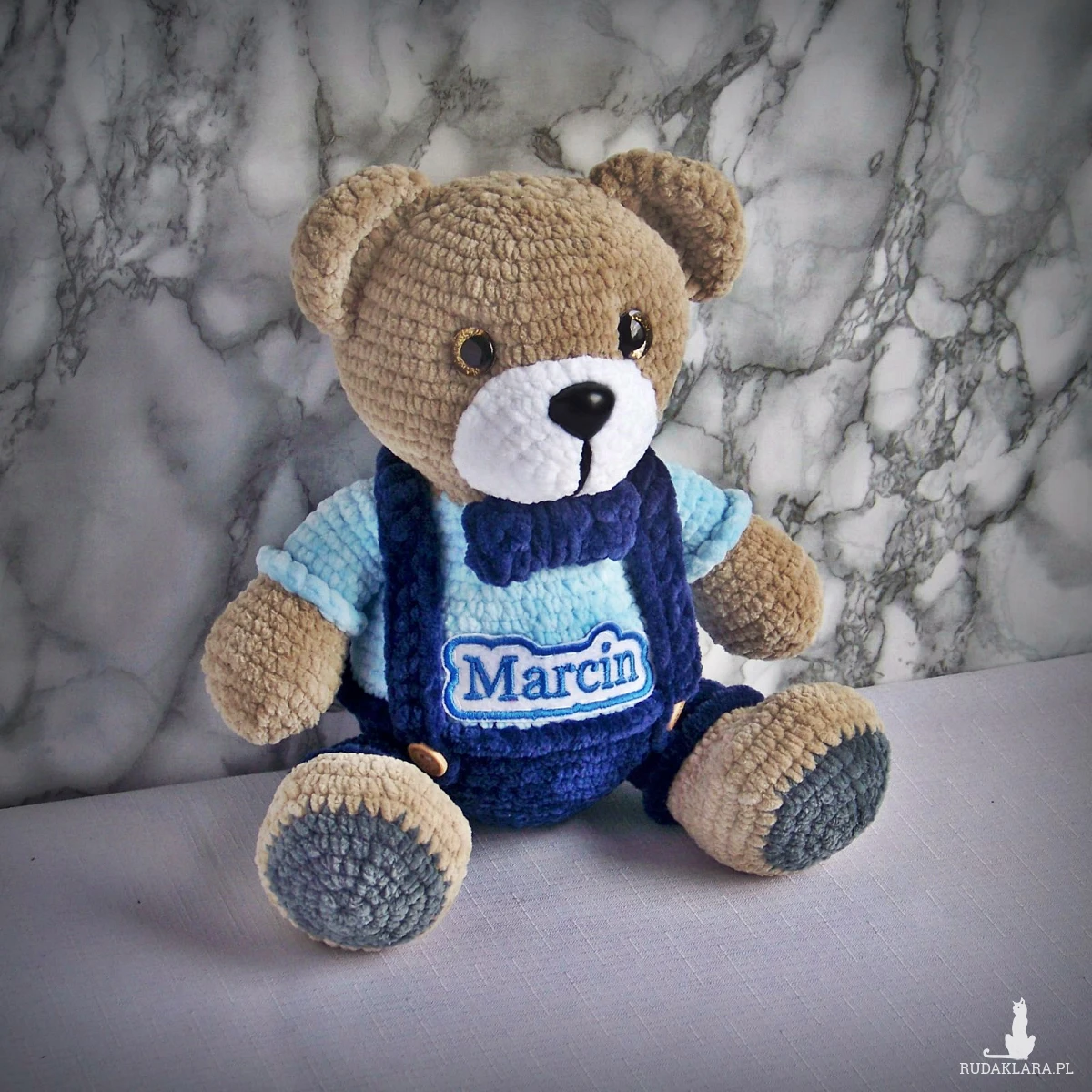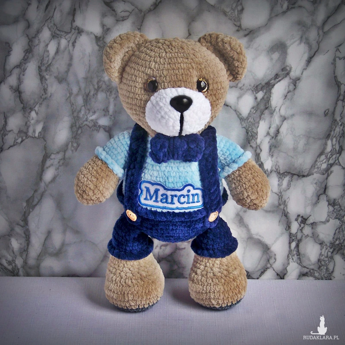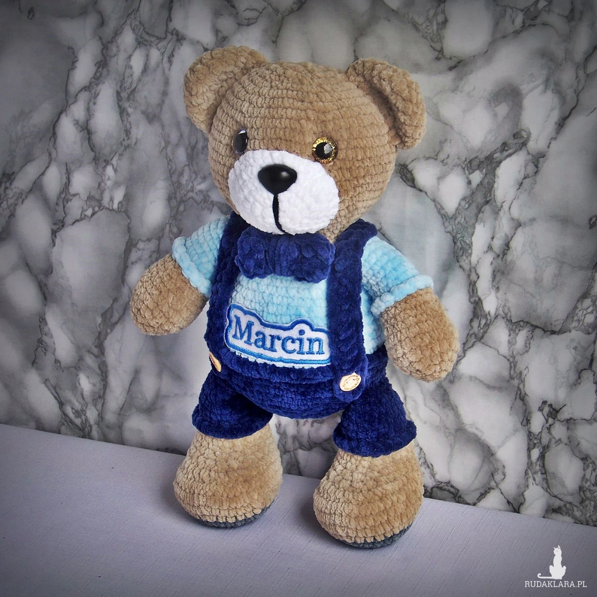 Szydełkowy miś Marcin 32cm w granatowych spodenkach (na zamówienie)