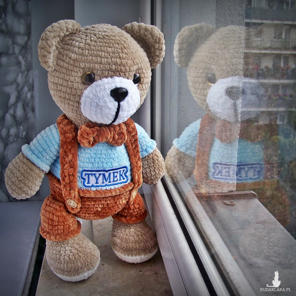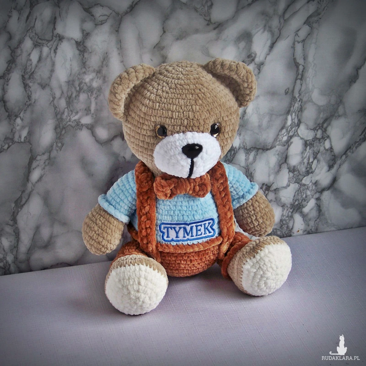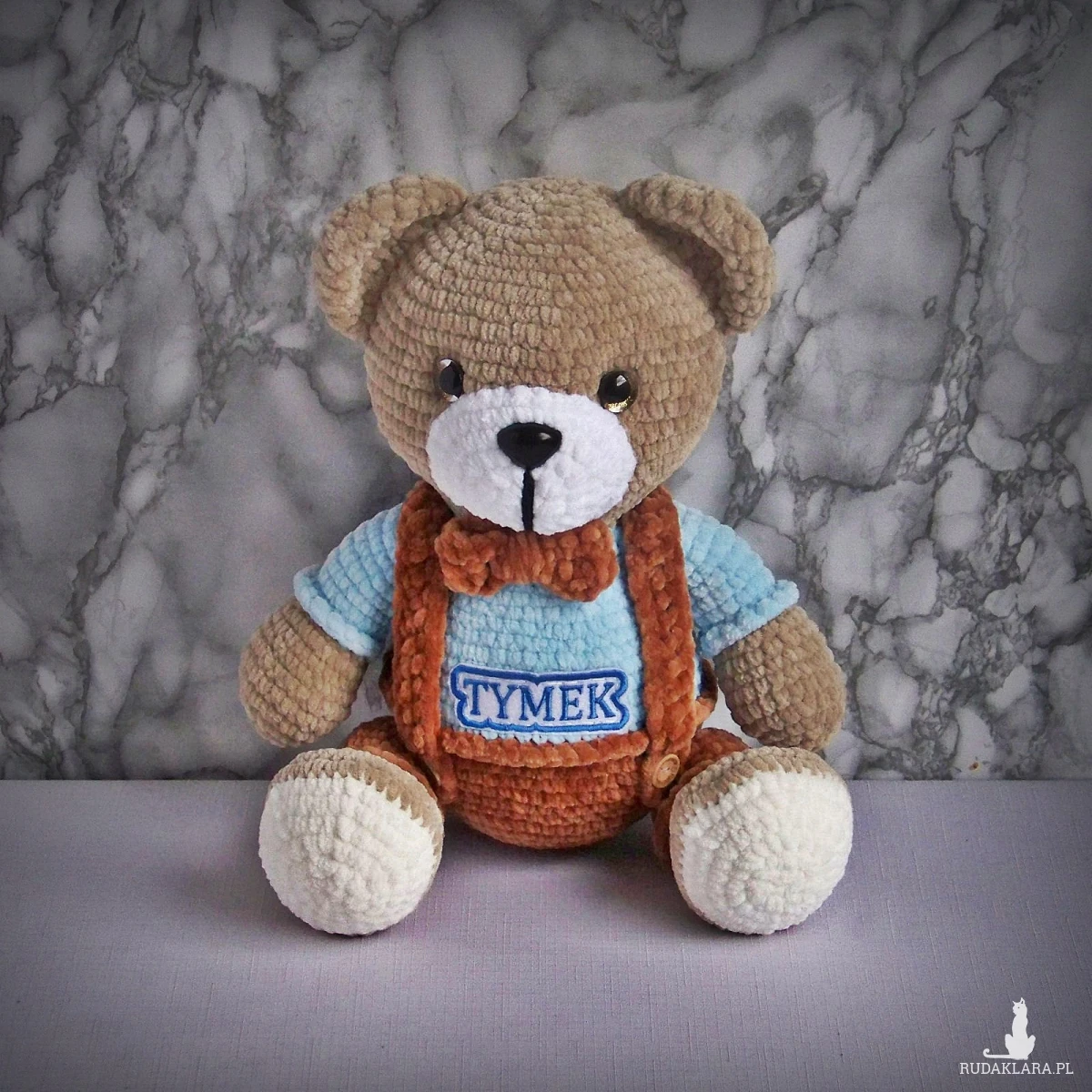 Szydełkowy miś Tymek 32cm w brązowych spodenkach (na zamówienie)