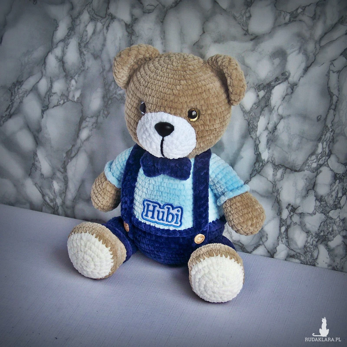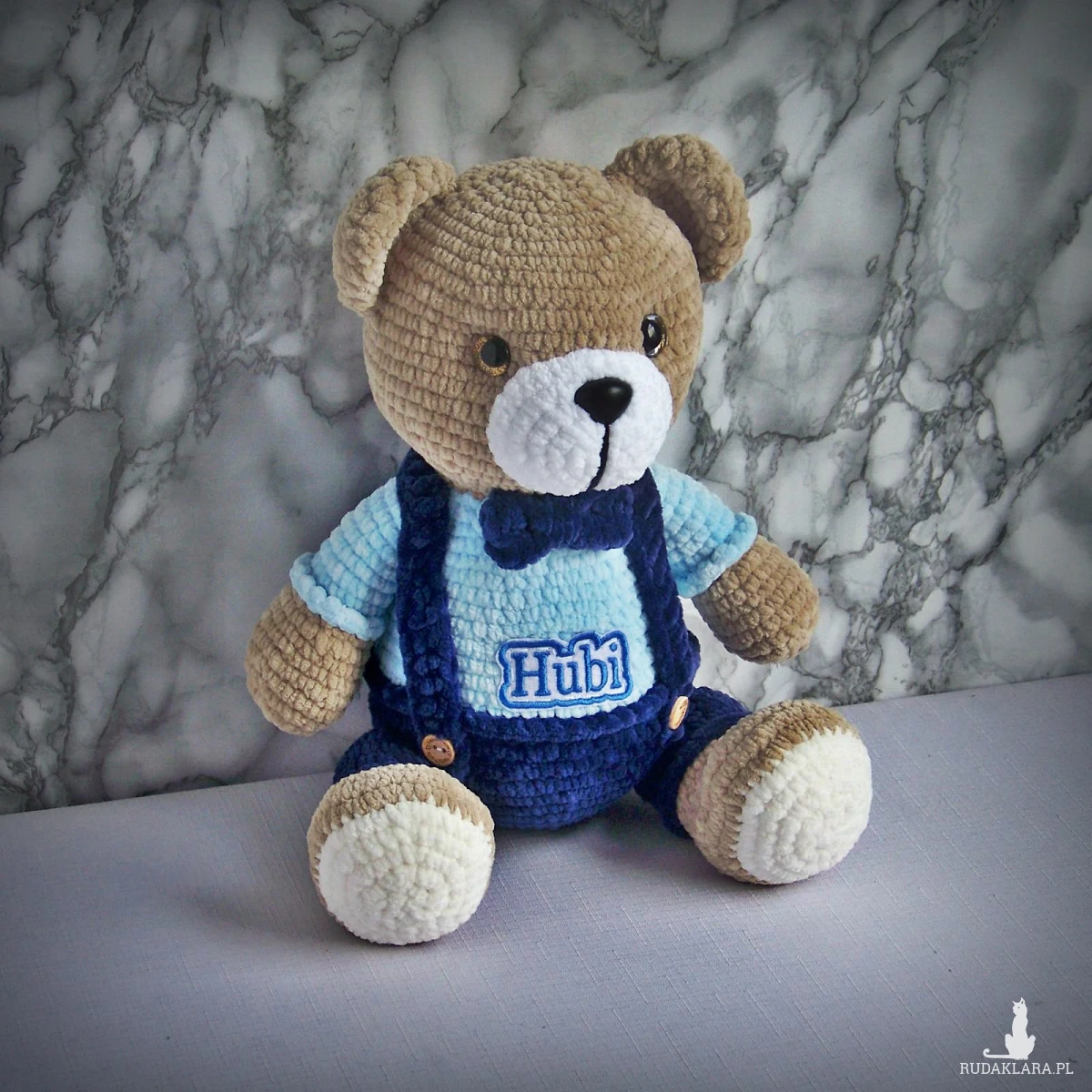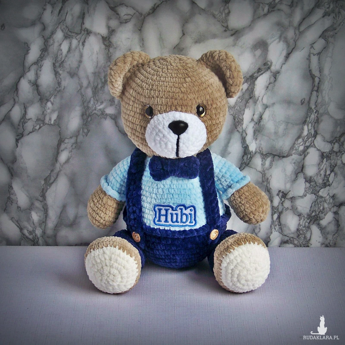 Szydełkowy miś Hubi 32cm w granatowych spodenkach (na zamówienie)