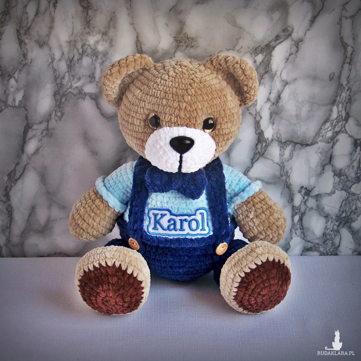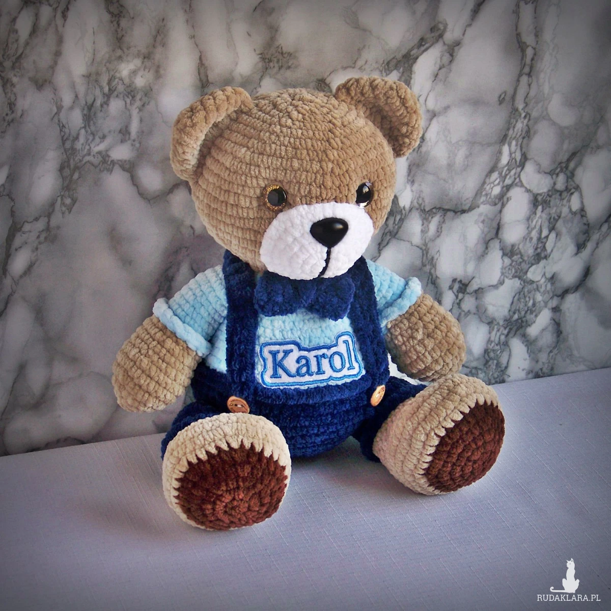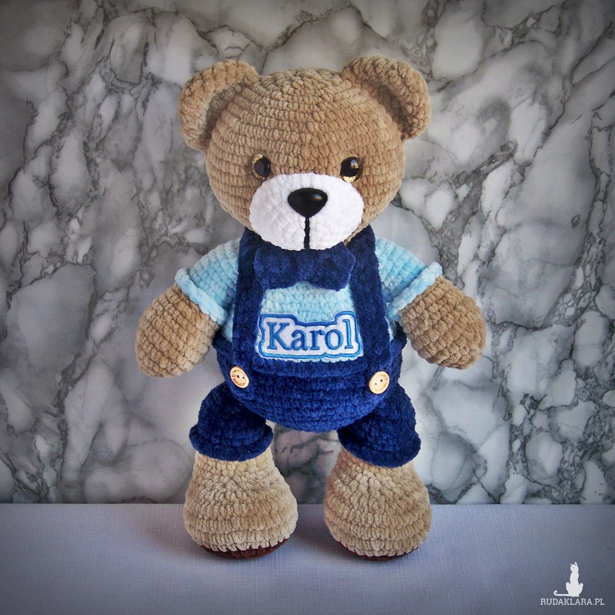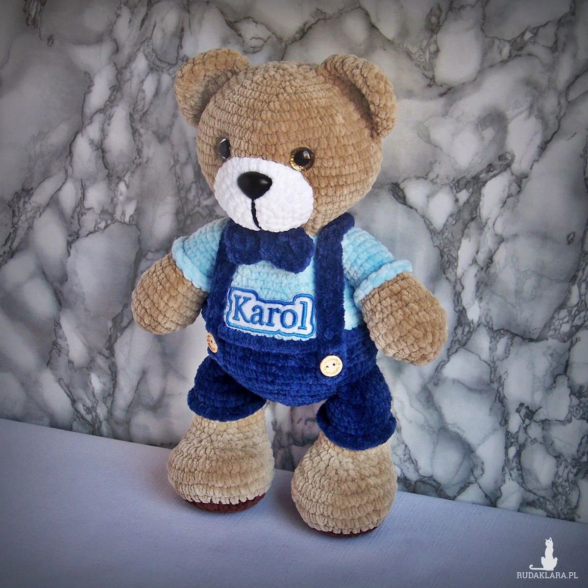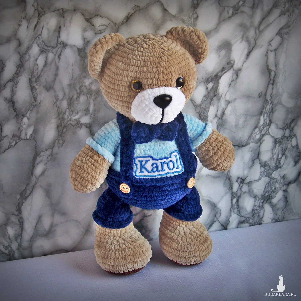 Szydełkowy miś Karol 32cm w granatowych spodenkach (na zamówienie)