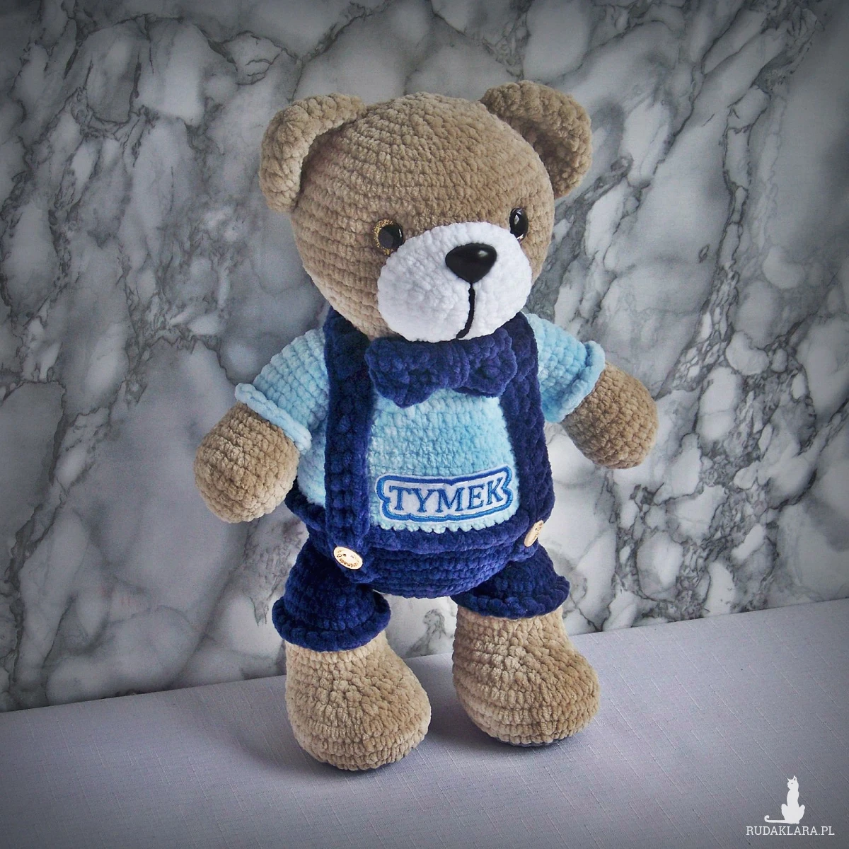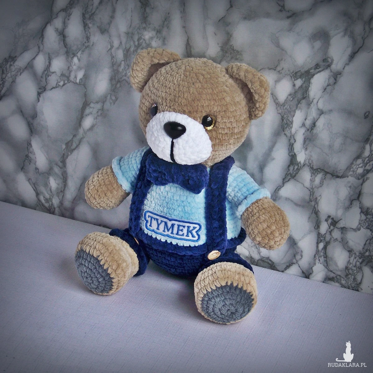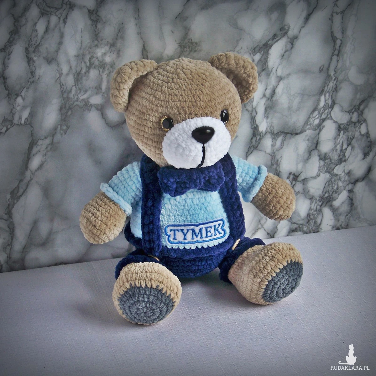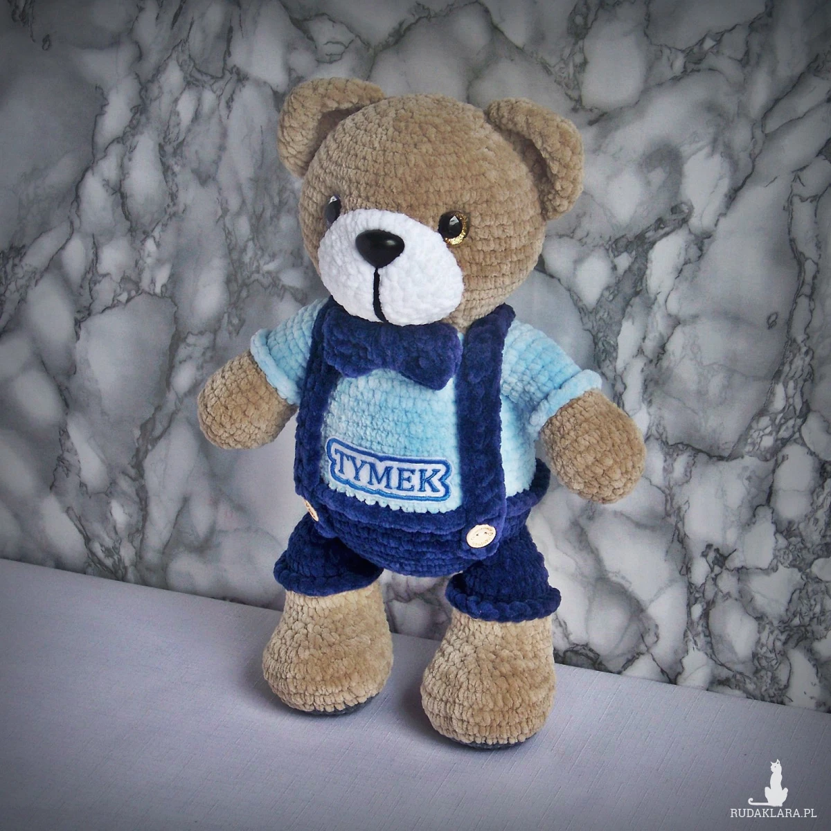 Szydełkowy miś Tymek 32cm w granatowych spodenkach (na zamówienie)