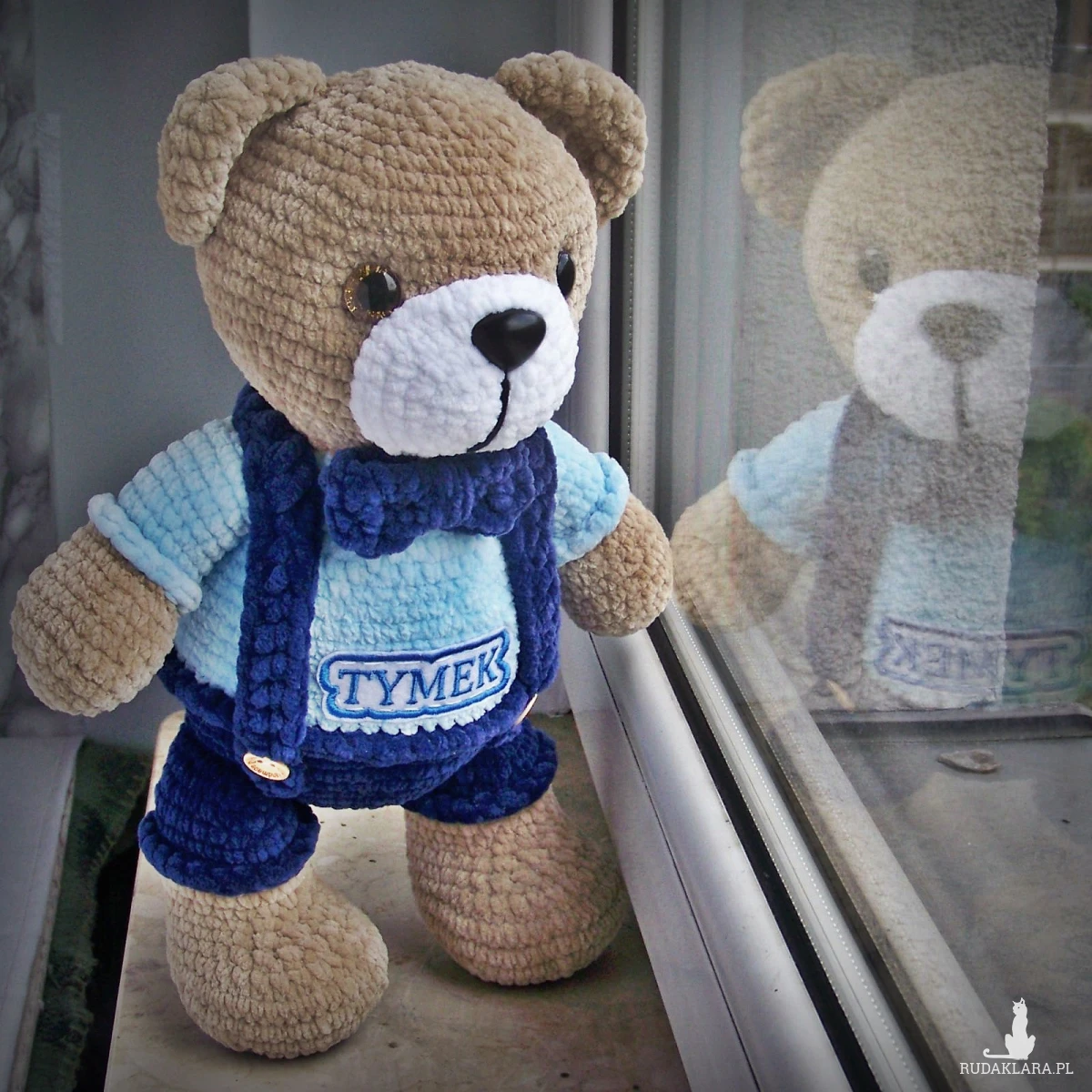 Miś jest zrobiony z bardzo delikatnej i miłej w dotyku włóczki, jest to certyfikowana włóczka antyalergiczna w 100% bezpieczna dla skóry. Nosek i oczka są trwale zaklipsowane, nie da się ich wyrwać. Imię na misiu będzie zrobione takie, jakie będzie potrzebowała osoba zamawiająca misia. Zamiast imienia może też być inny napis, nie może tylko on być zbyt długi. Miś może być misiem do przytulania, ale także może być misiem dekoracyjnym, który doda ciepła i uroku każdemu wnętrzu 😊 Wysokość misia to ok. 31-32 cm (na stojąco).