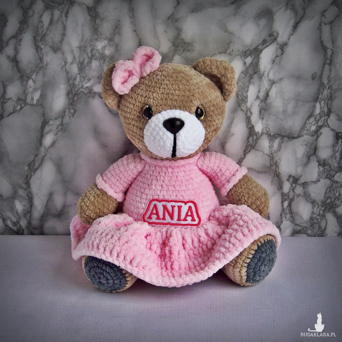 Szydełkowy miś Ania 32cm w jasnoróżowej sukience (na zamówienie)