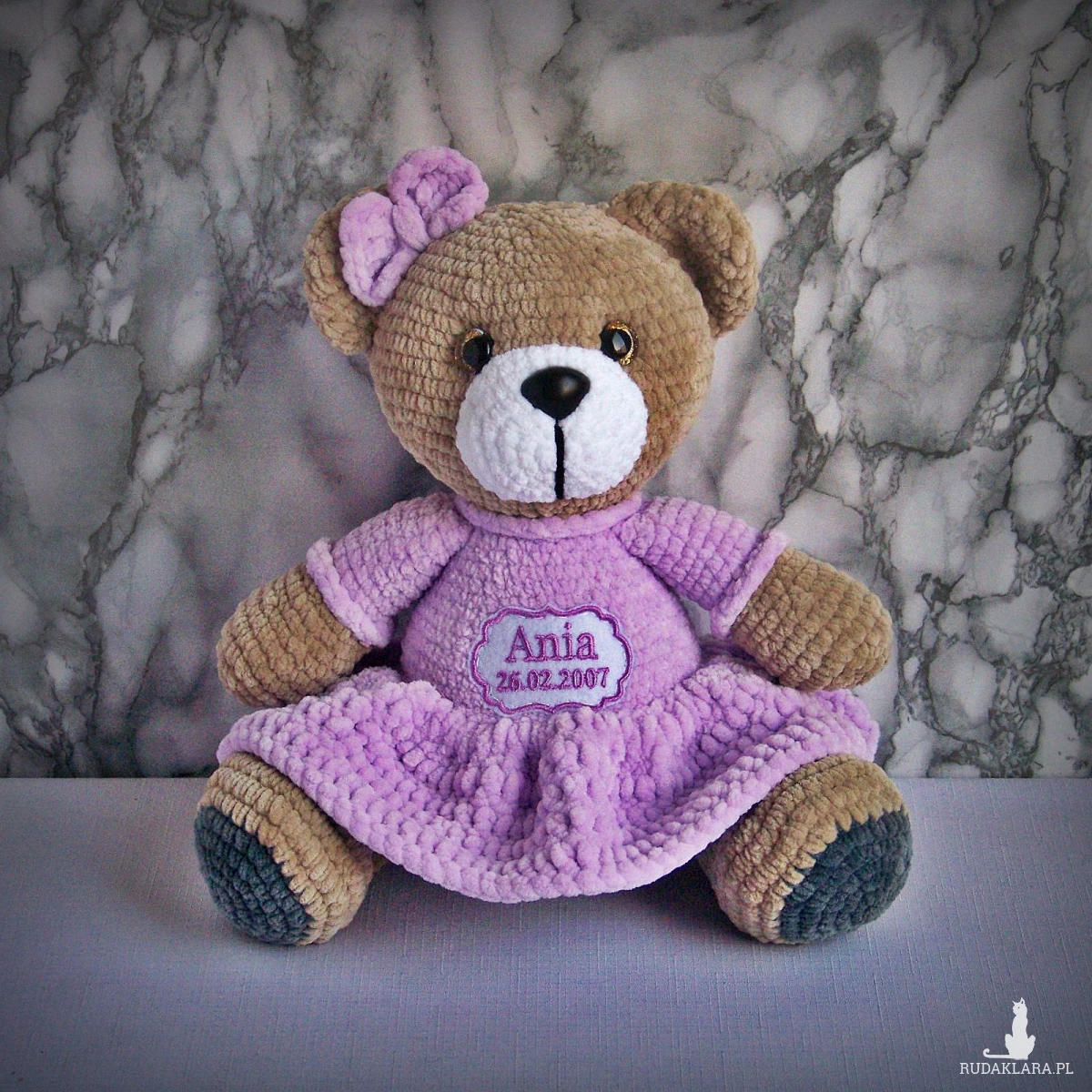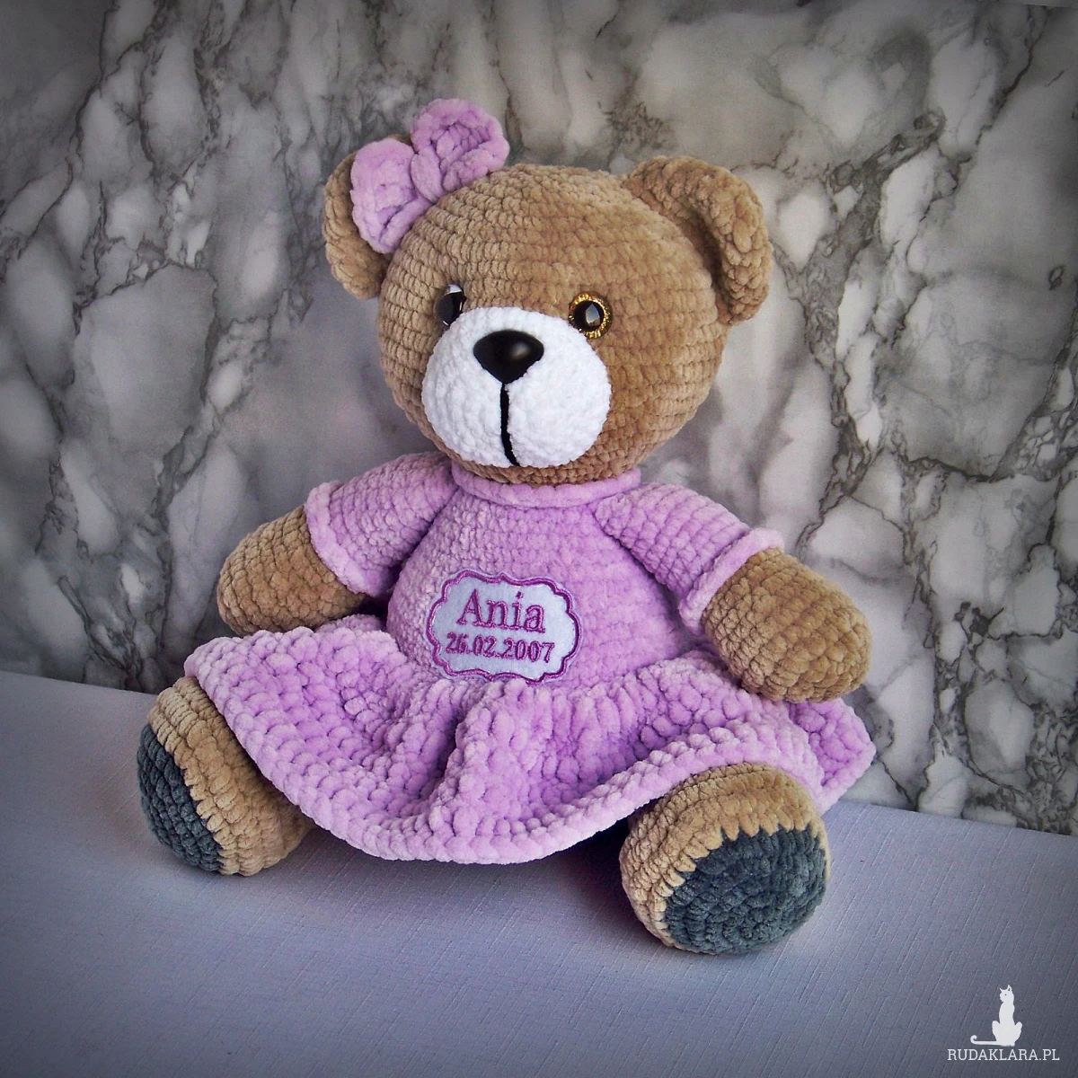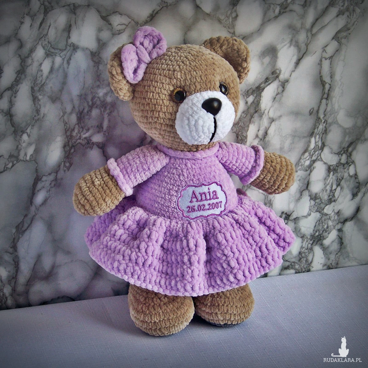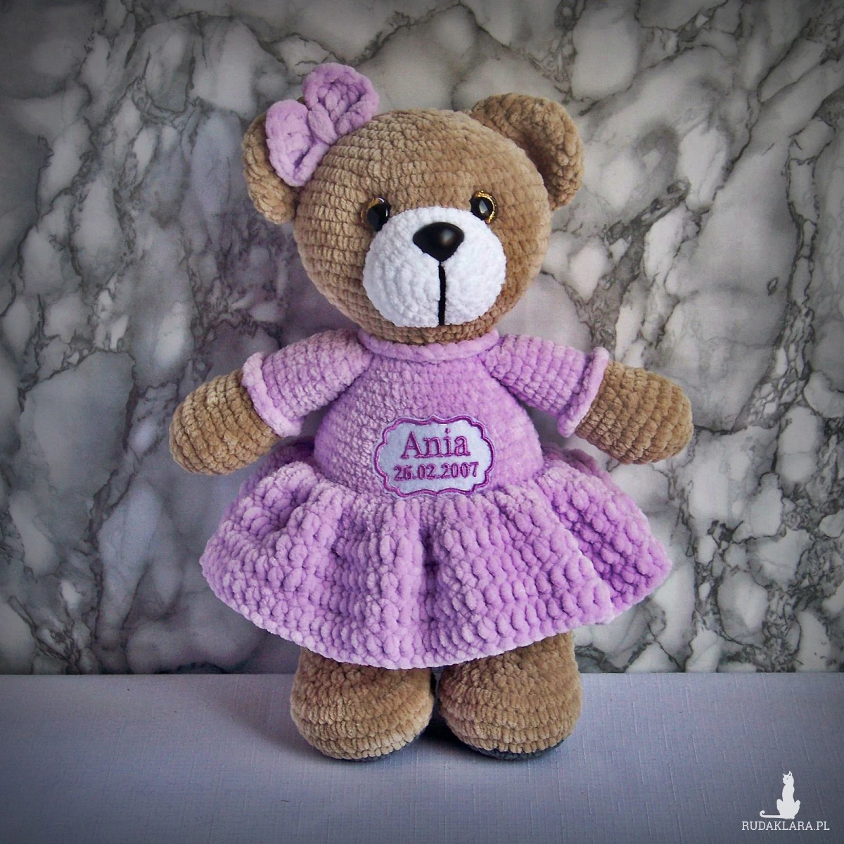 Szydełkowy miś Ania 32cm z datą urodzin w jasnofioletowej sukience (na zamówienie)