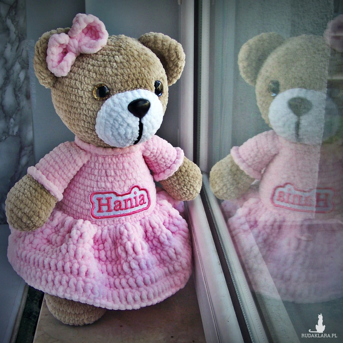 Szydełkowy miś Hania 32cm w jasnoróżowej sukience (na zamówienie)