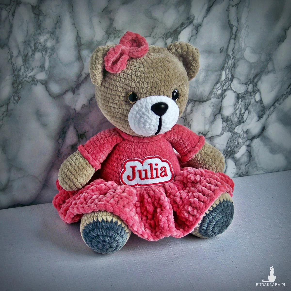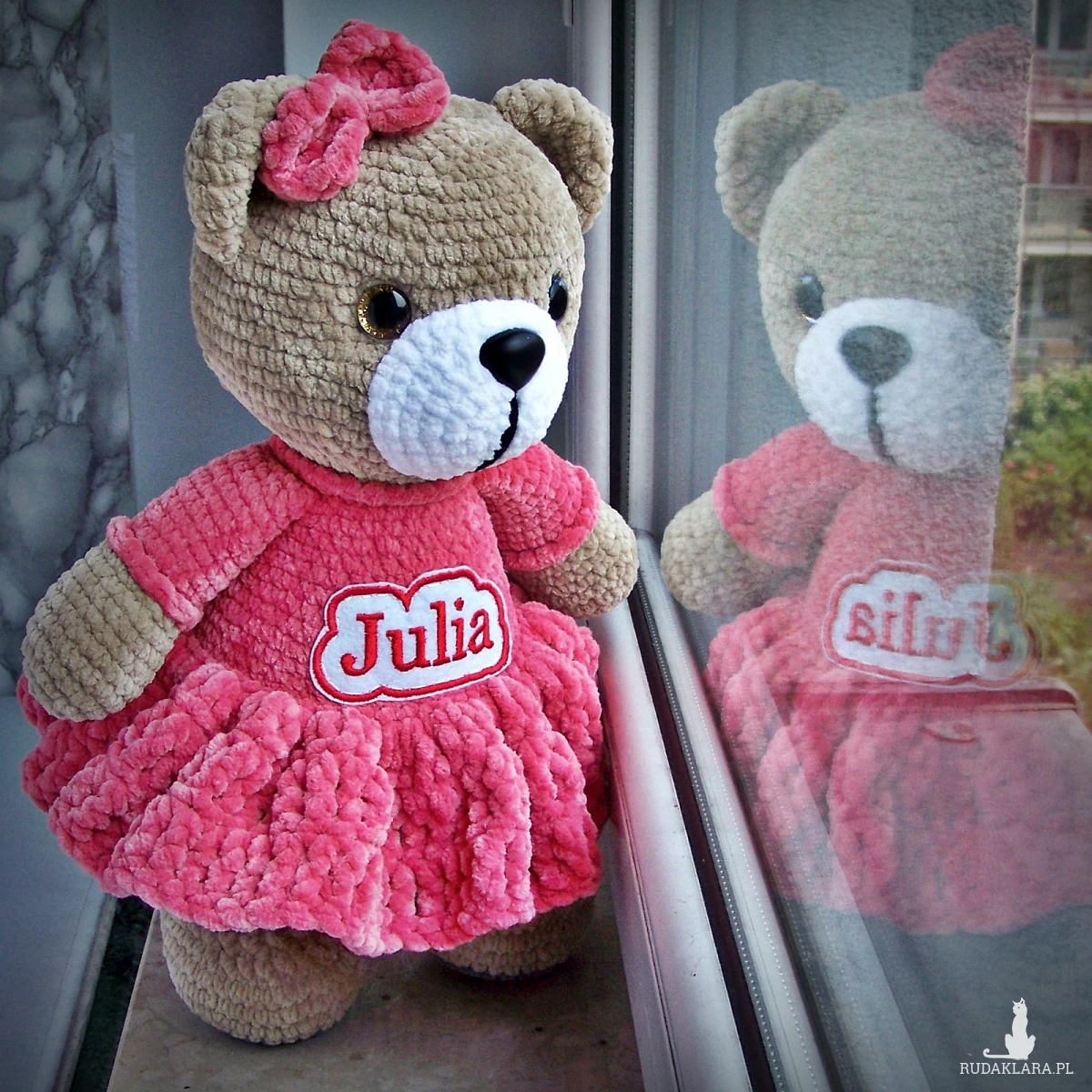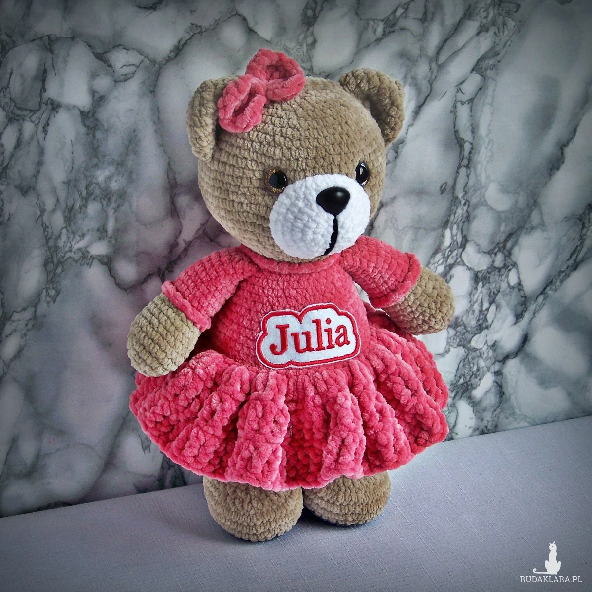 Szydełkowy miś Julia 32cm w amarantowej sukience (na zamówienie)