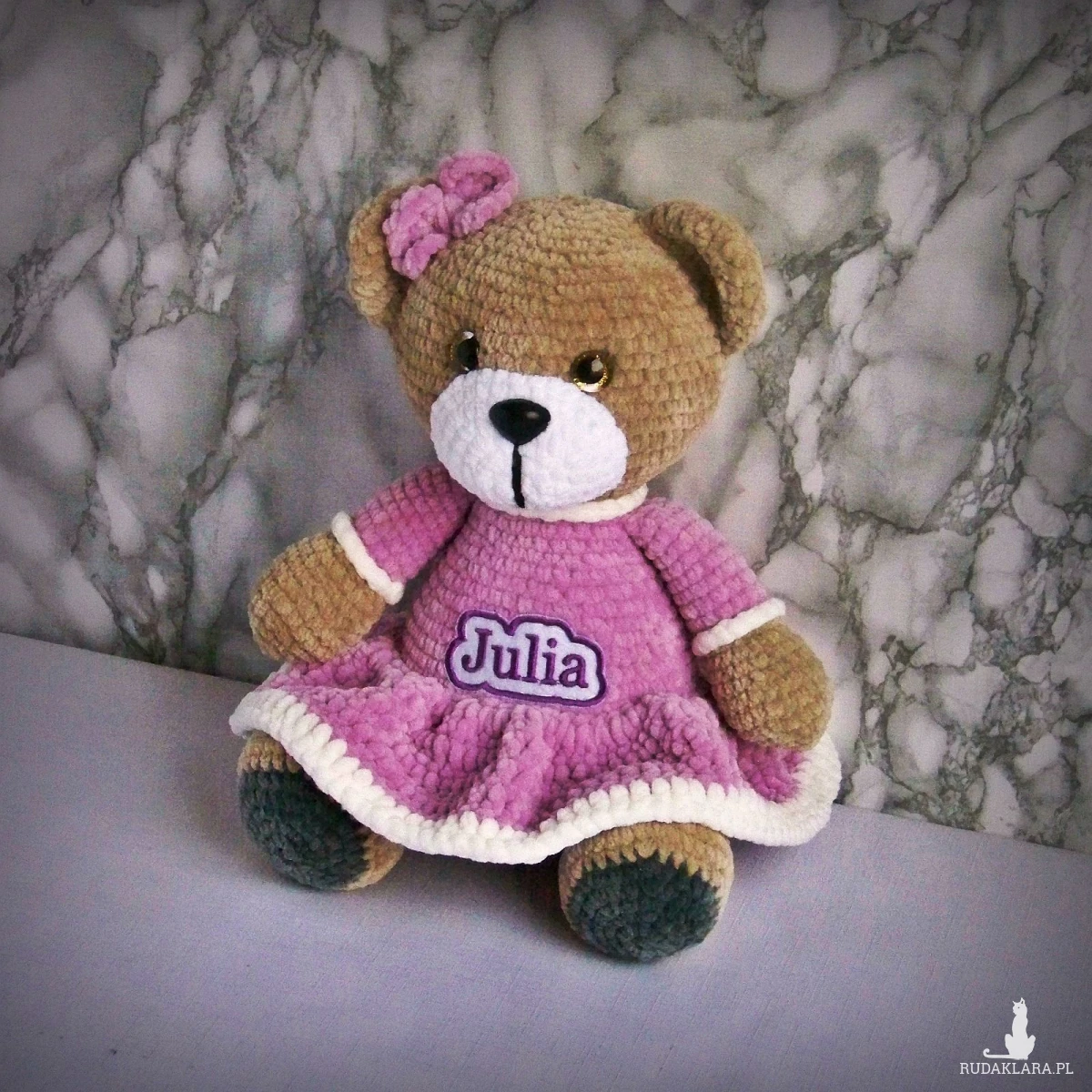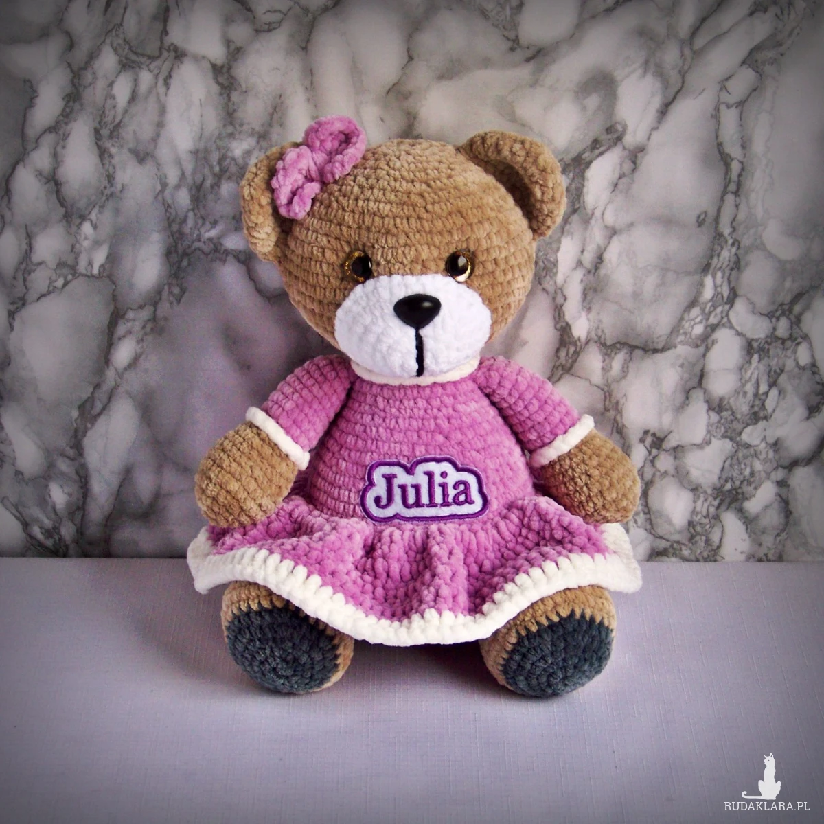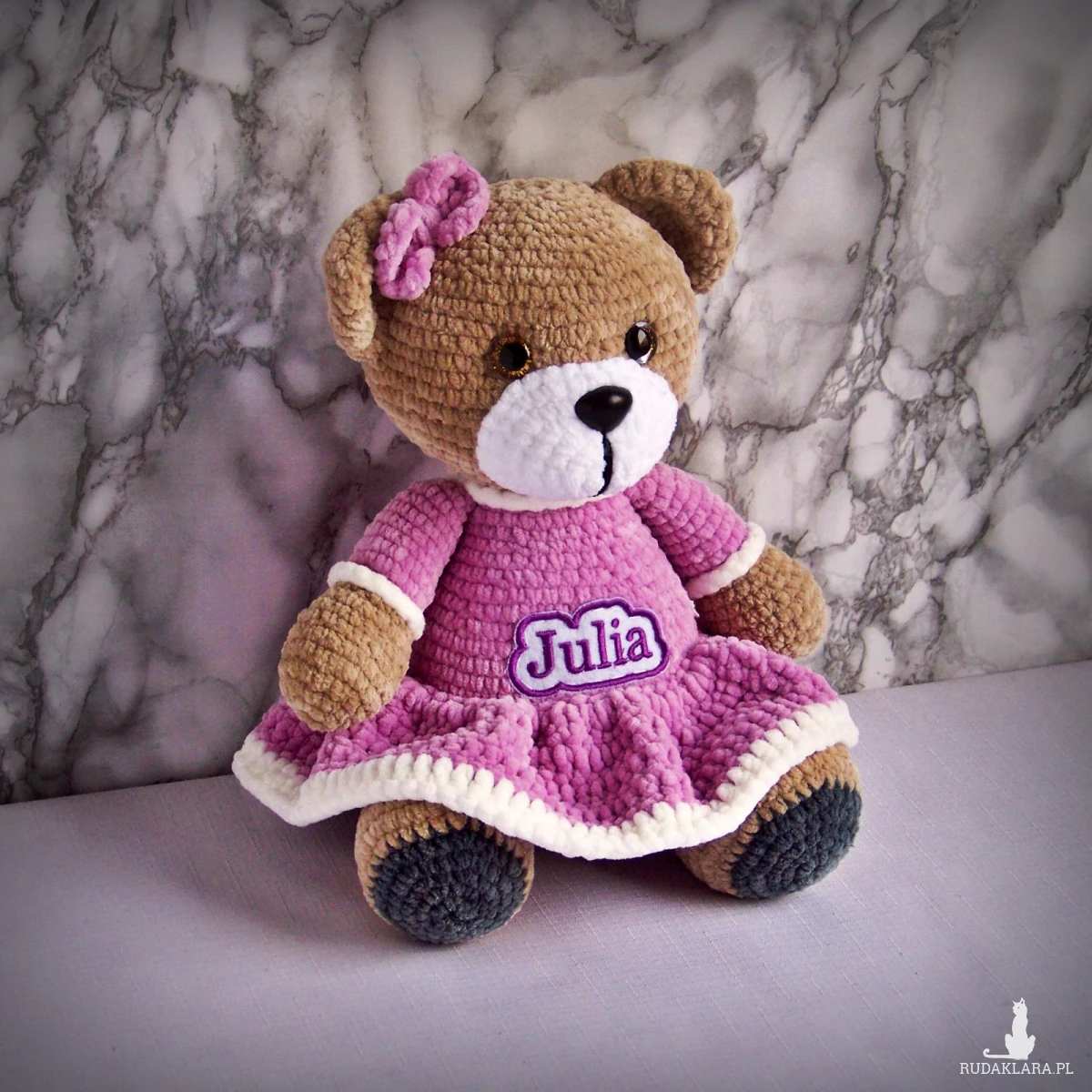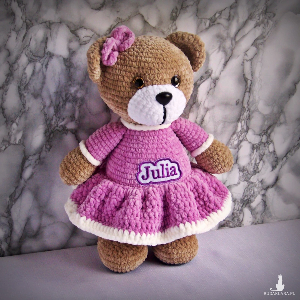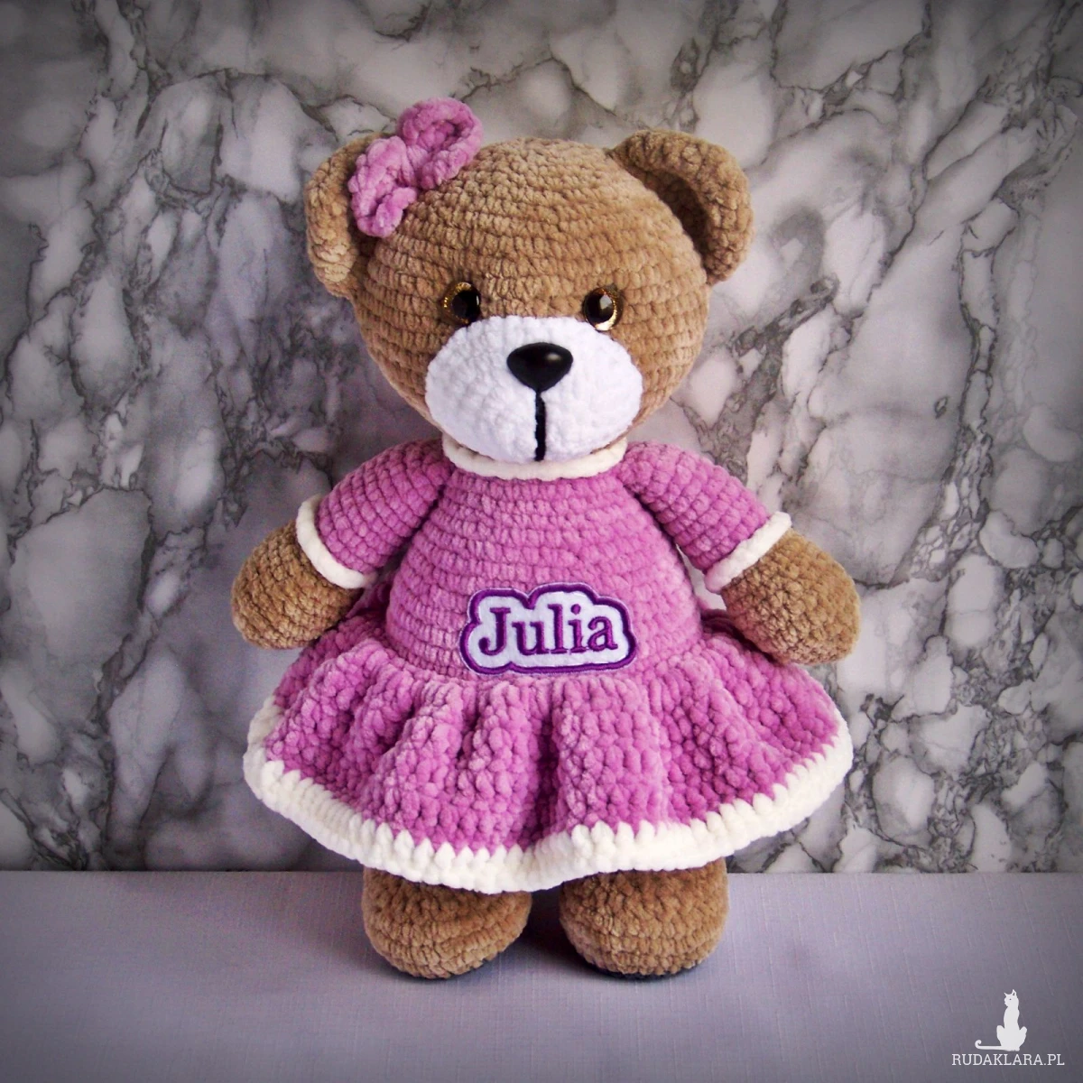 Szydełkowy miś Julia 32cm we wrzosowej sukience (na zamówienie)