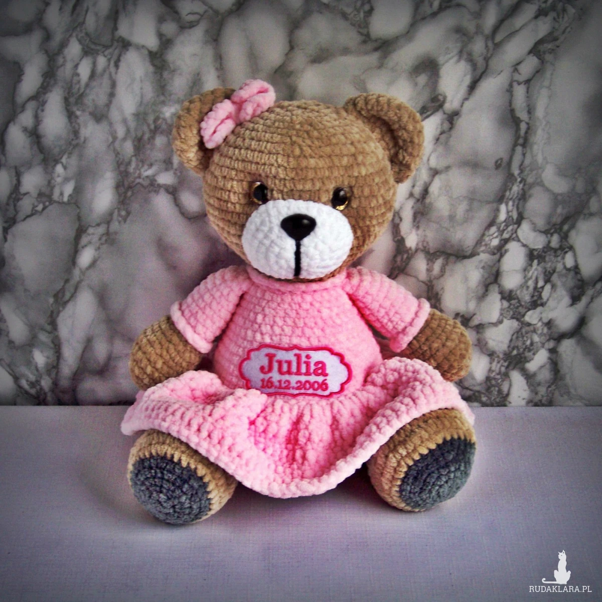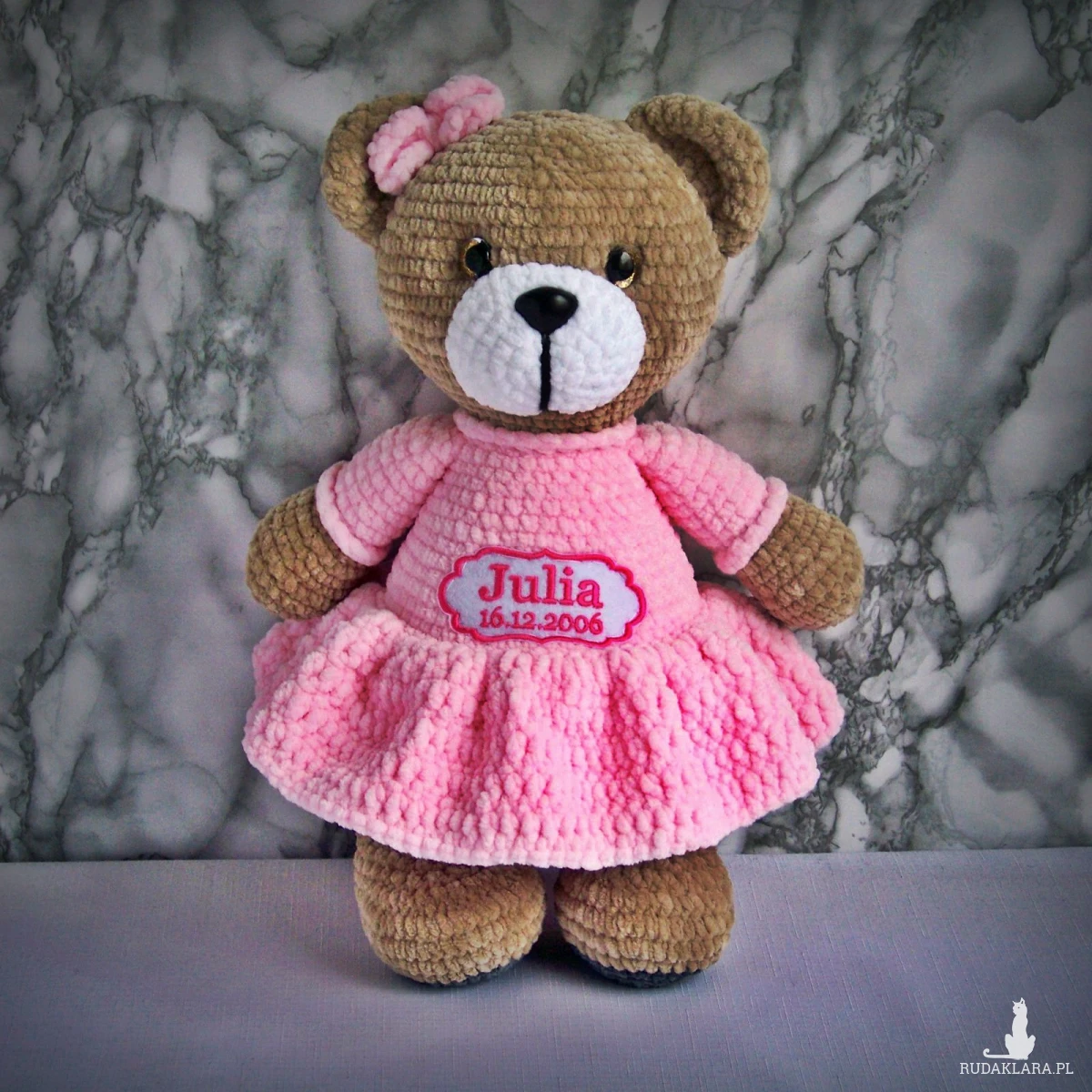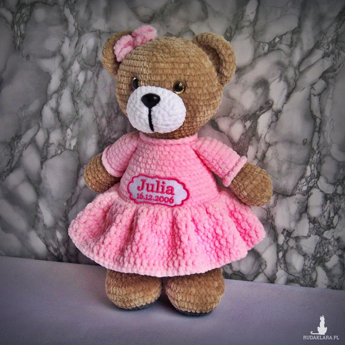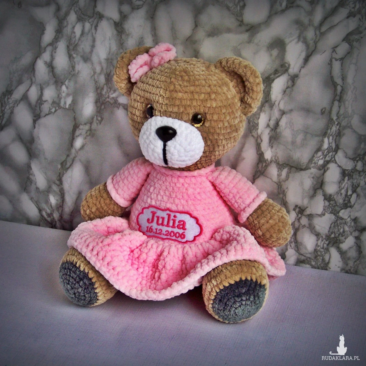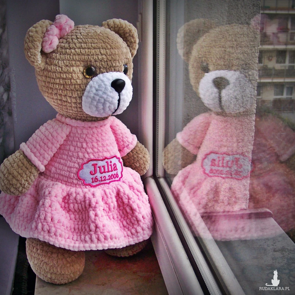 Szydełkowy miś Julia 32cm z datą urodzin w jasnoróżowej sukience (na zamówienie)