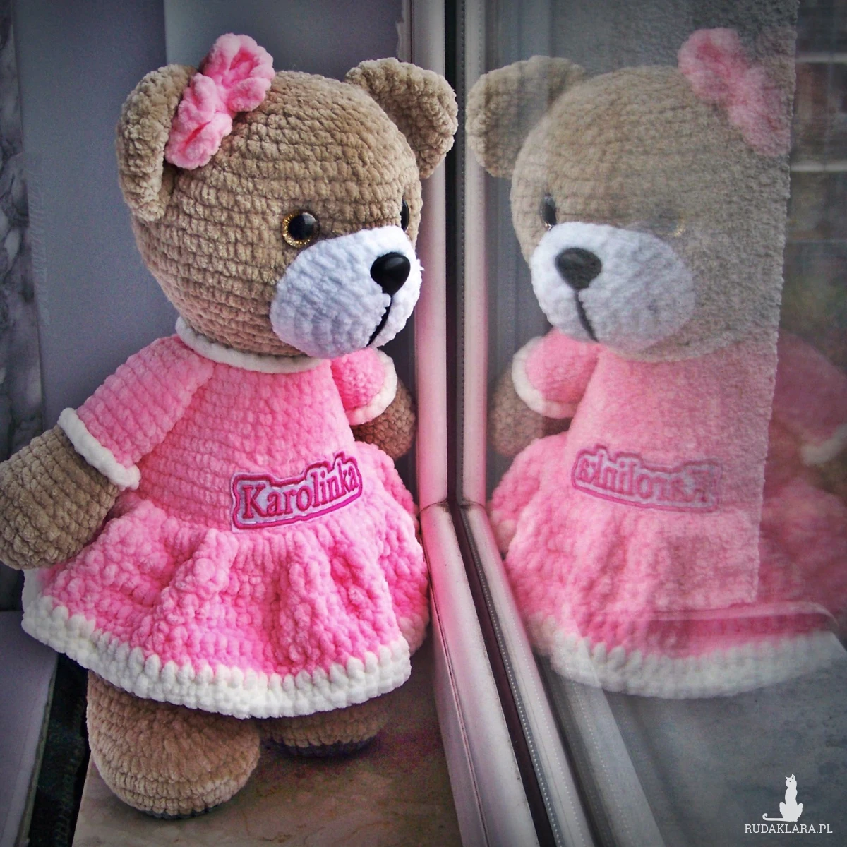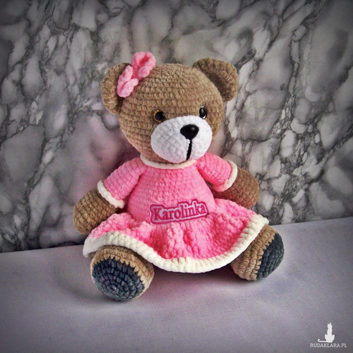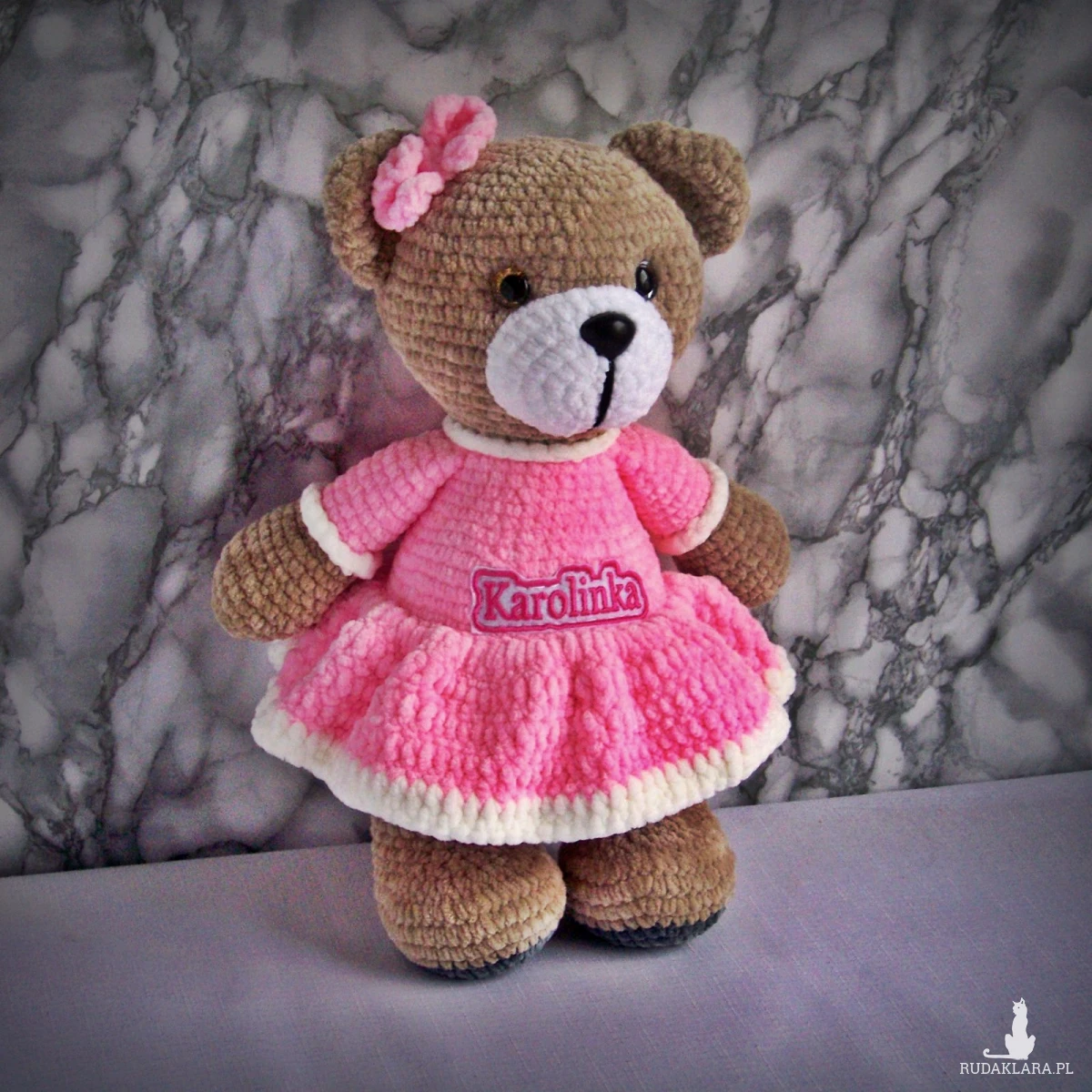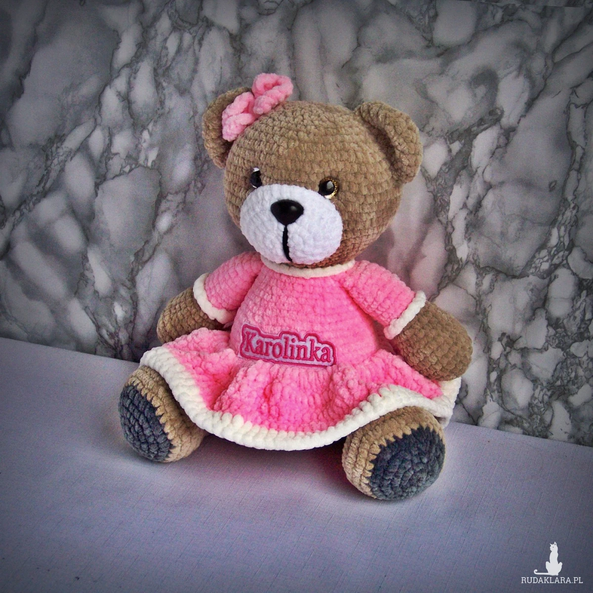 Szydełkowy miś Karolinka 32cm w różowej sukience (na zamówienie)
