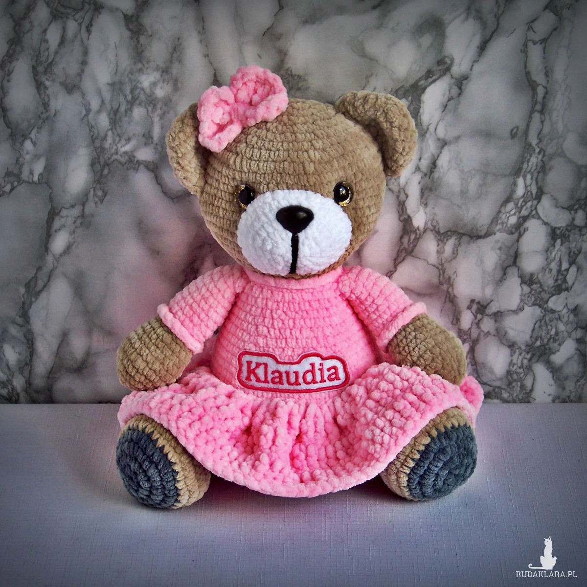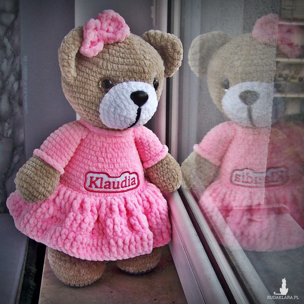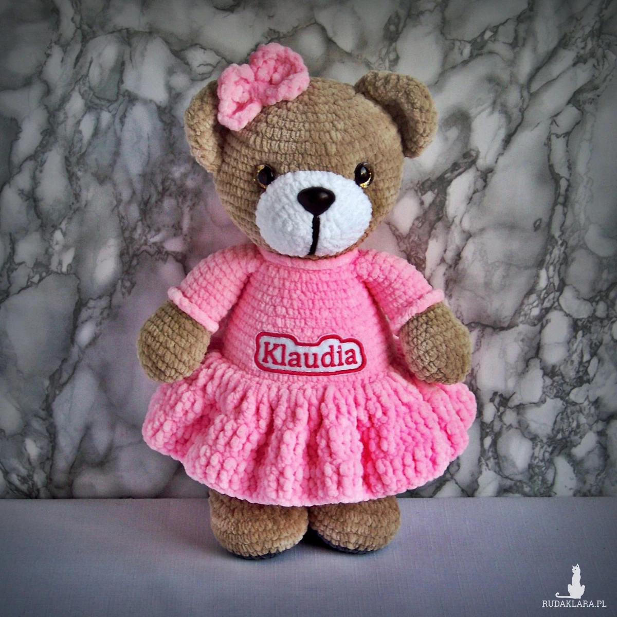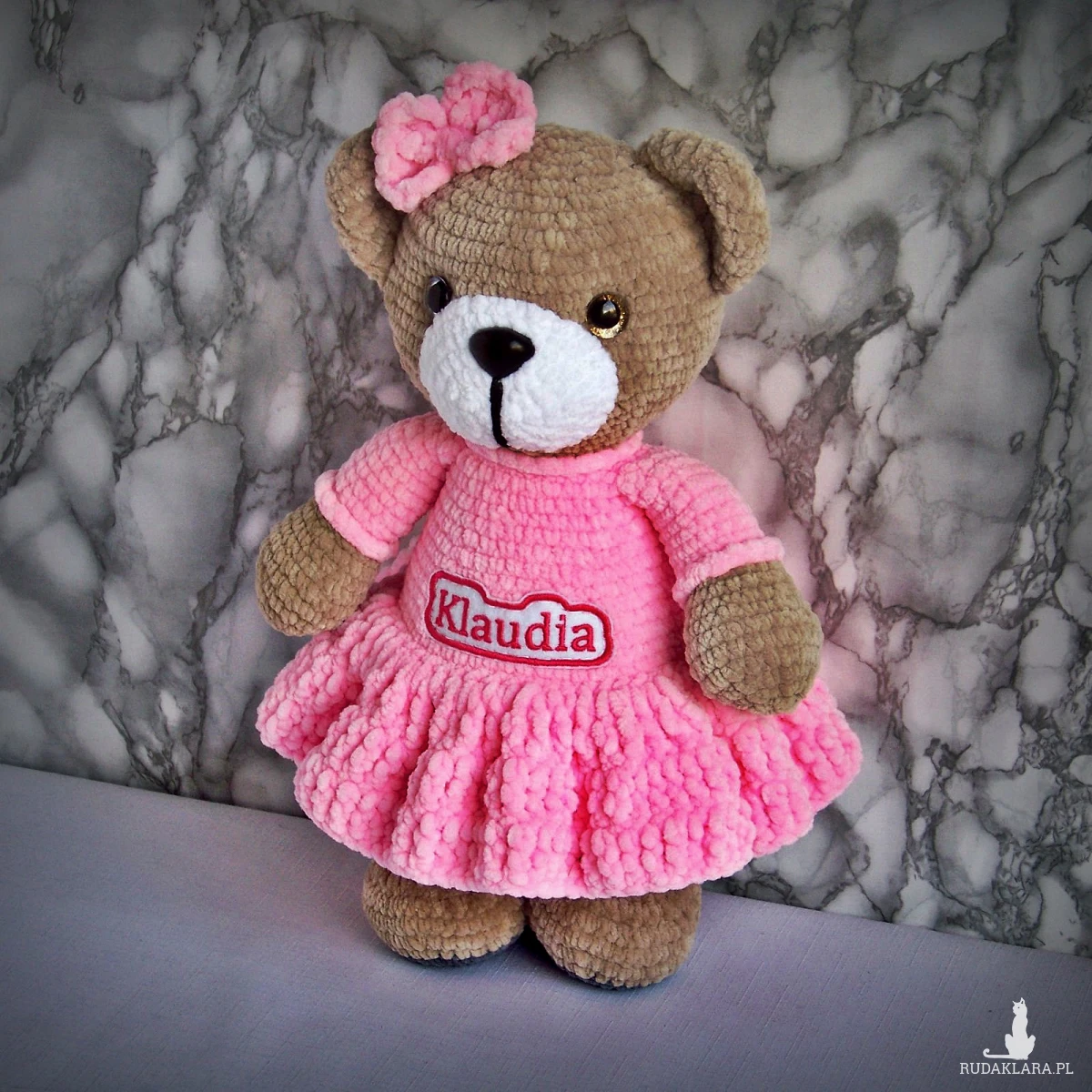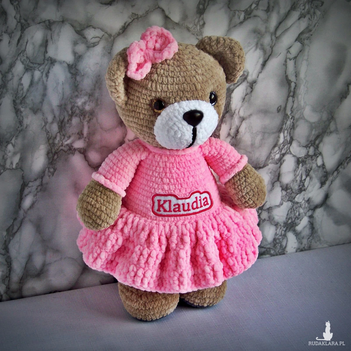 Szydełkowy miś Klaudia 32cm w różowej sukience (na zamówienie)
