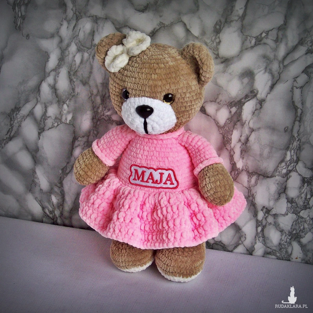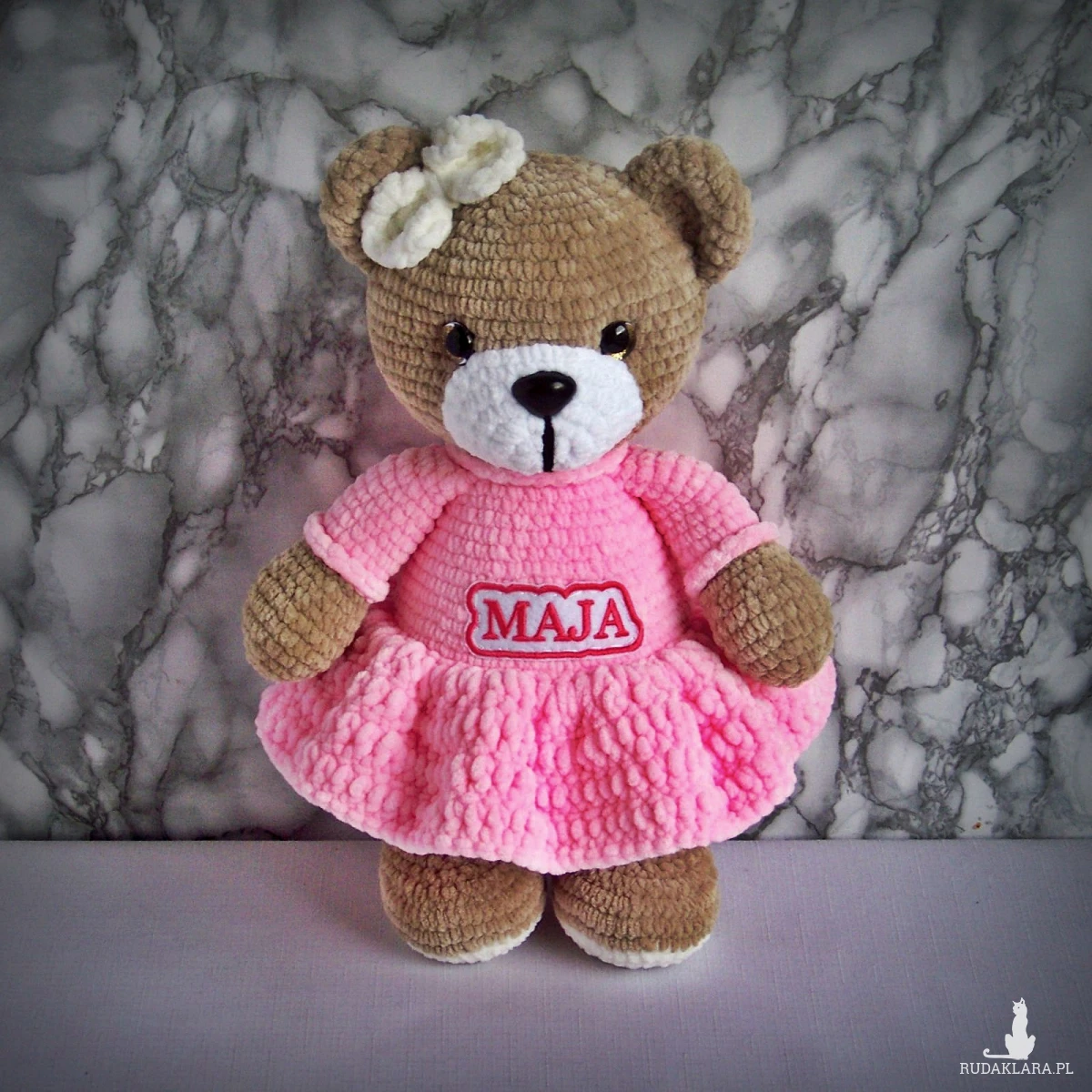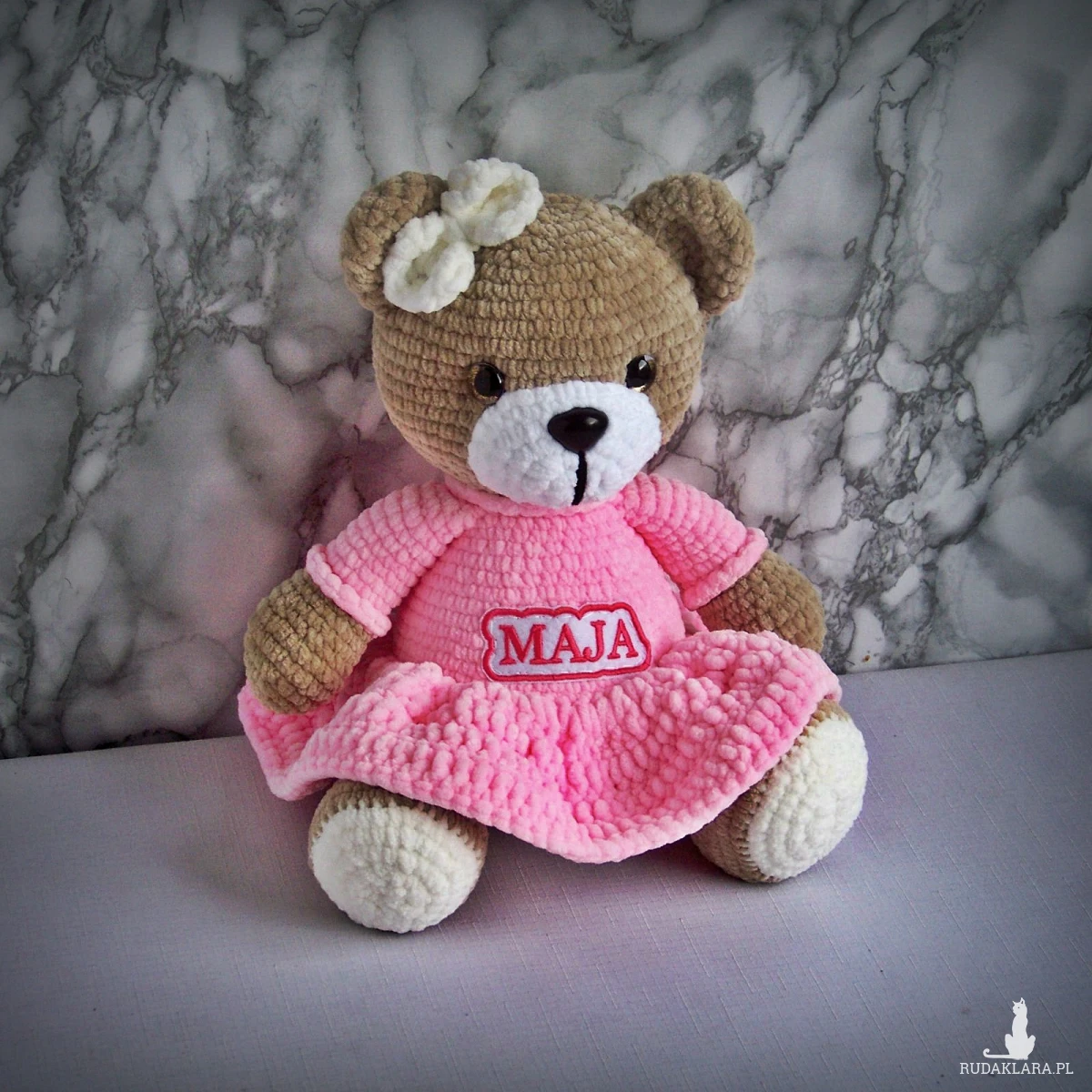 Szydełkowy miś Maja 32cm w różowej sukience (na zamówienie)