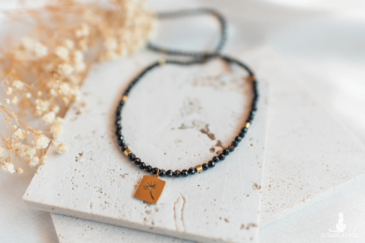Naszyjnik wykonany na lince stalowej, przekładki z hematytu, zapięcie i zawieszka ze stali chirurgicznej.