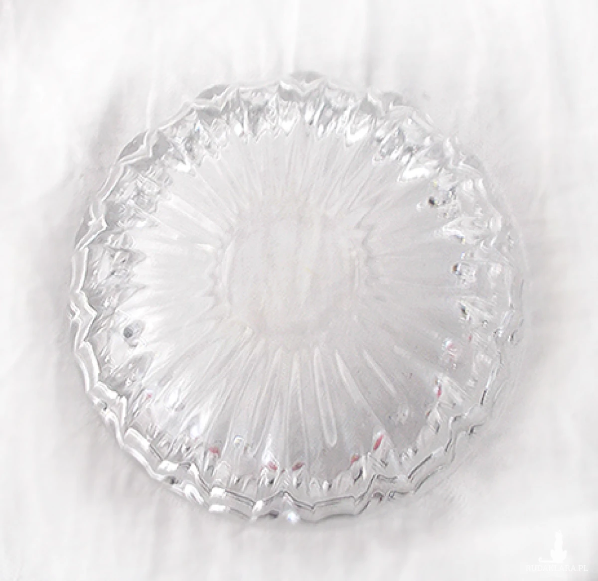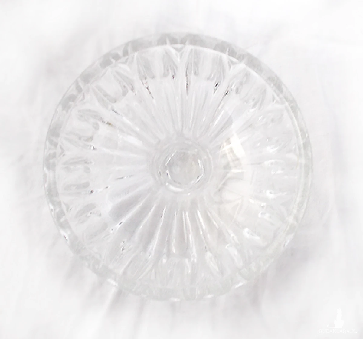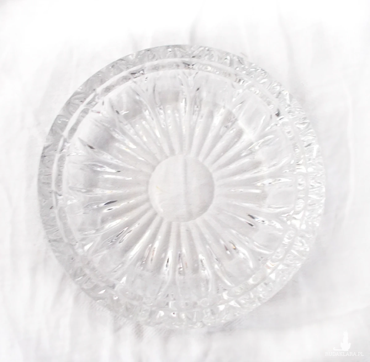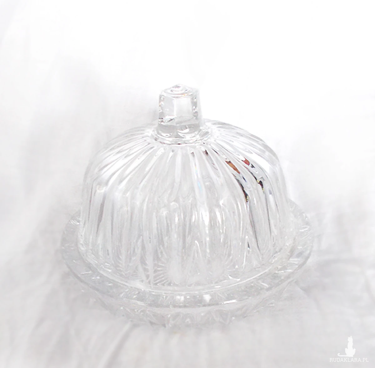 Vintage, szklana maselniczka lub bomboniera, oryginalne naczynie z czasów PRL, lata 80 XX w. Maselniczka jest całkiem nowa, nie była używana. Grube, przezroczyste szkło prasowane, wzór w prążki. Wymiary: szerokość 13,8 cm, wysokość 11 cm.